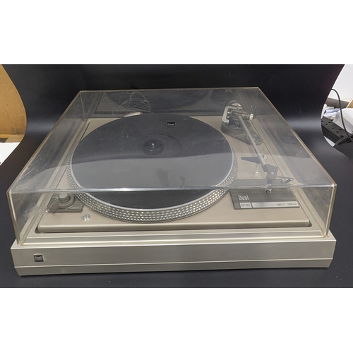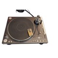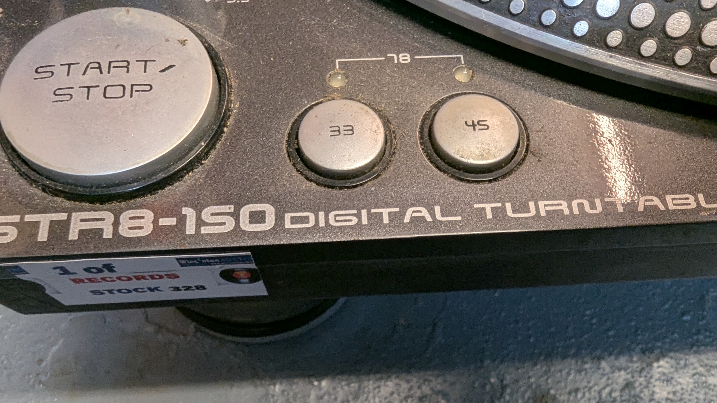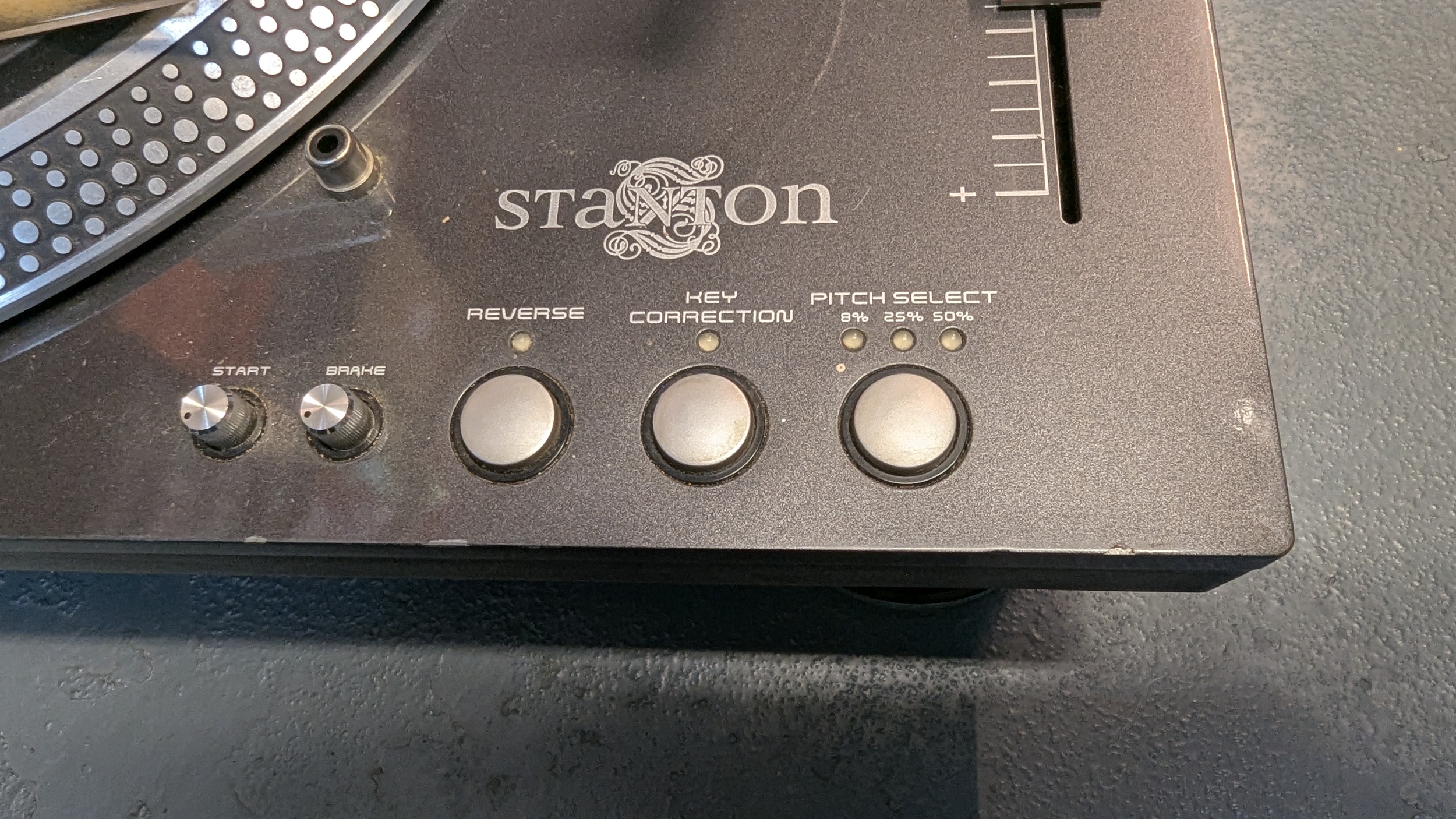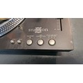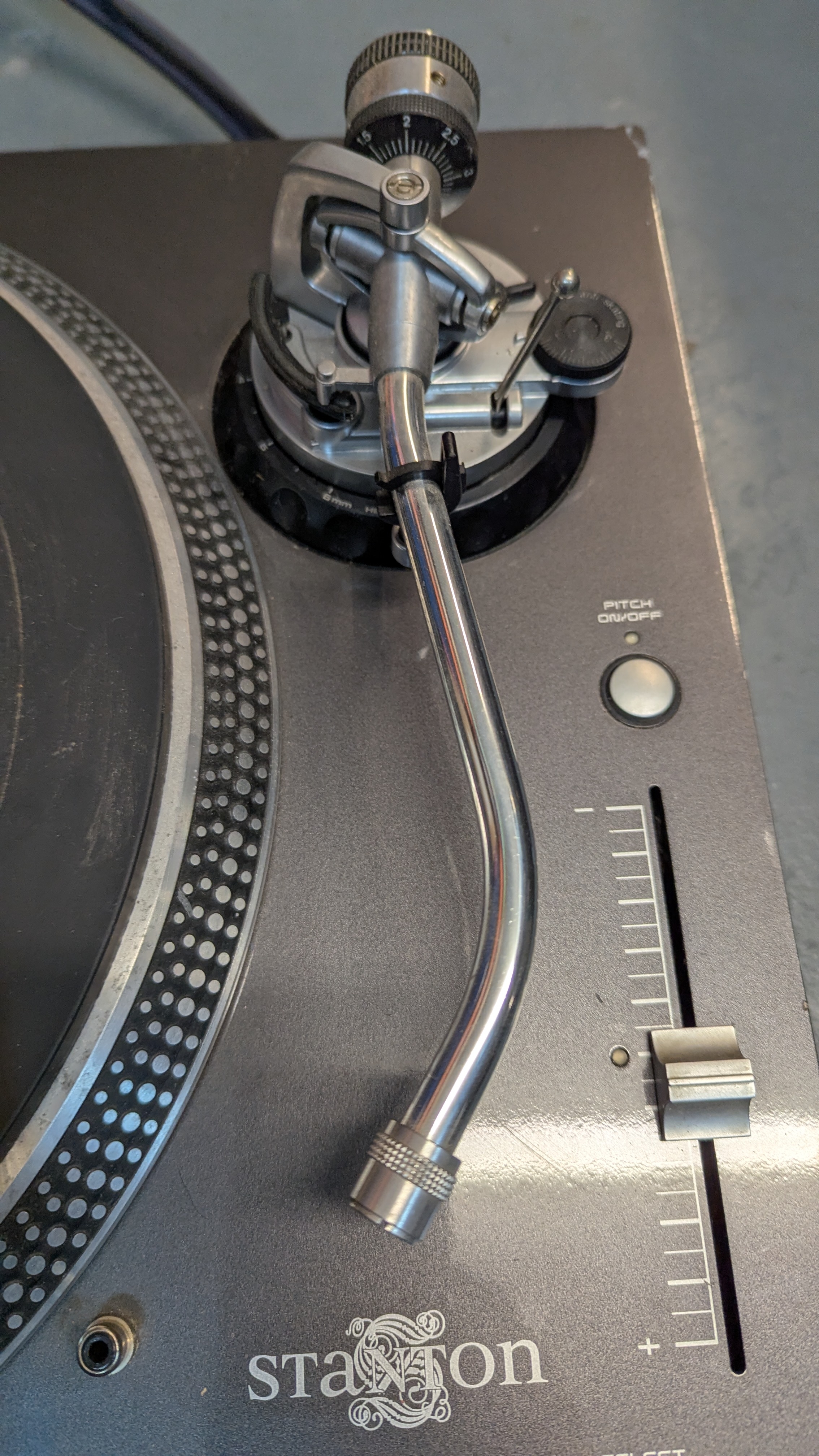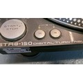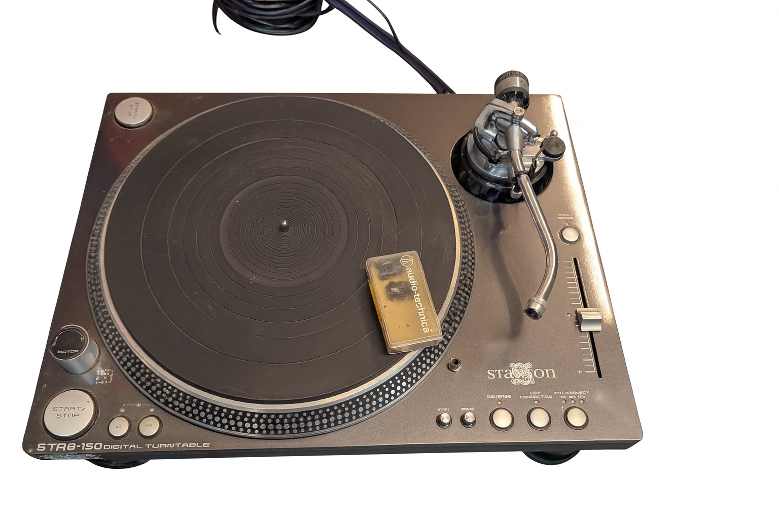 A Stanton STR8-150 (or STR8-150 Mk1) high-torque direct-drive DJ turntable. Designed for professional use, featuring a straight tone-arm, adjustable start/brake speeds, multi-speed (33/45/78 rpm), and pitch control ranges of ±8 %, ±25 % and ±50 %. The unit shows visible wear including surface scratches, dust, and signs of use; the cartridge (in branded Audio-Technica case) is included but untested. Sold as-seen for parts or restoration, with no guarantee of full operation.