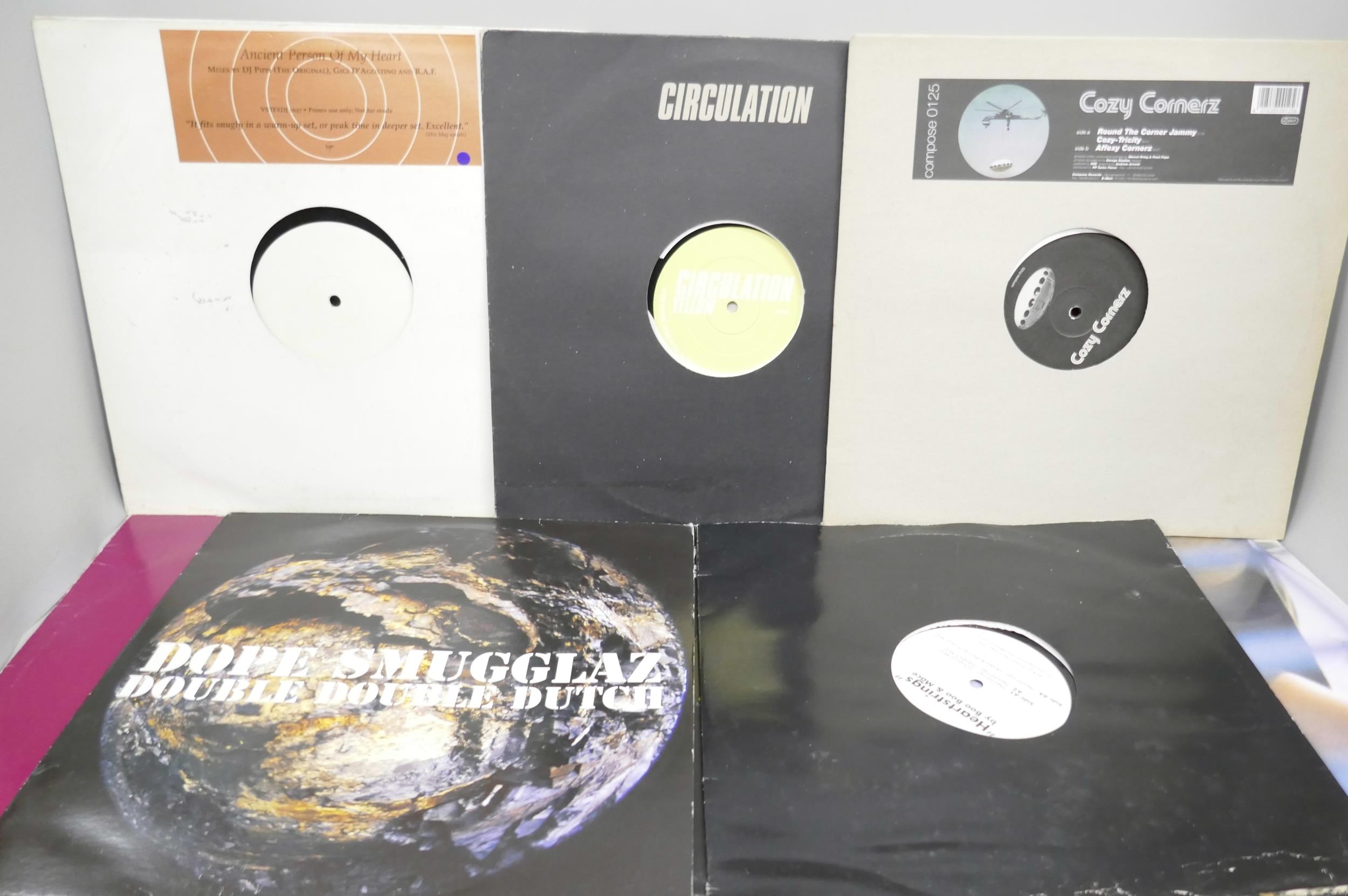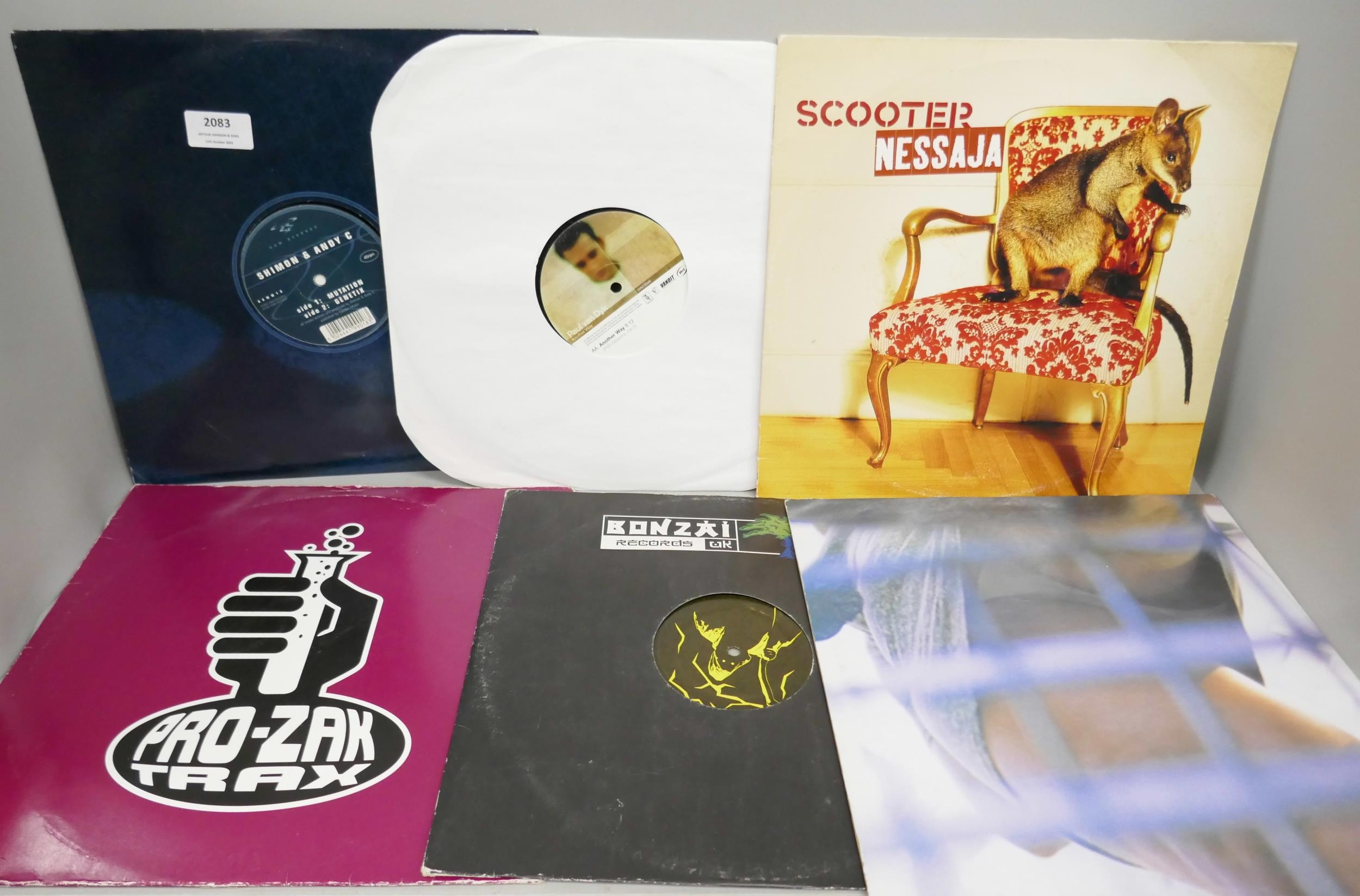 A collection of house and electronic LP records including Shimon & Andy C, Scooter, Circulation, etc.