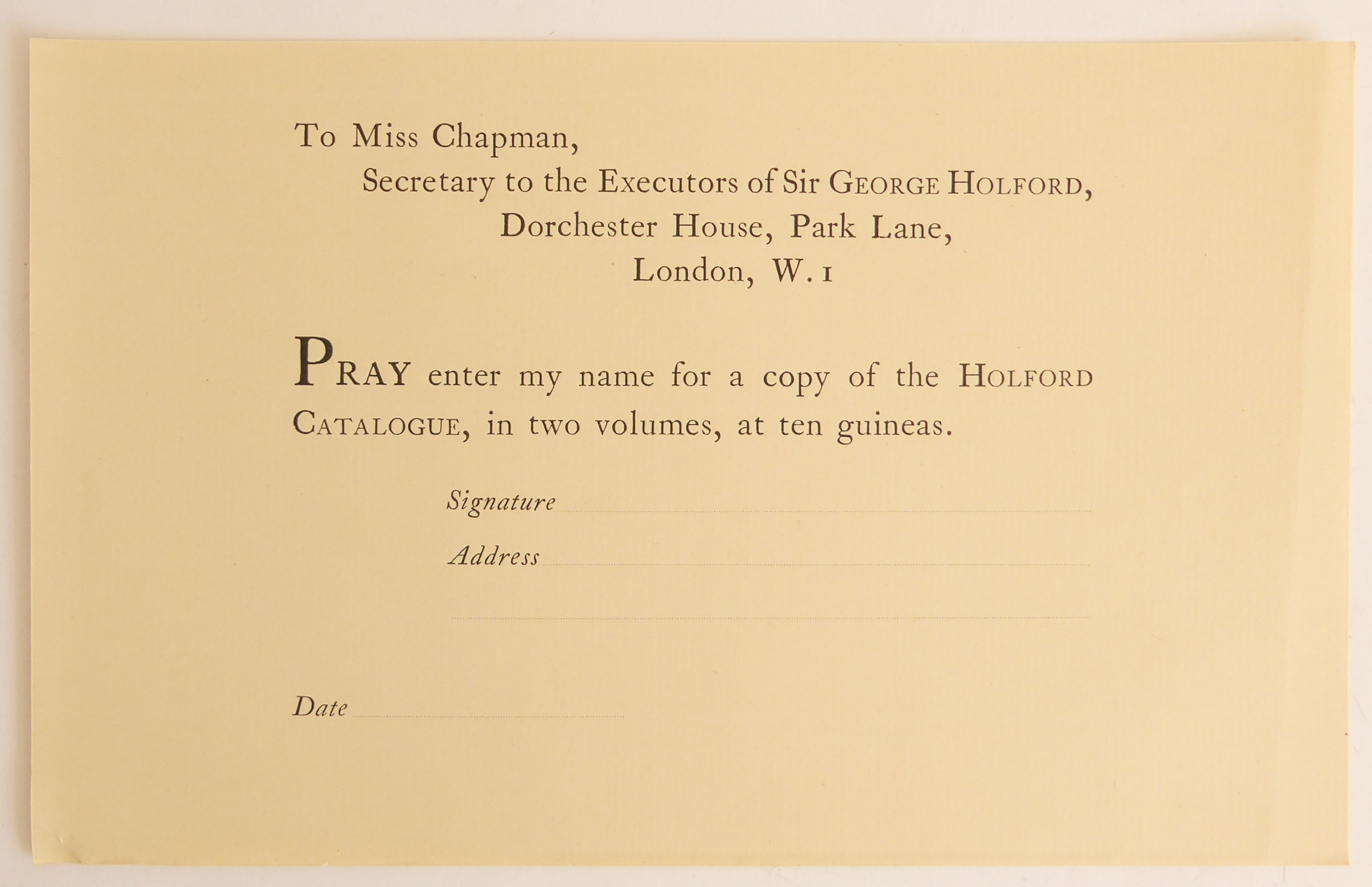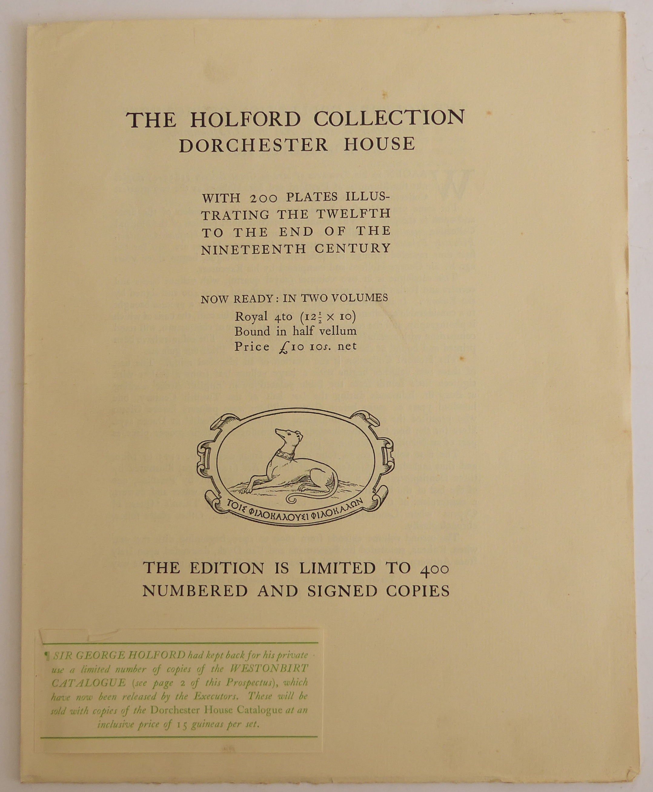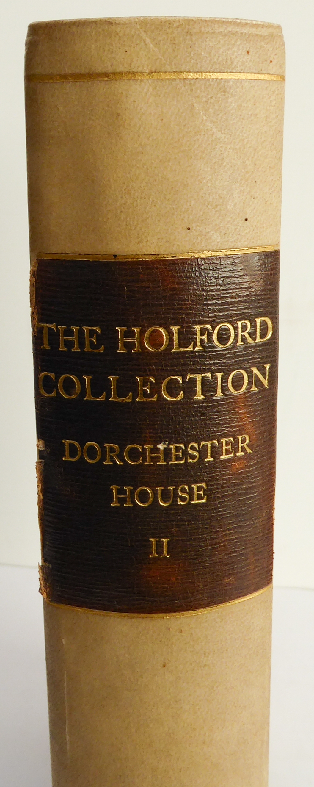The Holford Collection was, with the Hertford Collection, one of the two greatest British art collections of the 19th century. It was amassed by Robert Holford (1808-1892) and divided between his seat, Westonbirt in Gloucestershire, and his London home, Dorchester House in Park Lane. His son and heir, Sir George Holford (1860-1926), in association with the Burlington Fine Arts Club catalogued the Westonbirt Collection in 1924. Sir George died in 1926 and the Dorchester House catalogue published by his executors in the following year. The Holford Collection was sold in three record-breaking sales by Christies in 1927 and 1928. Also included with the lot is a handwritten record of the sales' results (the July 15th 1927 sale complete with buyers' names).