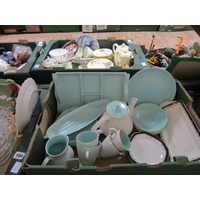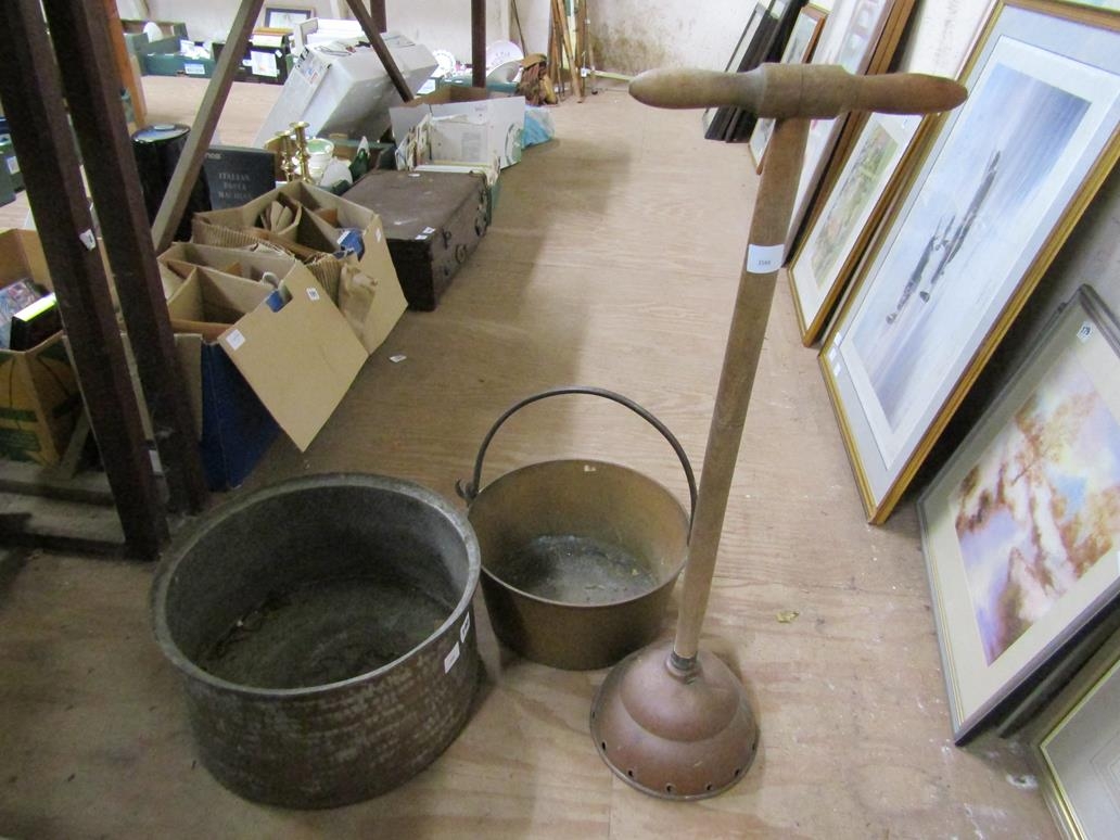 BOX OF METALWARE AND OLD WASHING DOLLY