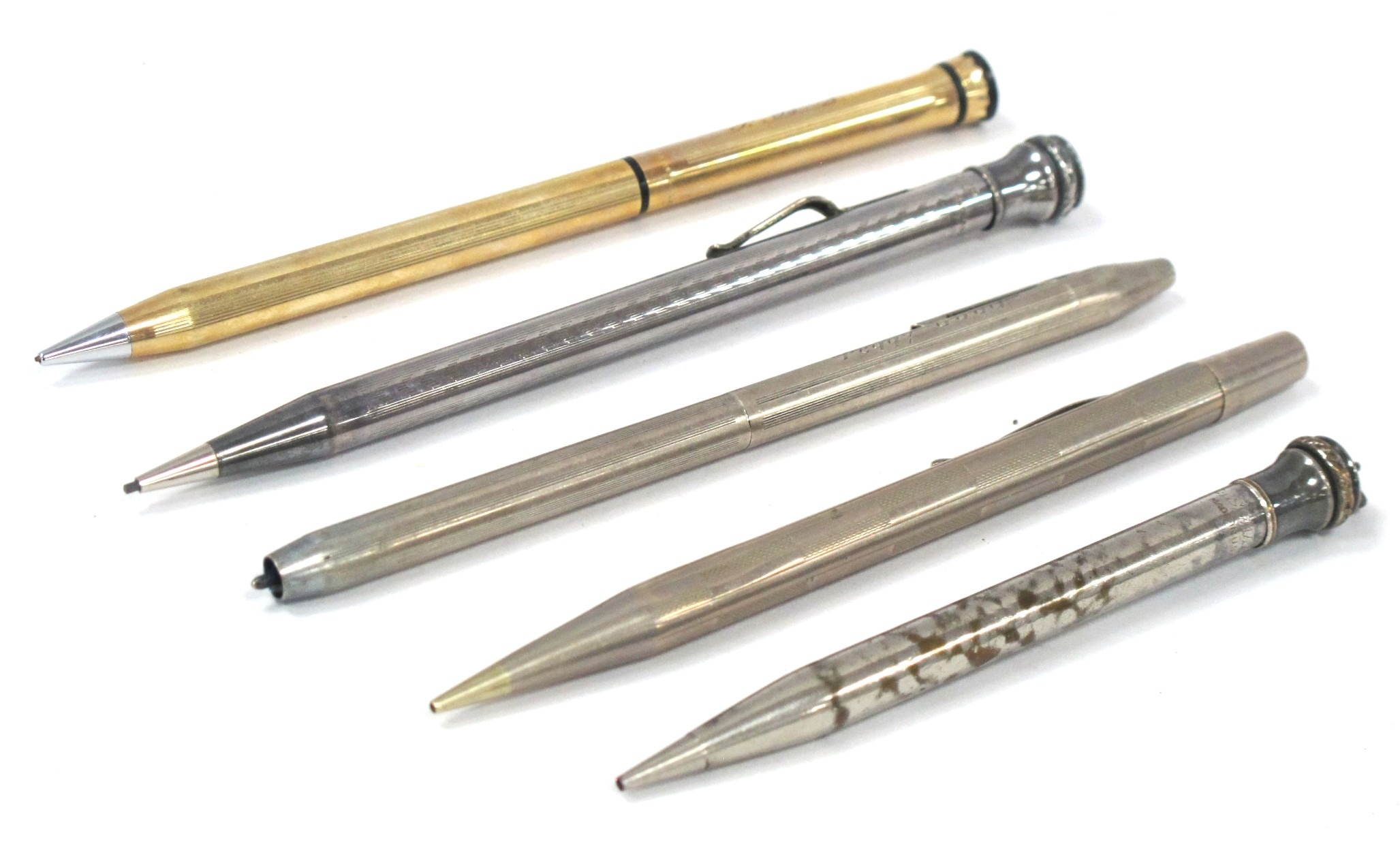 A Propelling Pencil Marked 'Garland 1/20 12KT G.F. USA' together with another similar silver hallmarked, Yardolette and two plated examples. (5) [447081]
