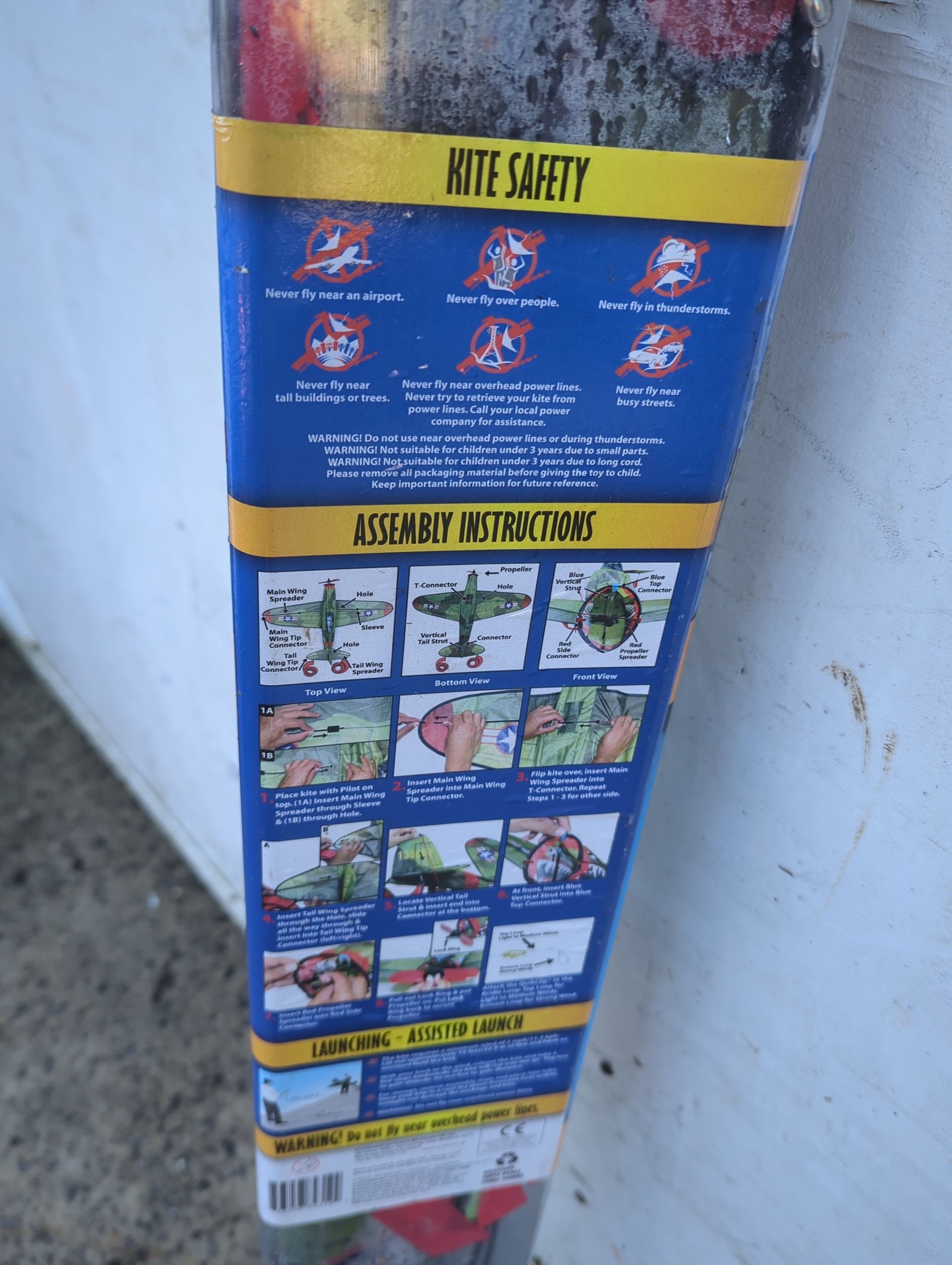 This package contains a Warhawk 50-inch 3D Nylon Kite designed for outdoor use. The kite features a distinctive aeroplane design with recognizable symbols and vibrant colours. It is described as easy to assemble with ripstop fabric, fiberglass airframe, and includes spintails. The packaging includes detailed assembly instructions and safety guidelines.