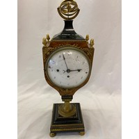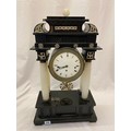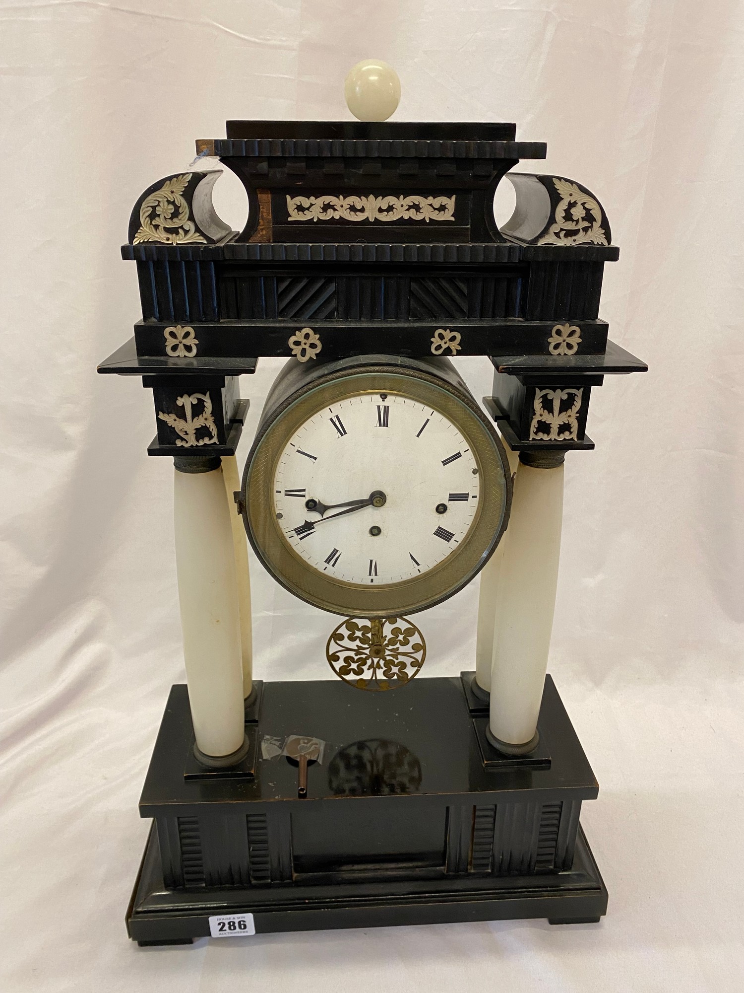 A 19th Century Continental Portico style clock with white enamel dial, striking movement on a gong, silk suspension, pierced brass pendulum, alabaster columns, in an ebonised wooden case