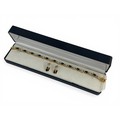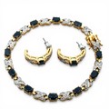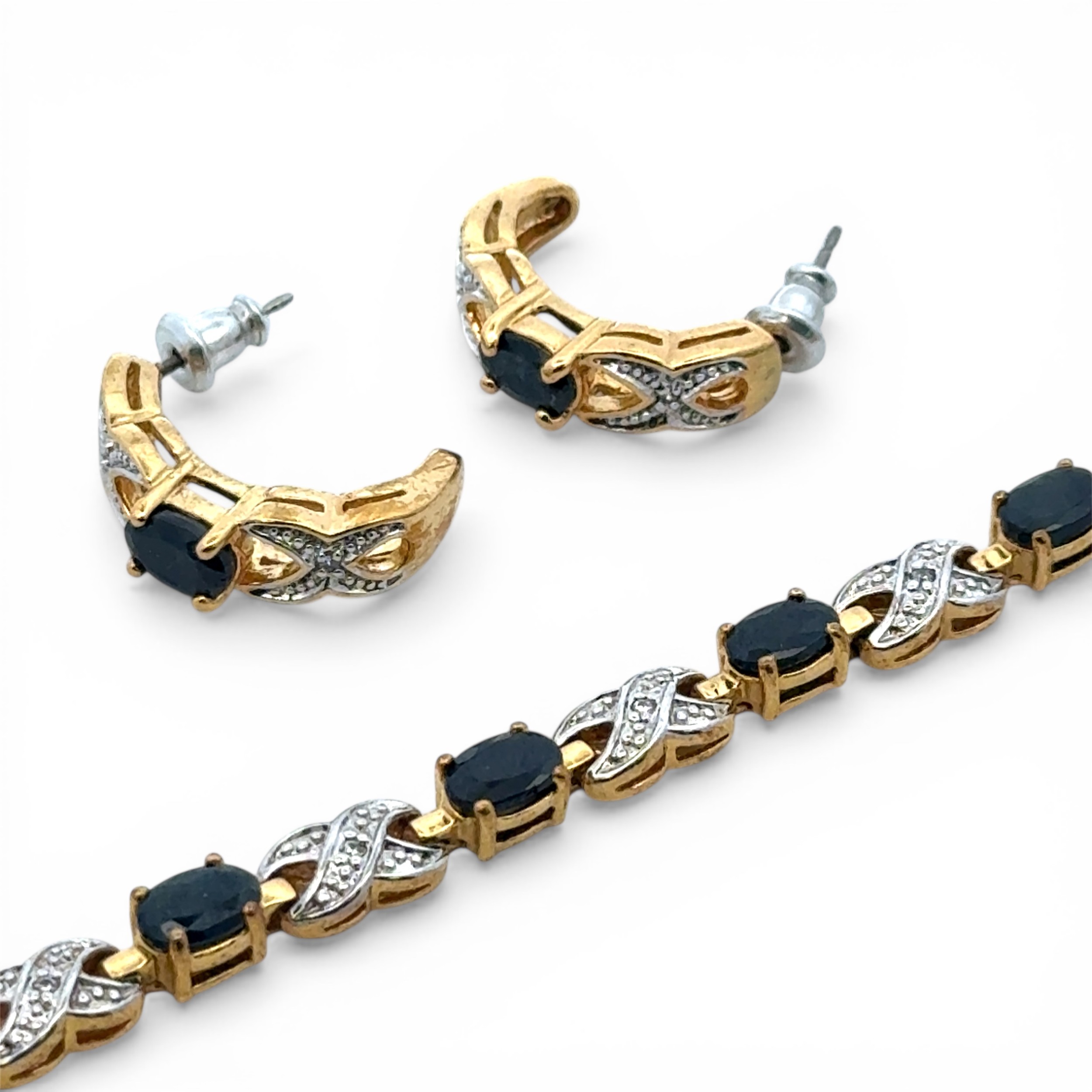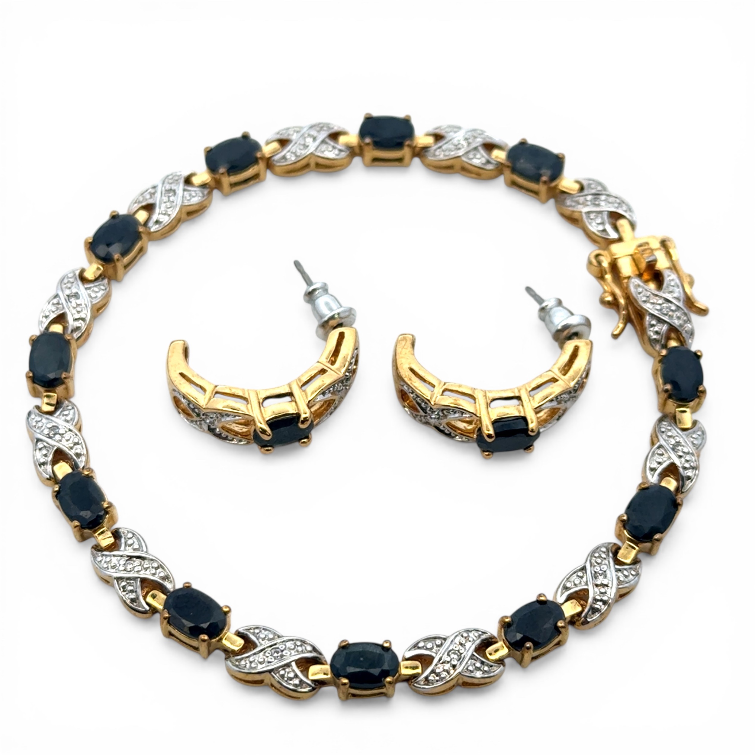 A gold plated sapphire and white stone bracelet with matching half hoop earrings. Bracelet length approx 20.5cm. Boxed.
