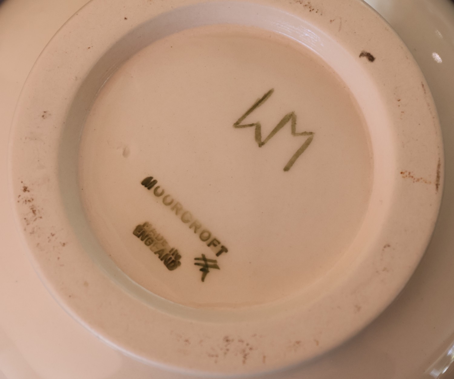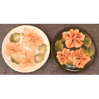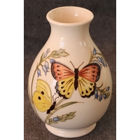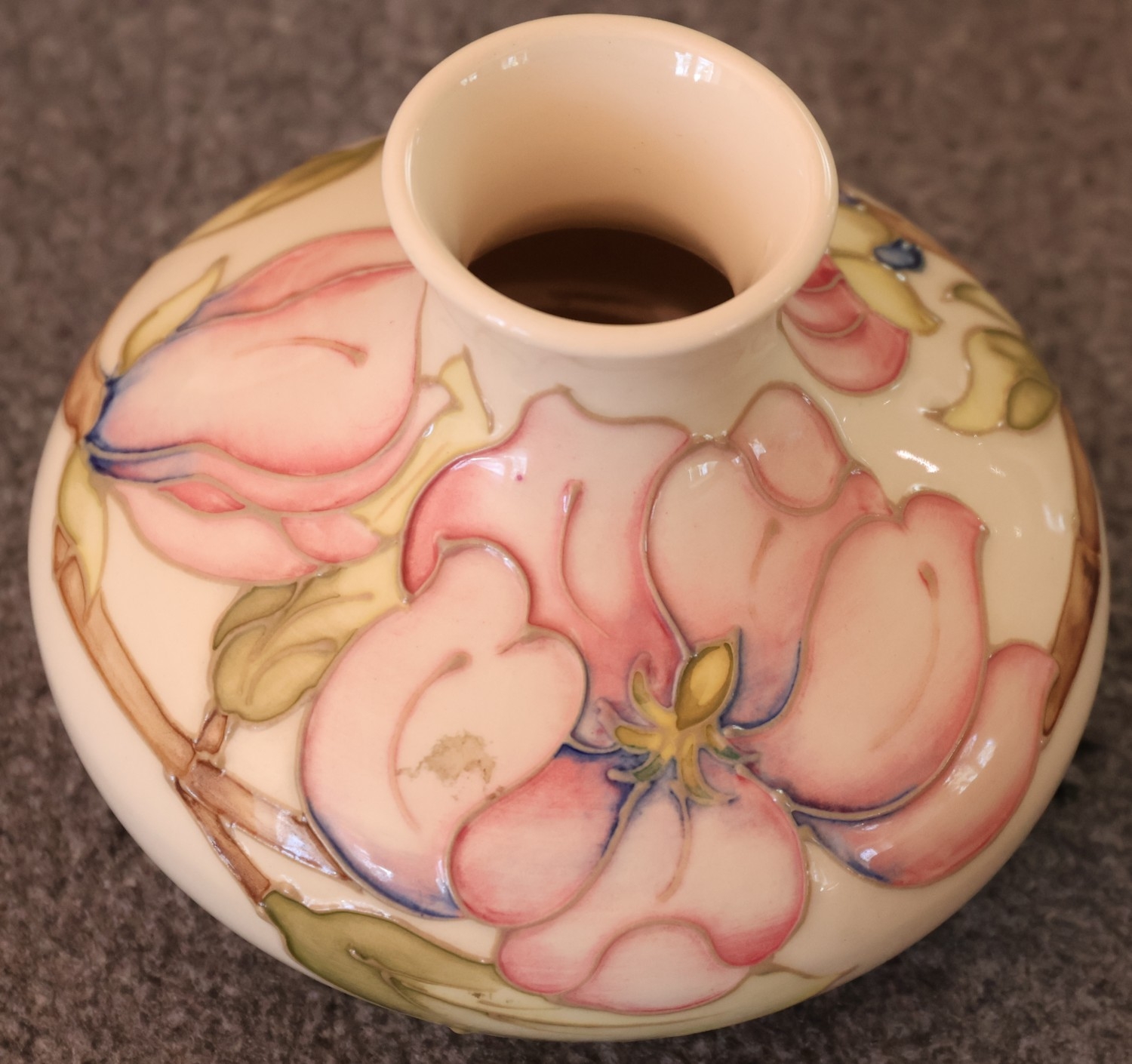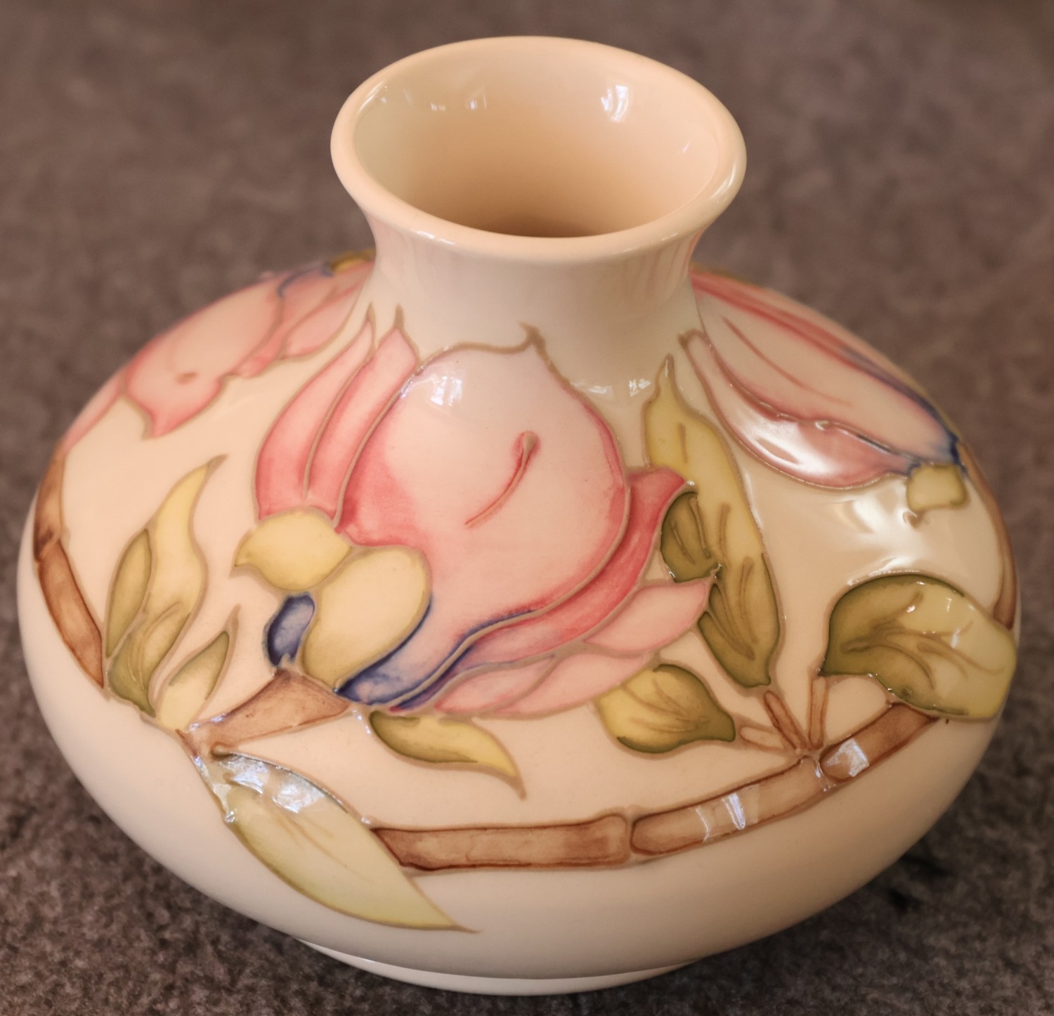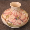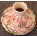 A Moorcroft round squat thin necked trumpet shaped vase on cream ground with multi-coloured floral, leaf and branch decoration, 11cm high