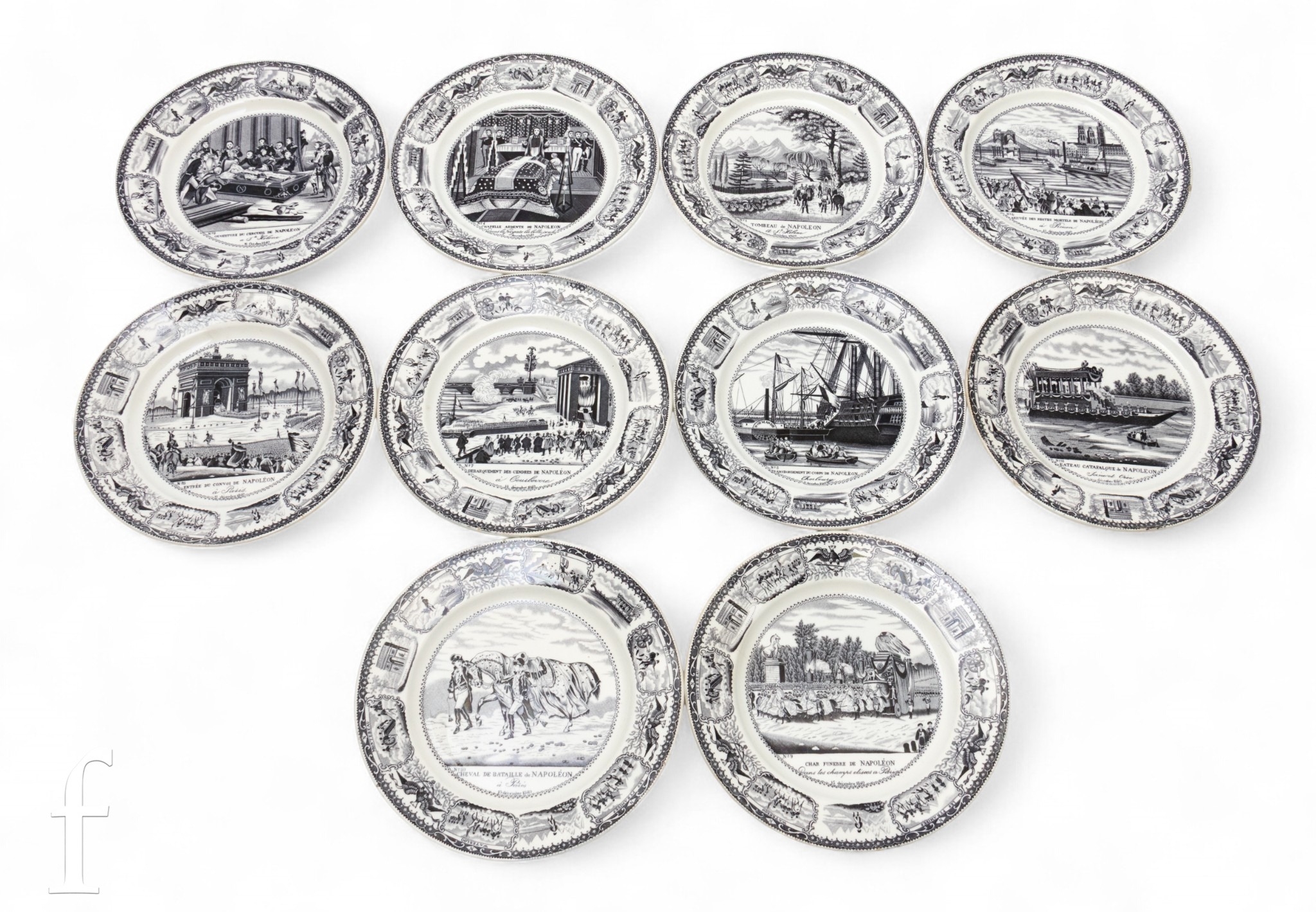 A collection of ten Gien Medellie Exposition Napoleon plates, circa 1844, en grisaille decoration, diameter 21cm. (10)