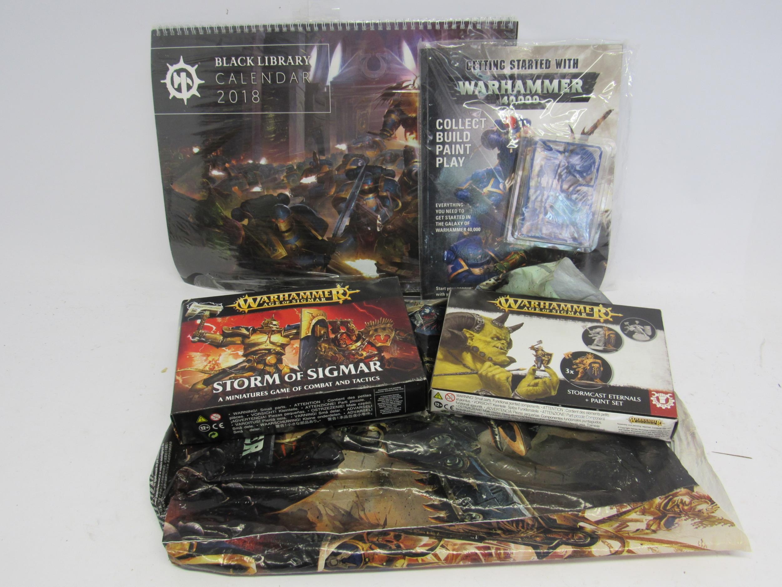 A collection of Warhammer items to include Storm Of Sigmar and Age Of Sigmar sets, First Strike starter set and Black Library 2018 claendar (4)