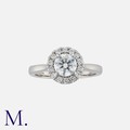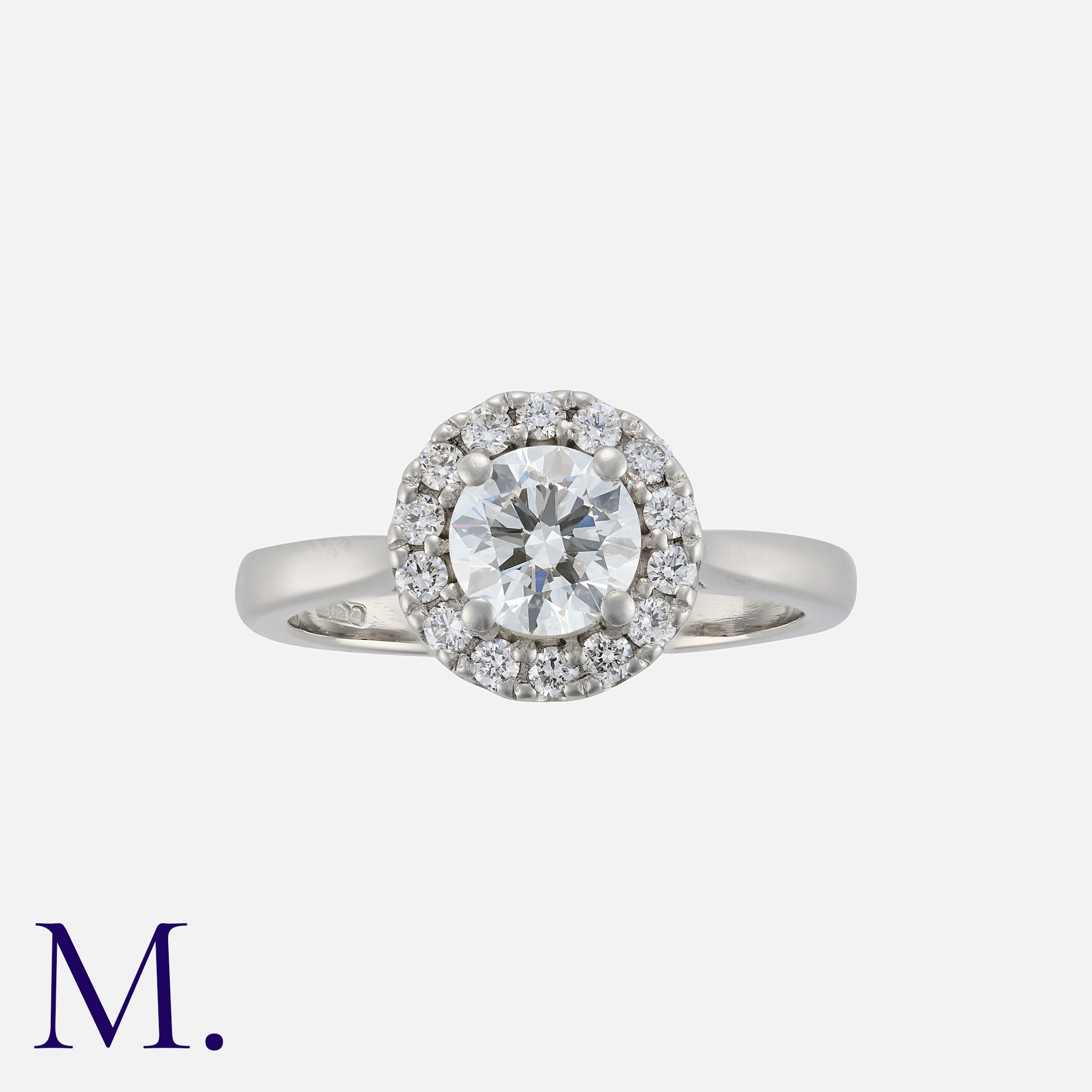 A 0.70ct G Colour Diamond Cluster Ring in platinum, set with a principal round cut diamond of 0.70ct, within a further halo border of round cut diamonds, all diamonds totalling approximately 0.88ct. Hallmarked for platinum. Accompanied by a gemmological report stating the principal diamond of 0.70ct is G Colour SI1 clarity.