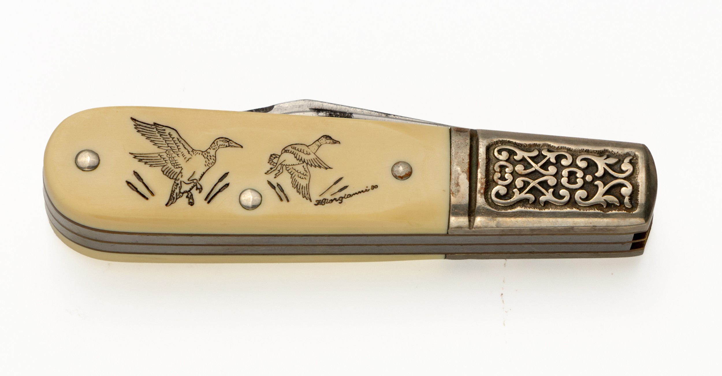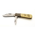The bone handle depicting two geese, two fold out blades, the handle 9cm long, the longest blade 7cm long