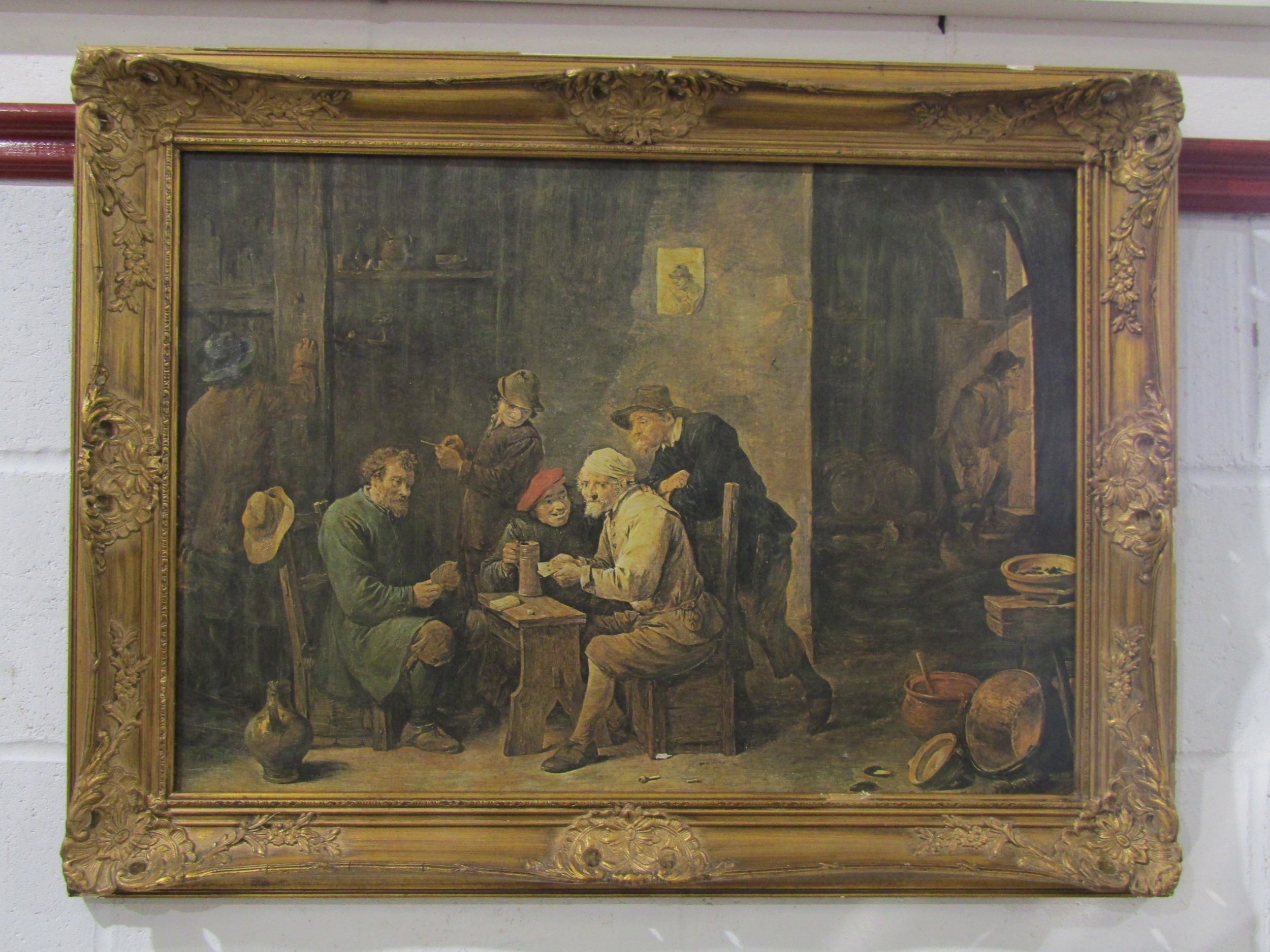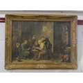 A gilt framed oleograph of a tavern scene, 48cm x 68.5cm image size