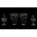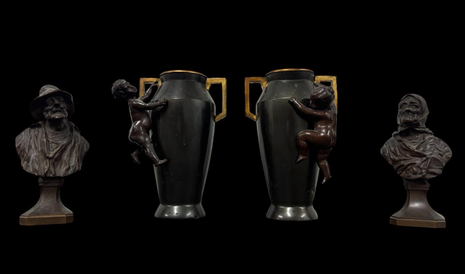 A PAIR OF ART DECO BRONZE AND BRASS MOUNTED SPELTER VASES with brass inserts and handles featuring bronze putti 16cm (h) together with a matched cast bronze man and woman with filled bases (AF)