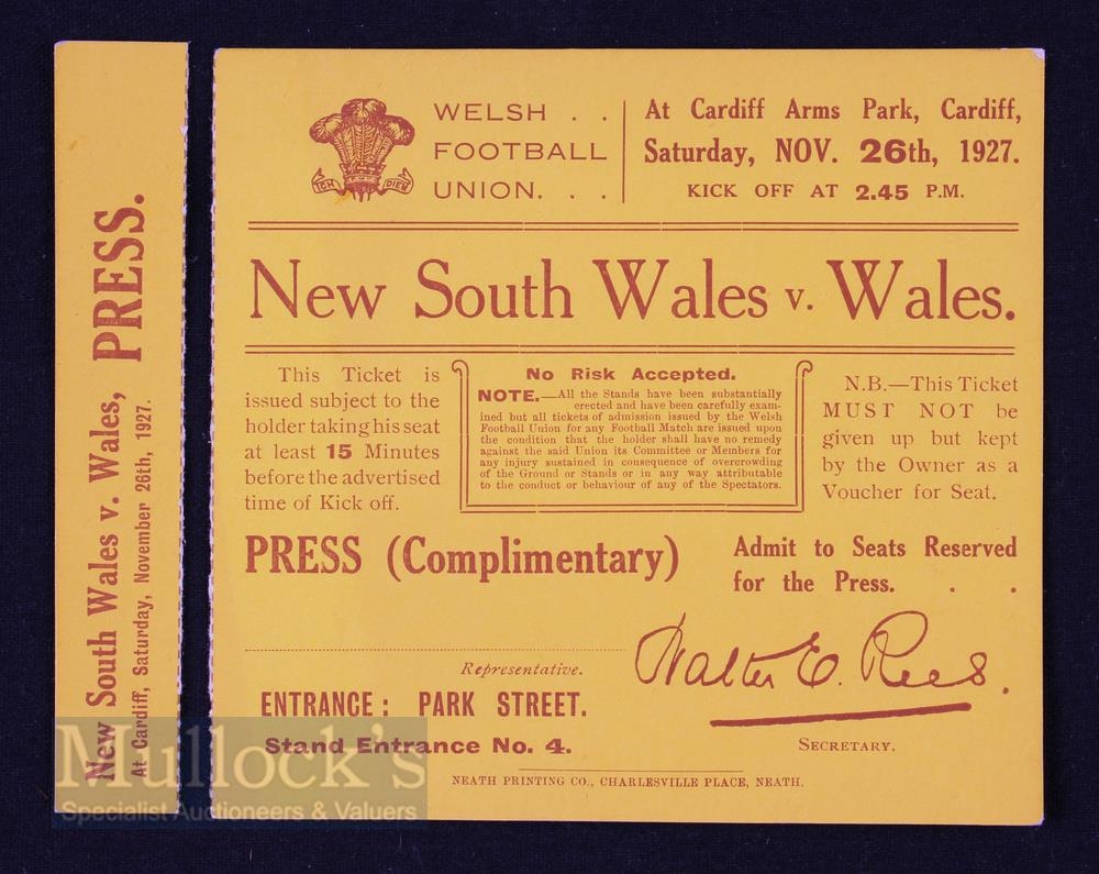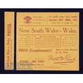Rugby Ticket, Wales v NSW, 1927: In neat folder, bright crisp & clean, a yellow Press ticket for this clash at Cardiff. Stub present though neatly detached. Excellent