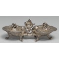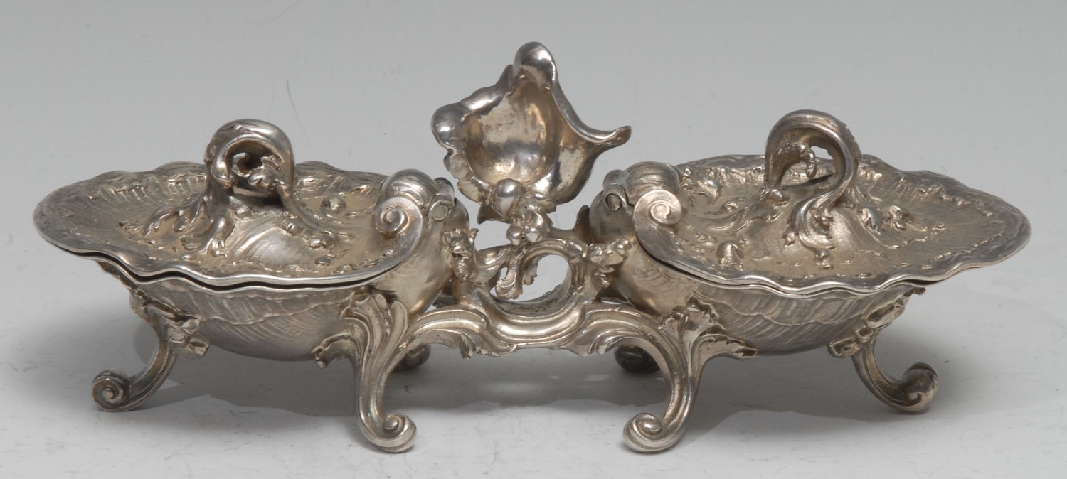 A Dutch Rococo Revival silver double salt, each shell compartment with hinged cover, scroll feet, 18.5cm wide, marked to base, 19th century, 12.75oz