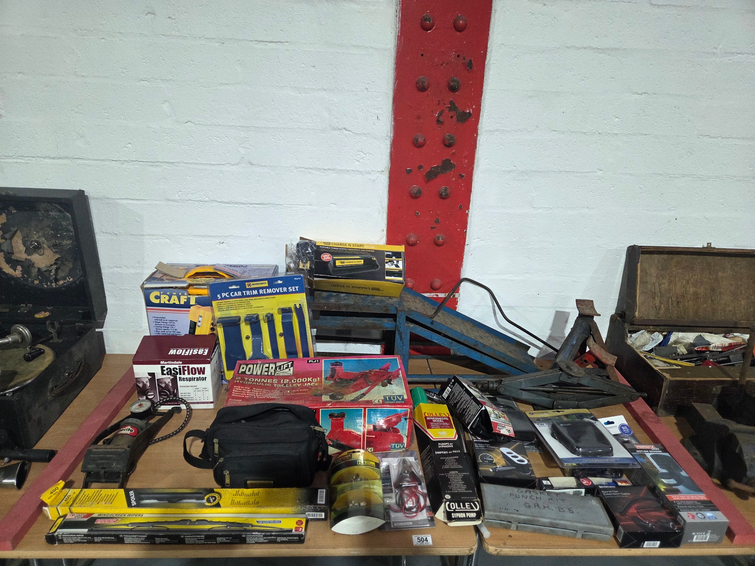 A Powercraft power station, power lift two tonne trolley jack, car ramp and other new in box car accessories