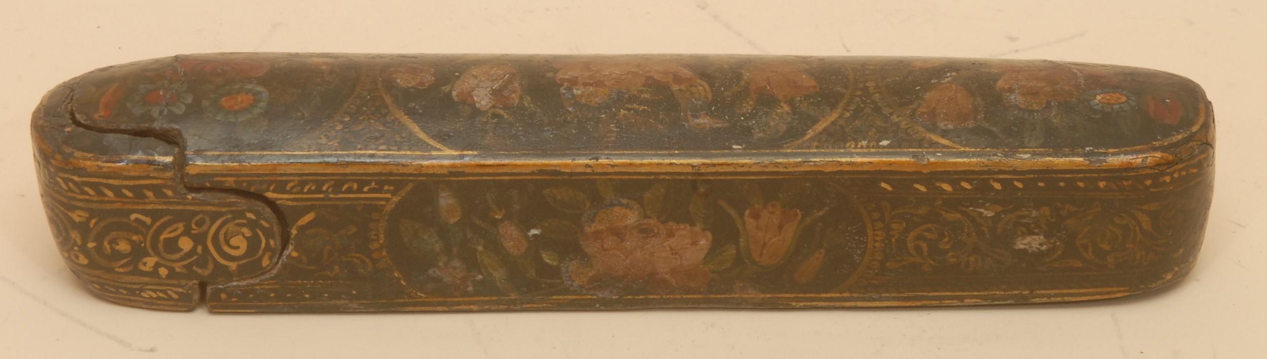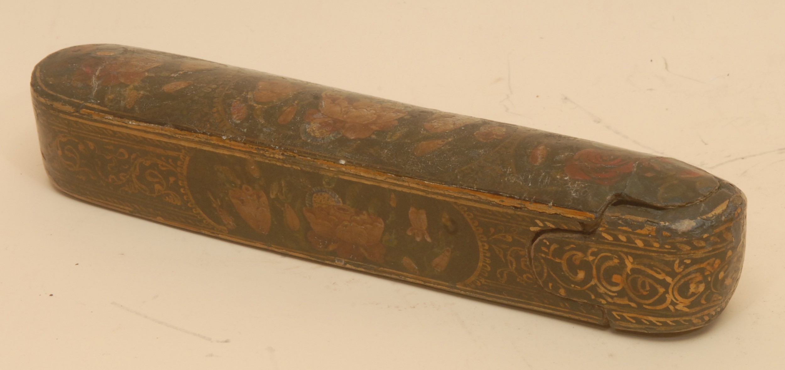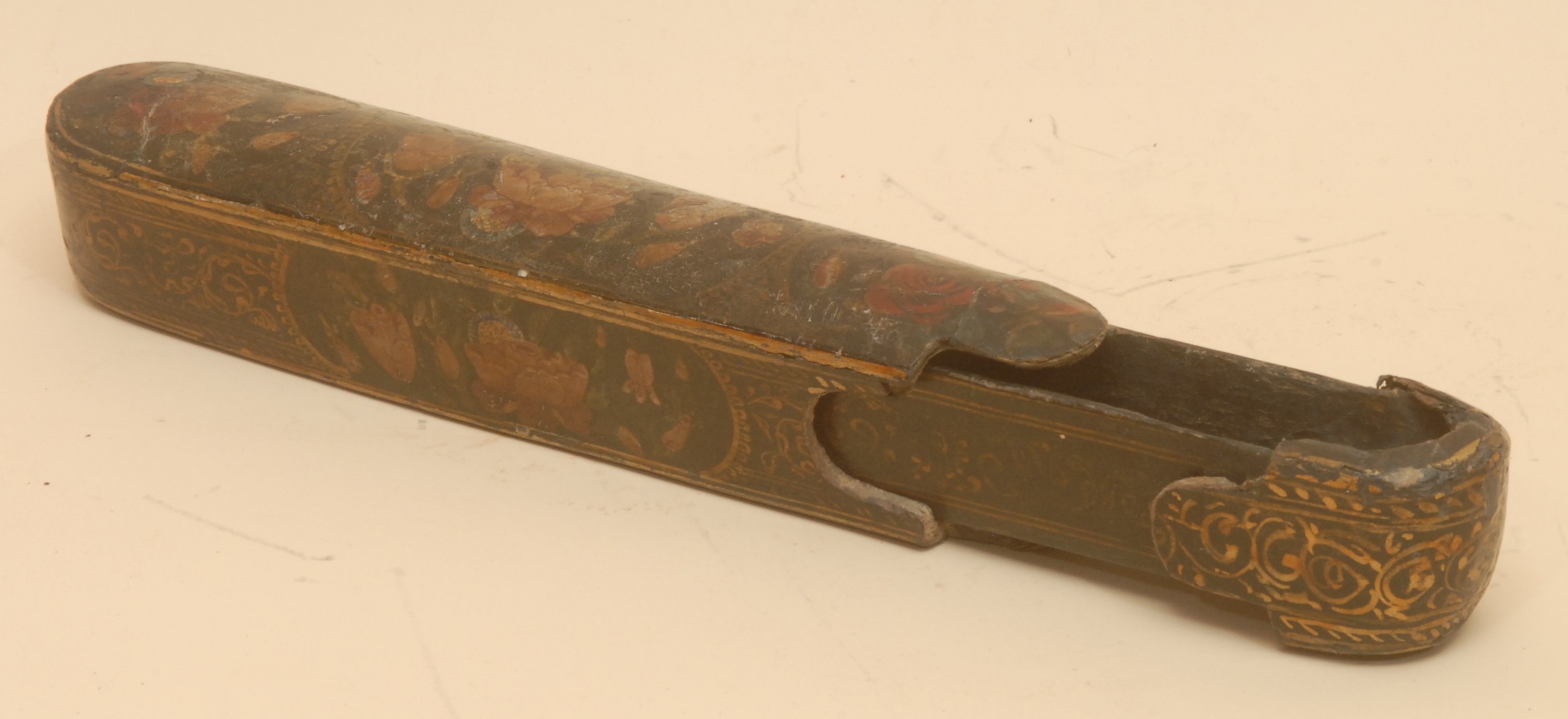A 19th century Persian/North Indian qalamdan pen case, decorated in polychrome with flowers, 21cm long