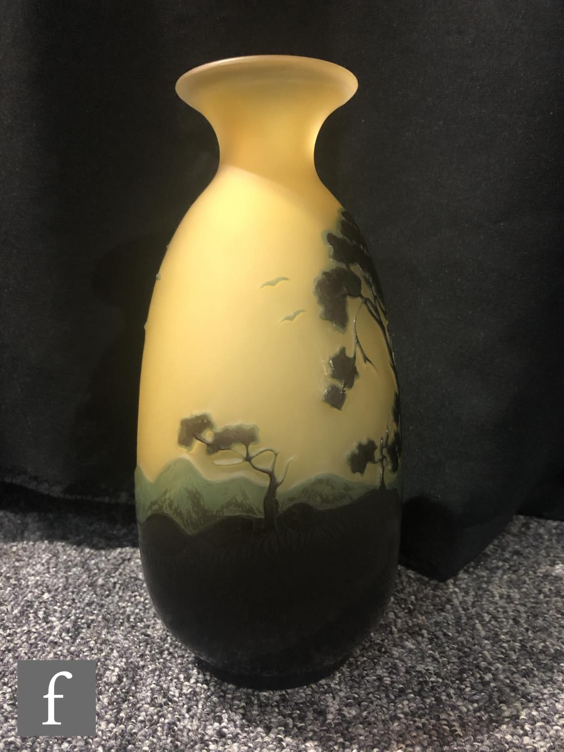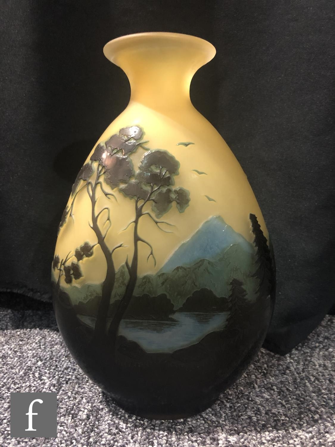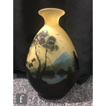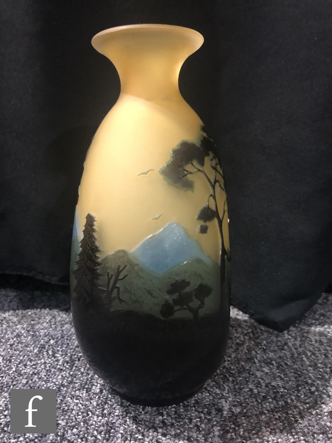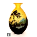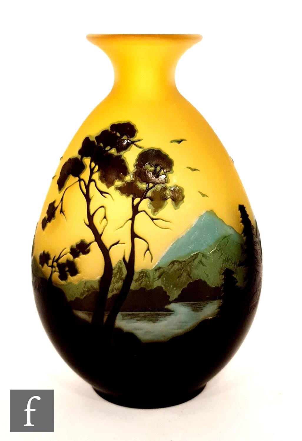 Galle - An early 20th Century cameo glass vase, circa 1900, of compressed ovoid form with everted rim, cased in brown and blue over citron, and cut with a landscape scene of woodland, rivers and mountains and birds in flight, cameo signature to body, height 22cm.