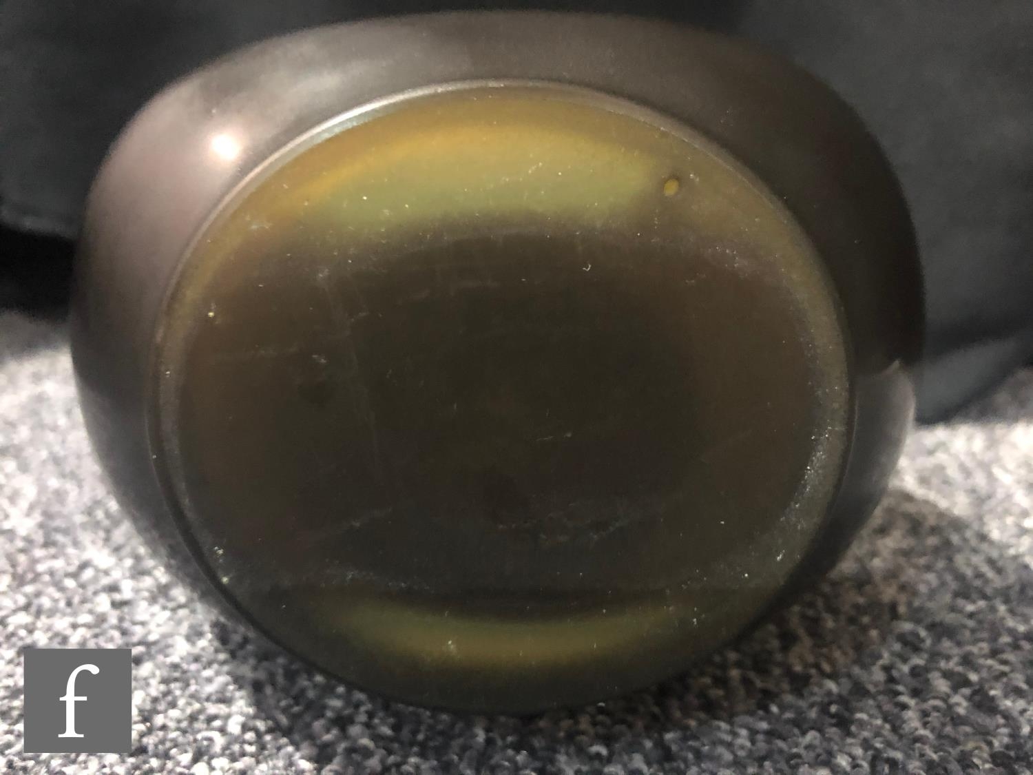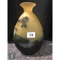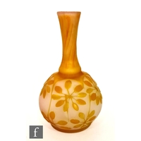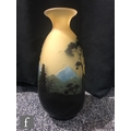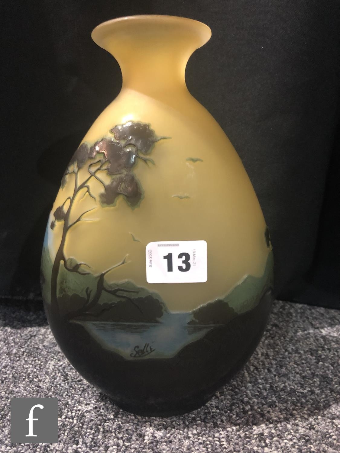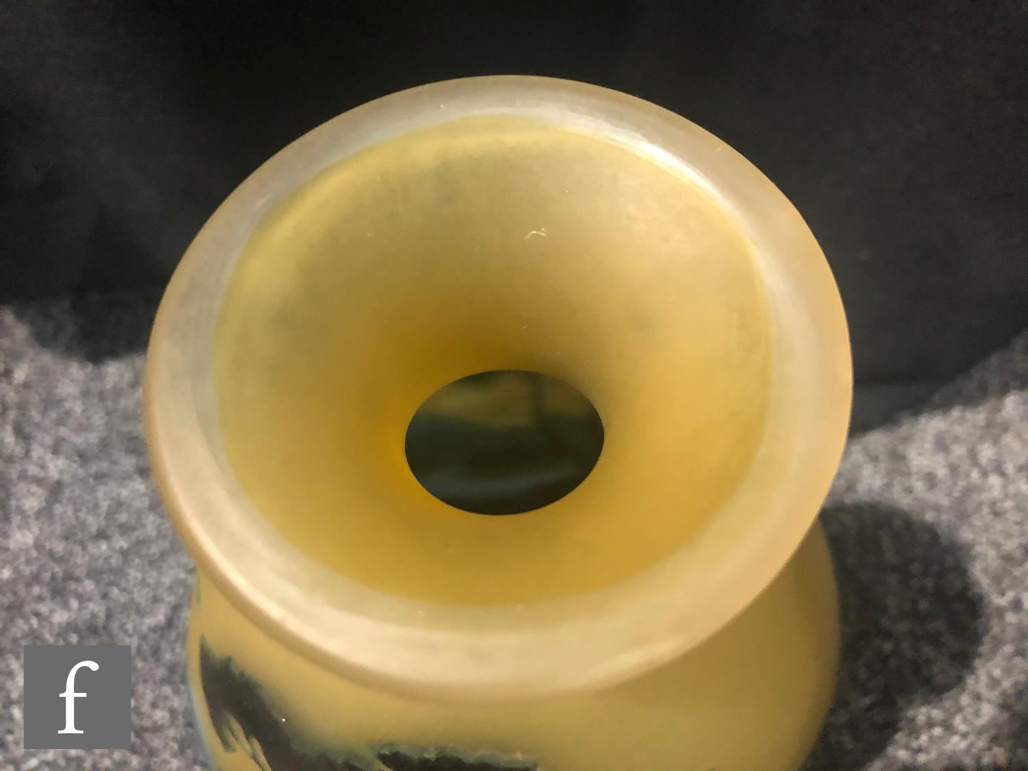 Galle - An early 20th Century cameo glass vase, circa 1900, of compressed ovoid form with everted rim, cased in brown and blue over citron, and cut with a landscape scene of woodland, rivers and mountains and birds in flight, cameo signature to body, height 22cm.