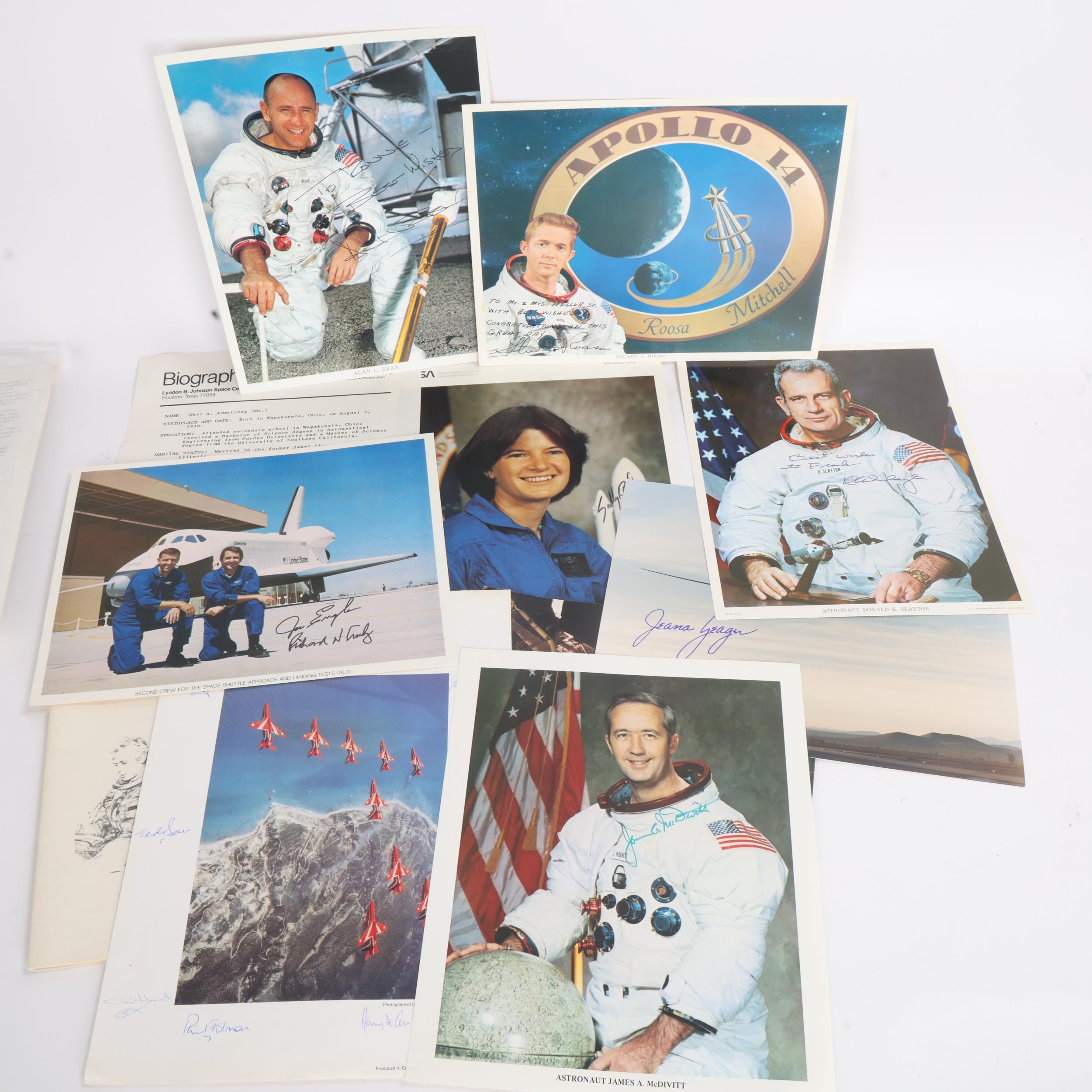 NASA SPACE EXPLORATION INTEREST - a group of hand signed photographs, including Neil Armstrong, Sally Ride, James Irwin, Alfred Worden, Alan Bean, Frank Borman, and James McDivitt, together with several other autographed photos and ephemera