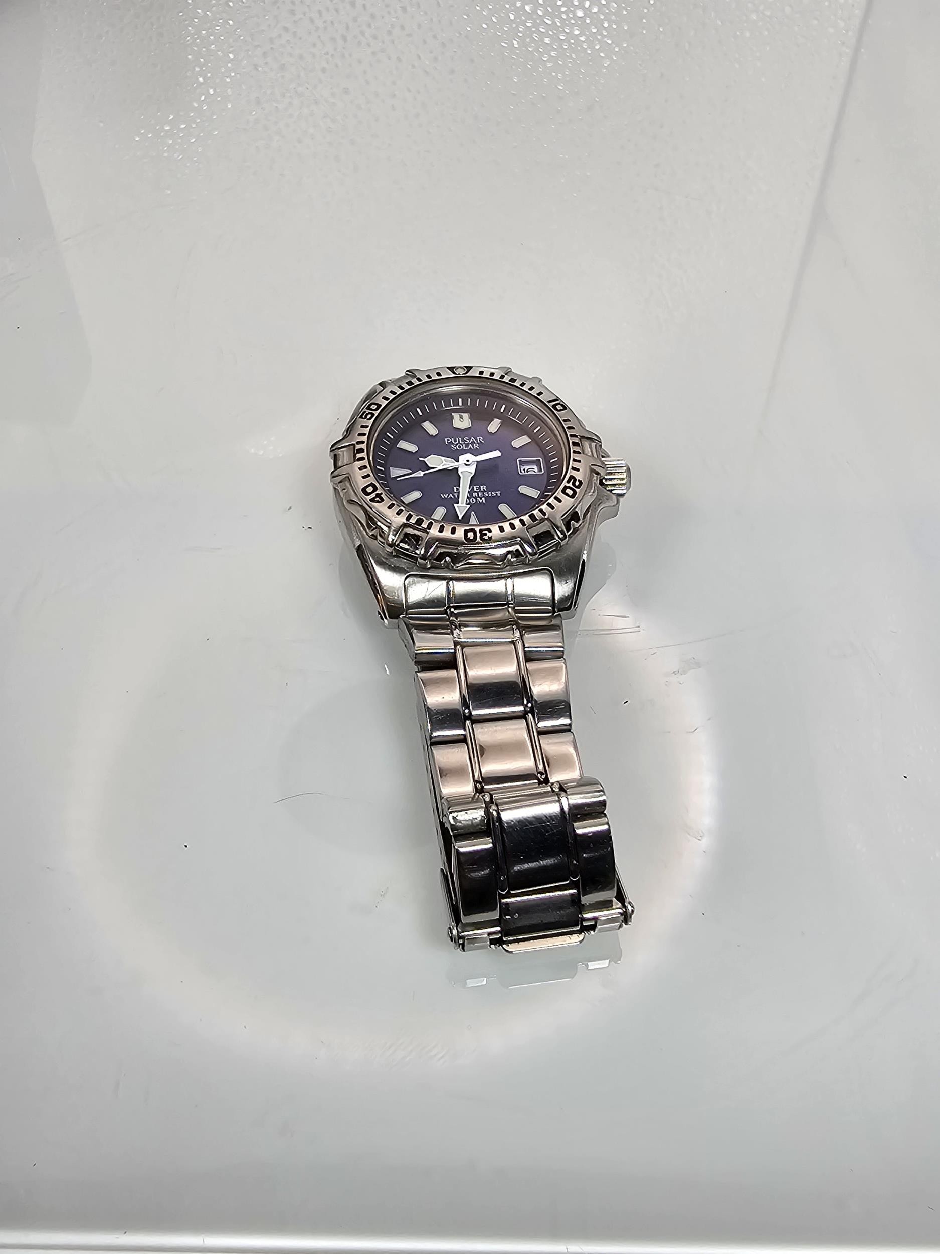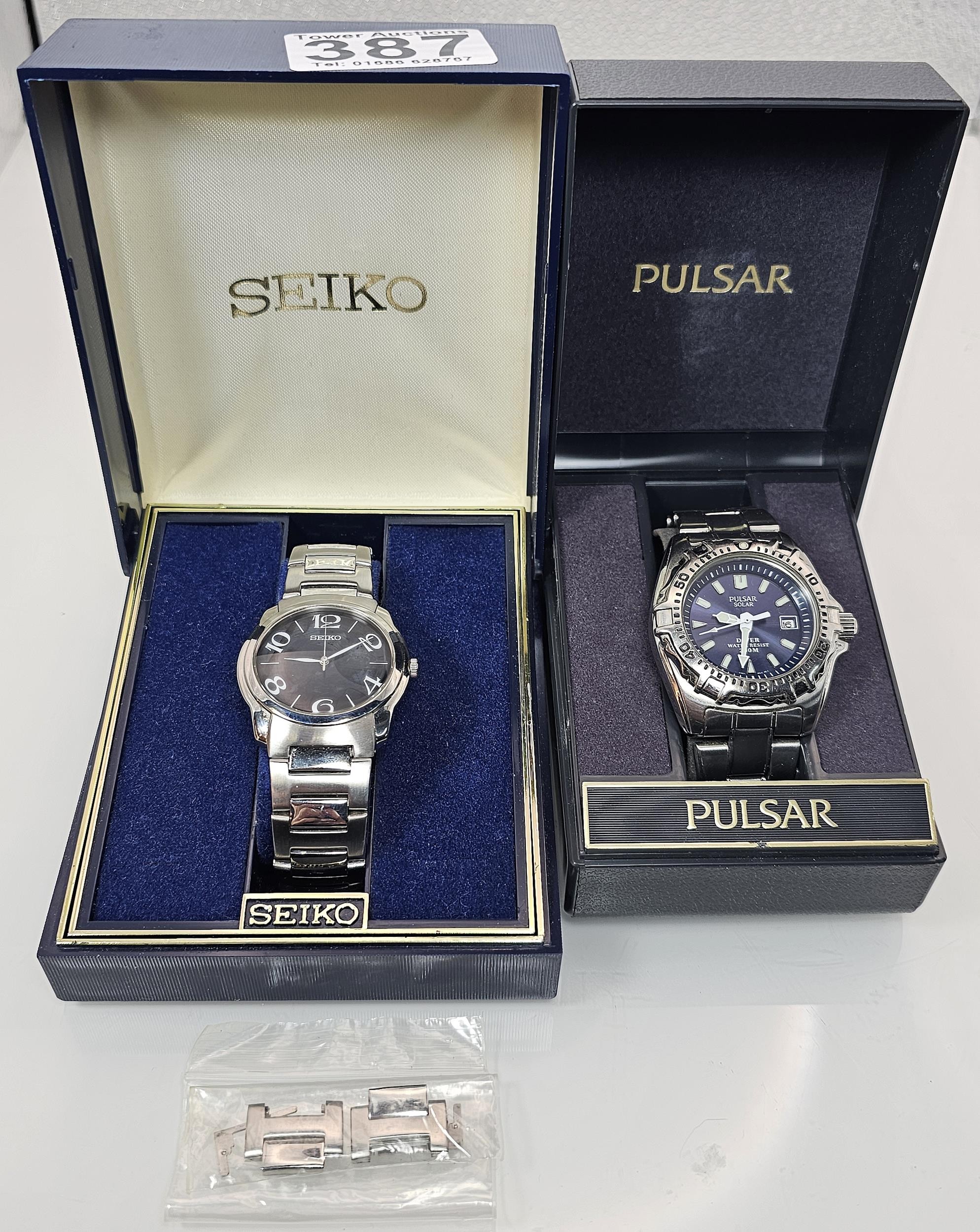 2x good quality cased gents wrist watches to include a Pulsar Solar Diver 200M wristwatch Model V145-0AJ0 along with a cased Seiko 7N01-0CW0 wristwatch having an unusual number design *We have fitted a new battery to the seiko watch and is fully working* the other watch will require a new battery (we ran out of that type). Both appear to be in excellent condition, the Seiko watch has spare links.