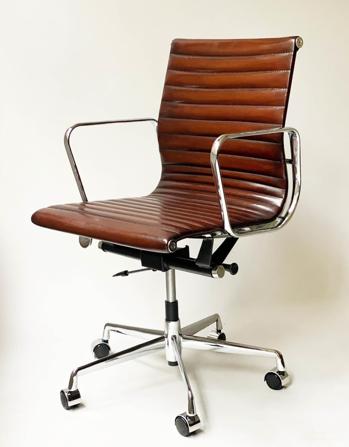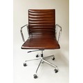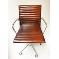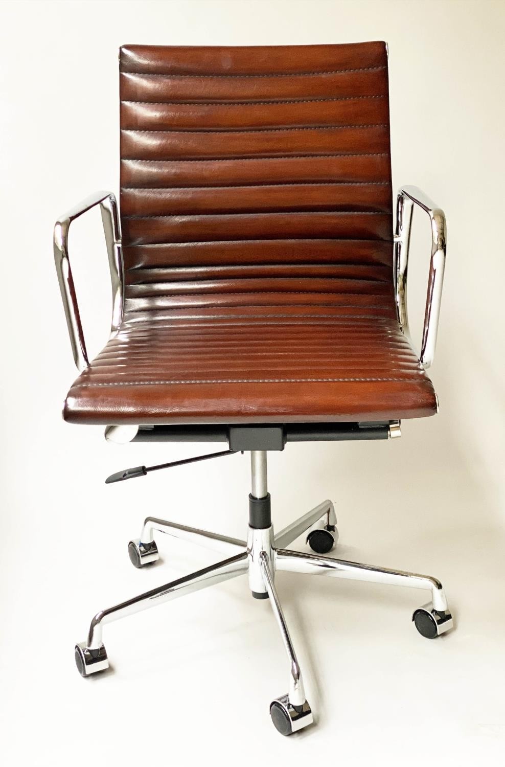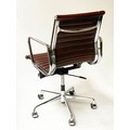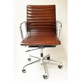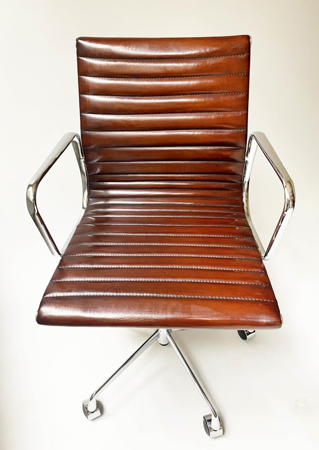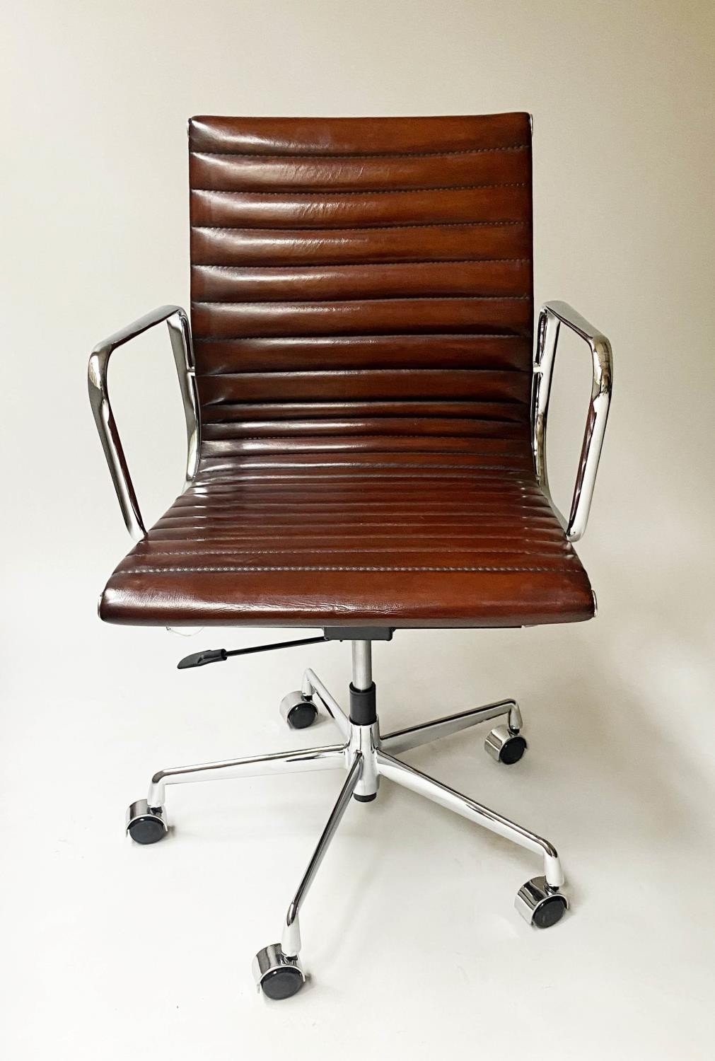 REVOLVING DESK CHAIR, Charles and Ray Eames inspired with ribbed mid brown leather seat revolving and reclining on an adjustable base with castors.