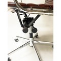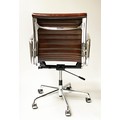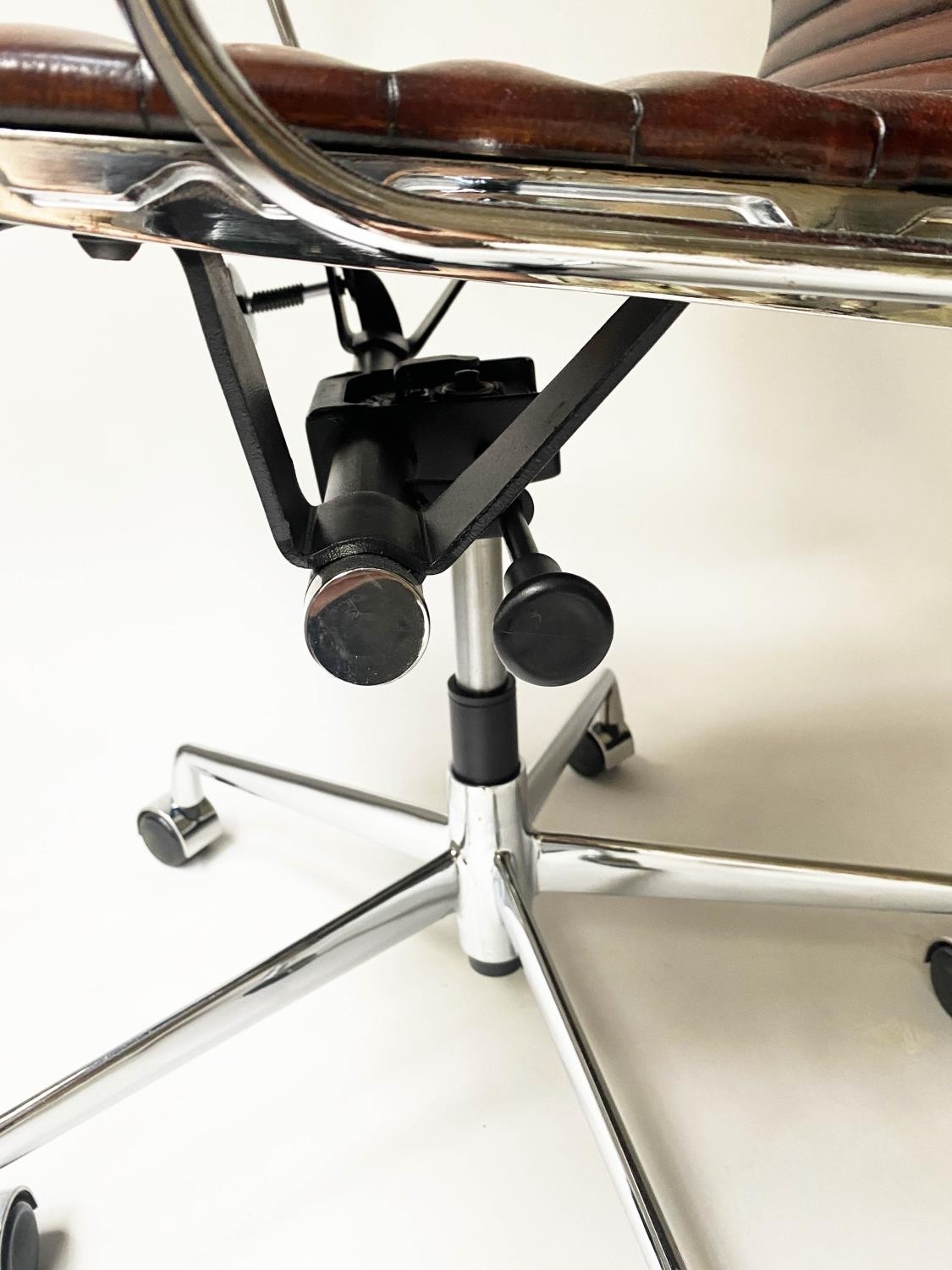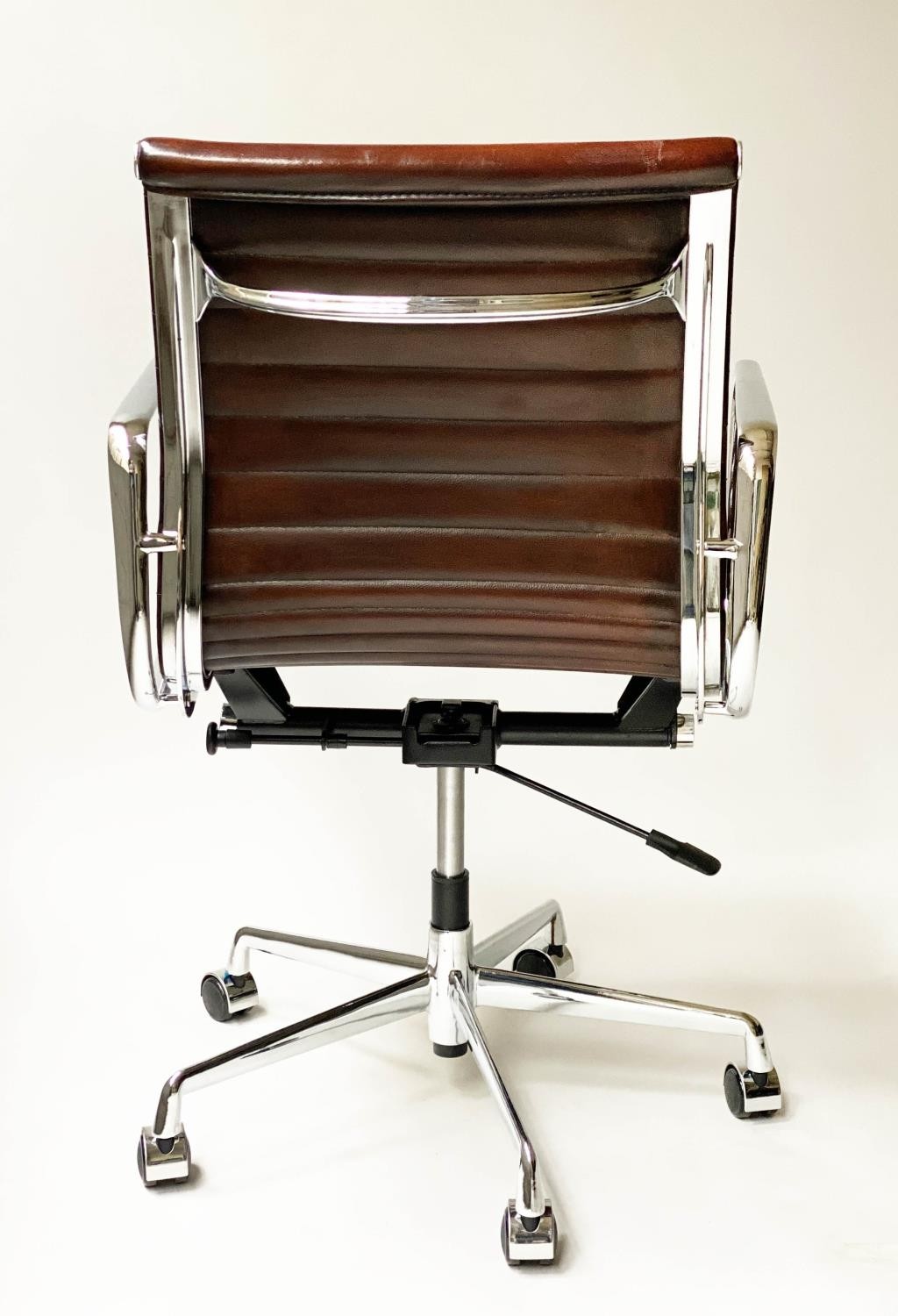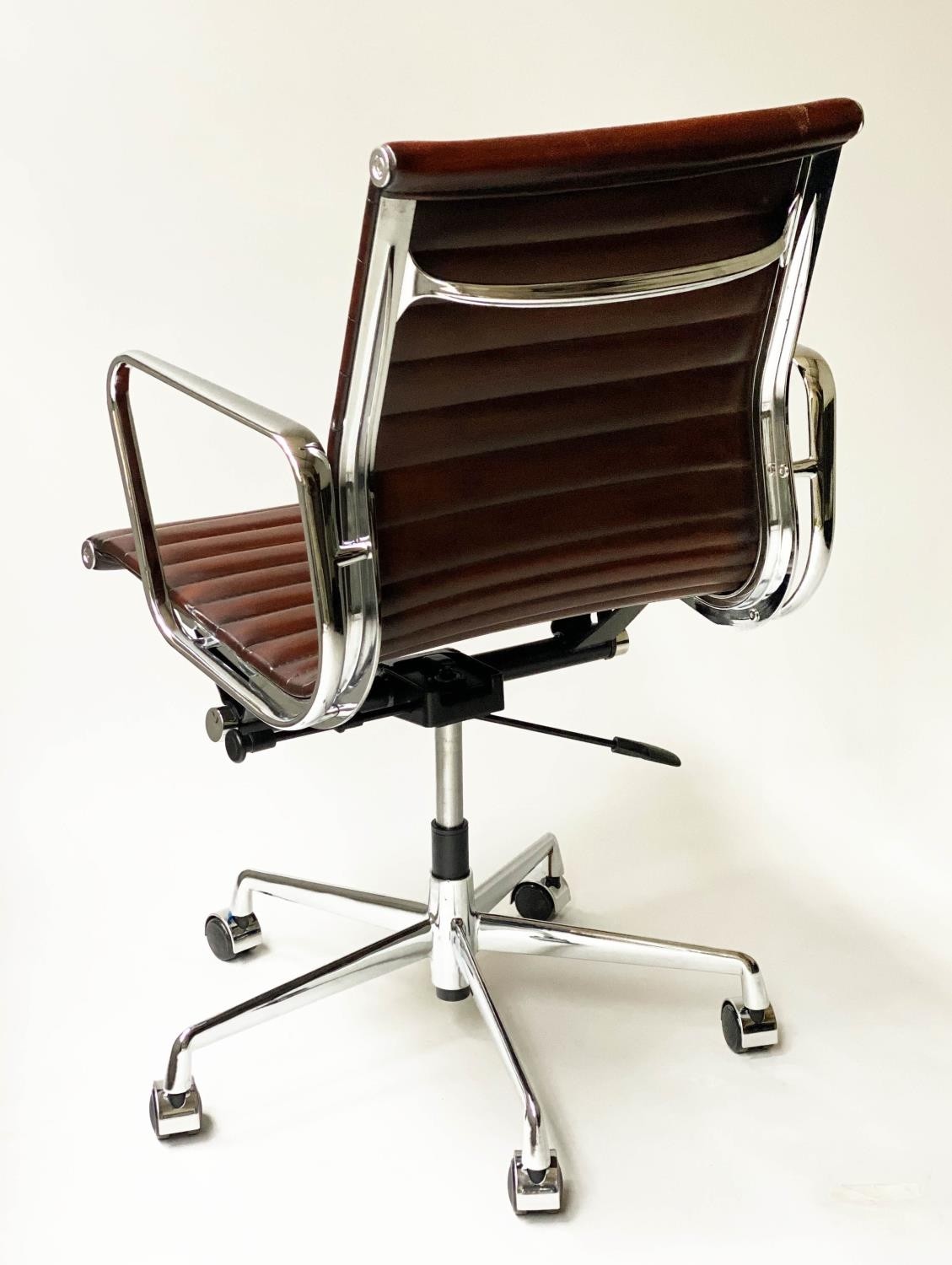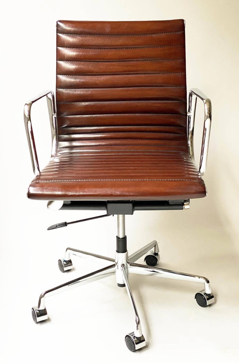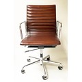 REVOLVING DESK CHAIR, Charles and Ray Eames inspired with ribbed mid brown leather seat revolving and reclining on an adjustable base with castors.