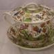 Early Royal Crown Derby Covered 2 Handled Dish on saucer decorated with chrysanthemums, pagodas, birds, marked to base with crown & X