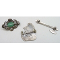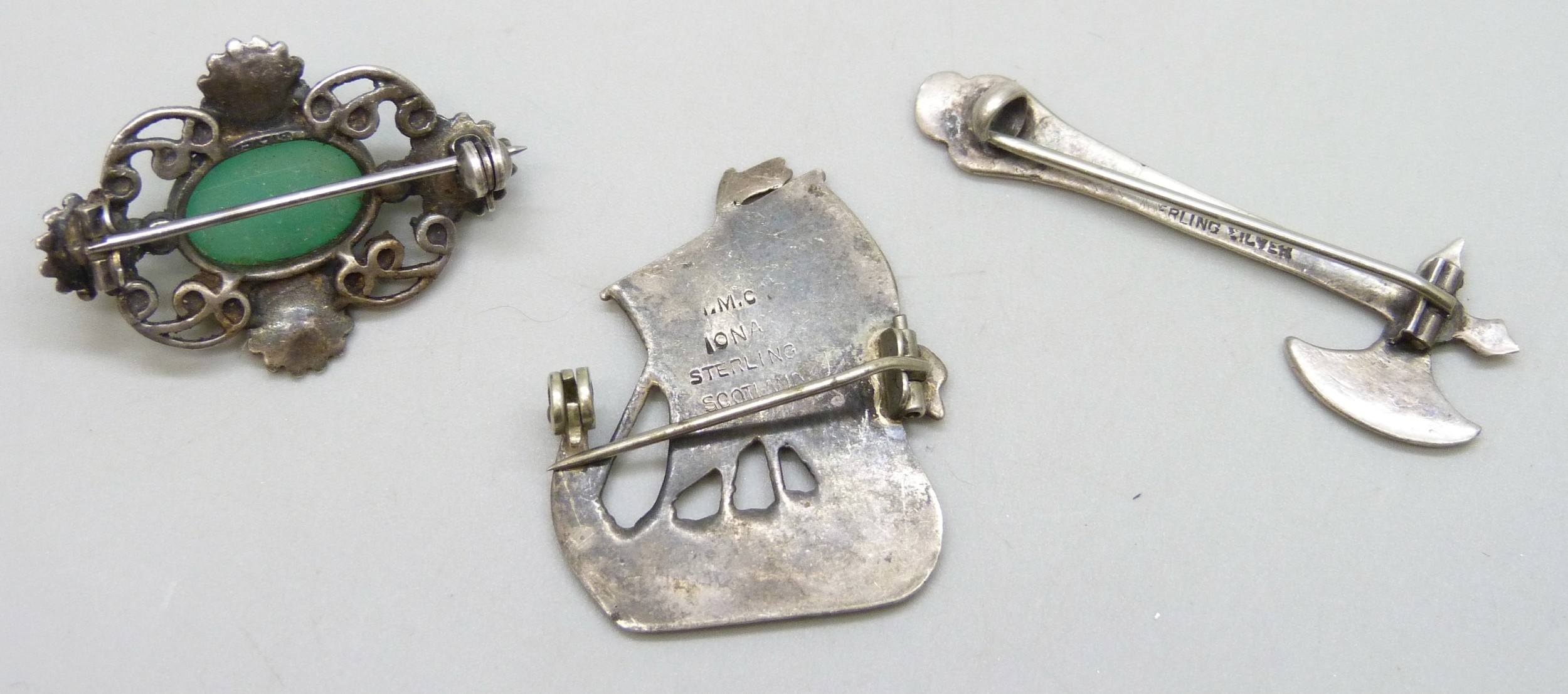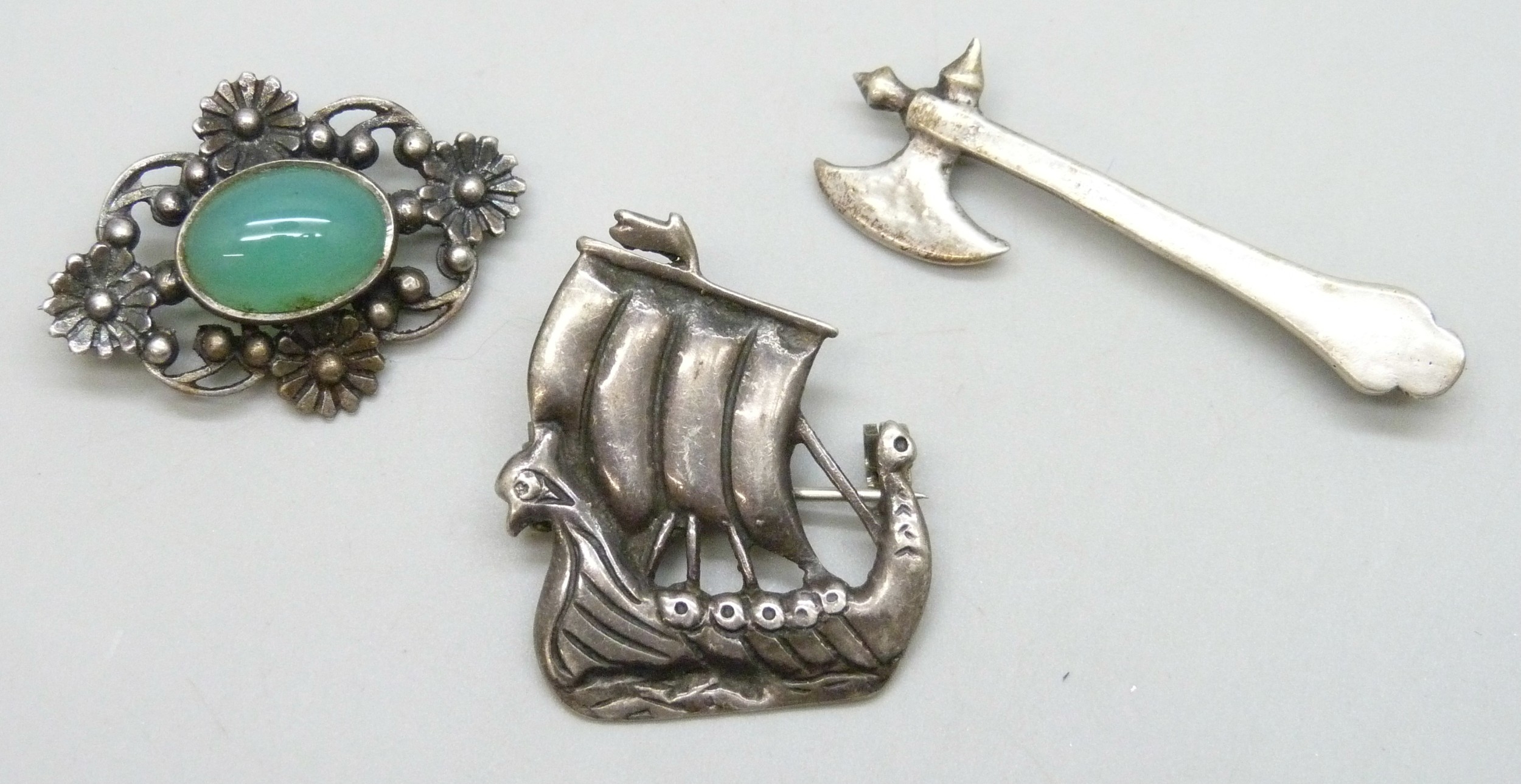 An Iona Scottish silver ship brooch, an Arts & Crafts silver and chrysoprase brooch, and a silver axe brooch, 4.6cm, 18g total