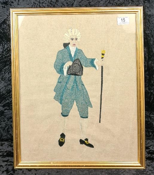 Framed embroidery of a very dandy 18th-century gent. Frame m...