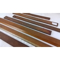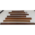 Set of 7 vintage wooden straightedges and measuring rules, including examples with applied inch scales and hanging holes, of graduated lengths.