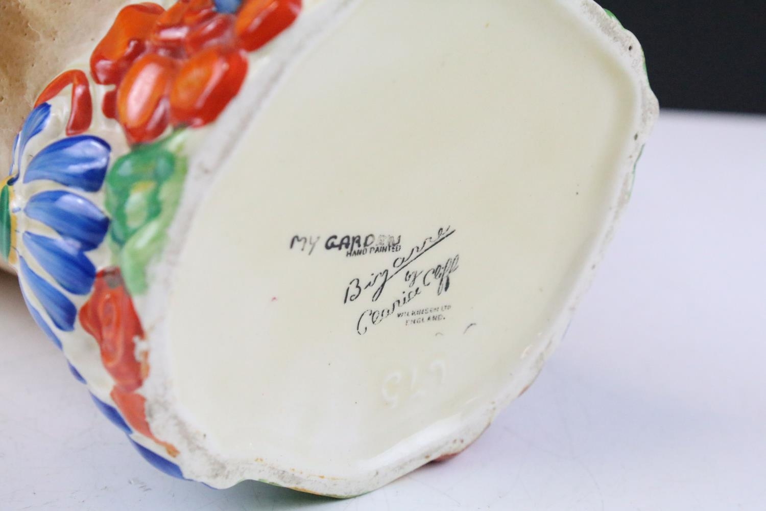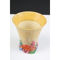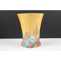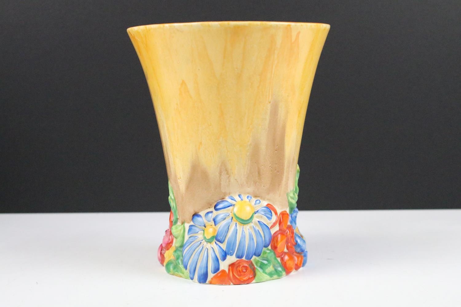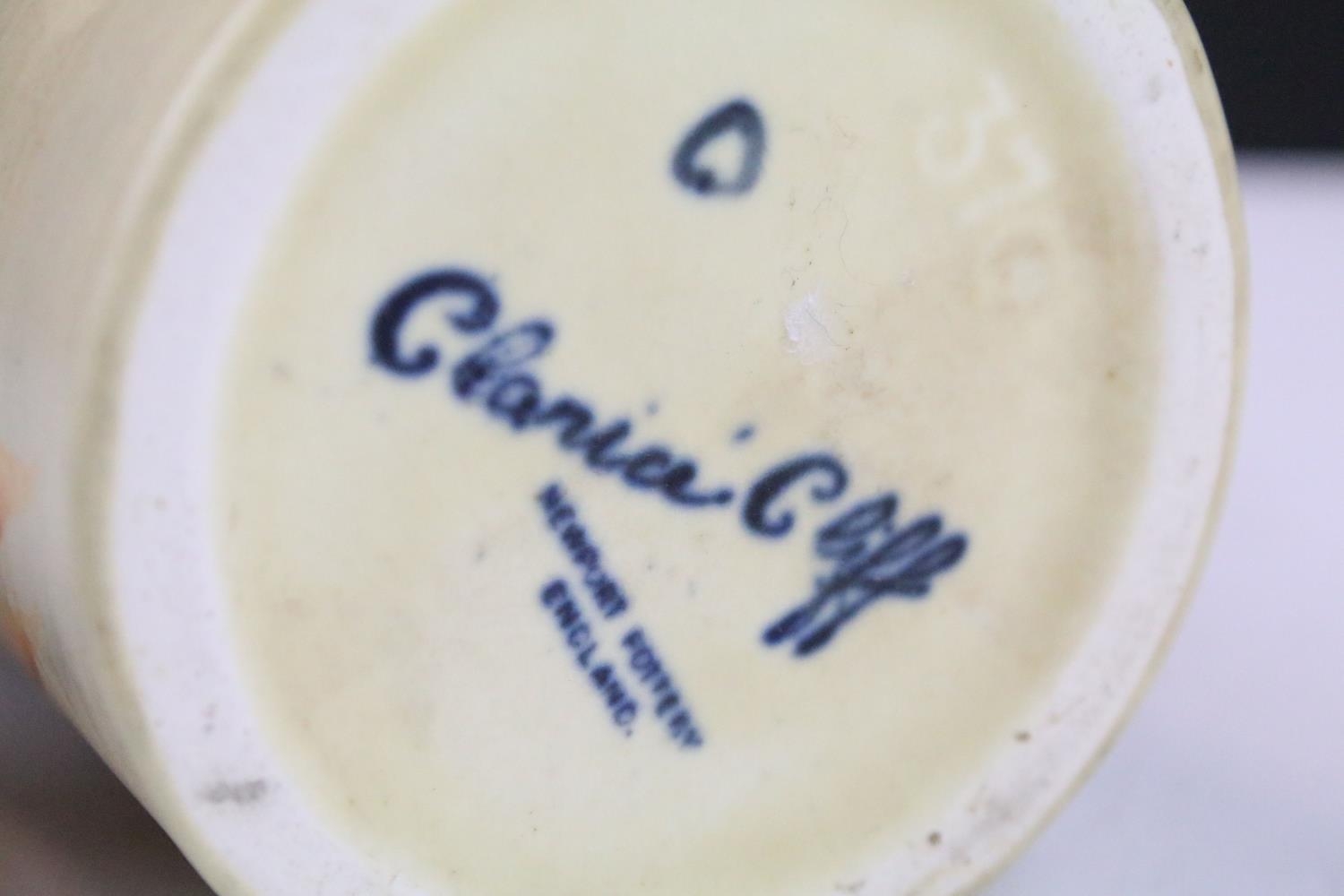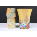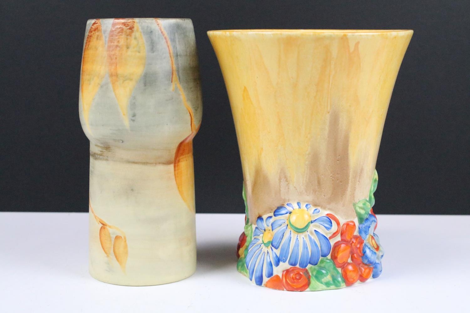 Two Clarice Cliff vases to include a Bizarre 'My Garden' pattern vase with moulded florals to the base and a leaves pattern vase. Measures 17 and 18cm tall.