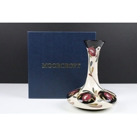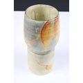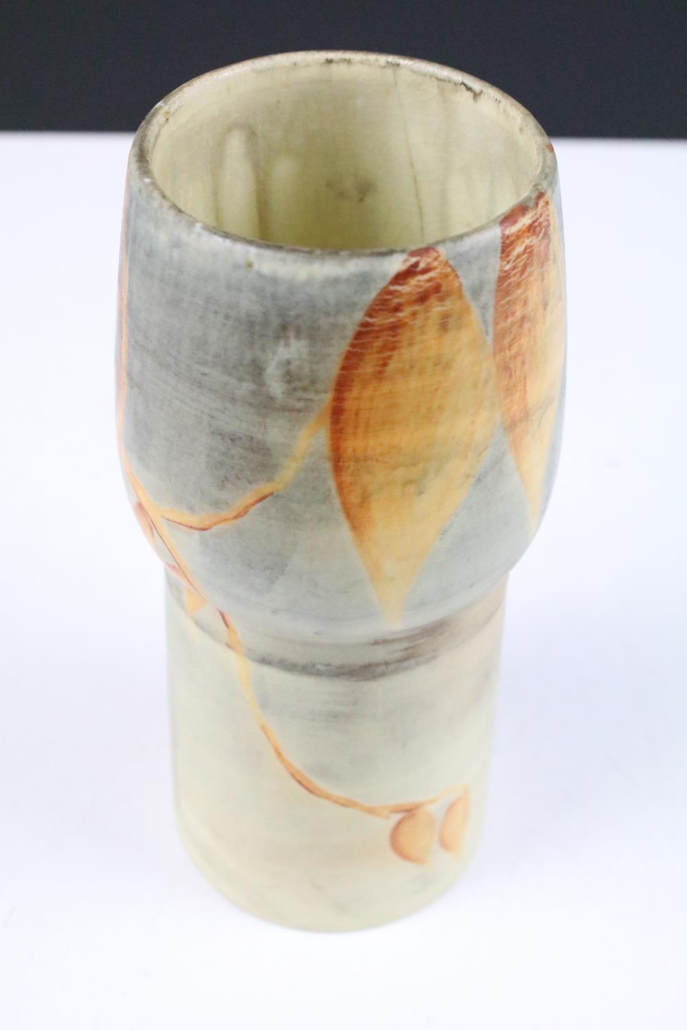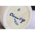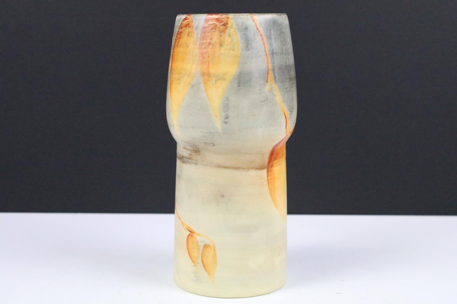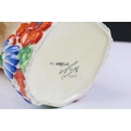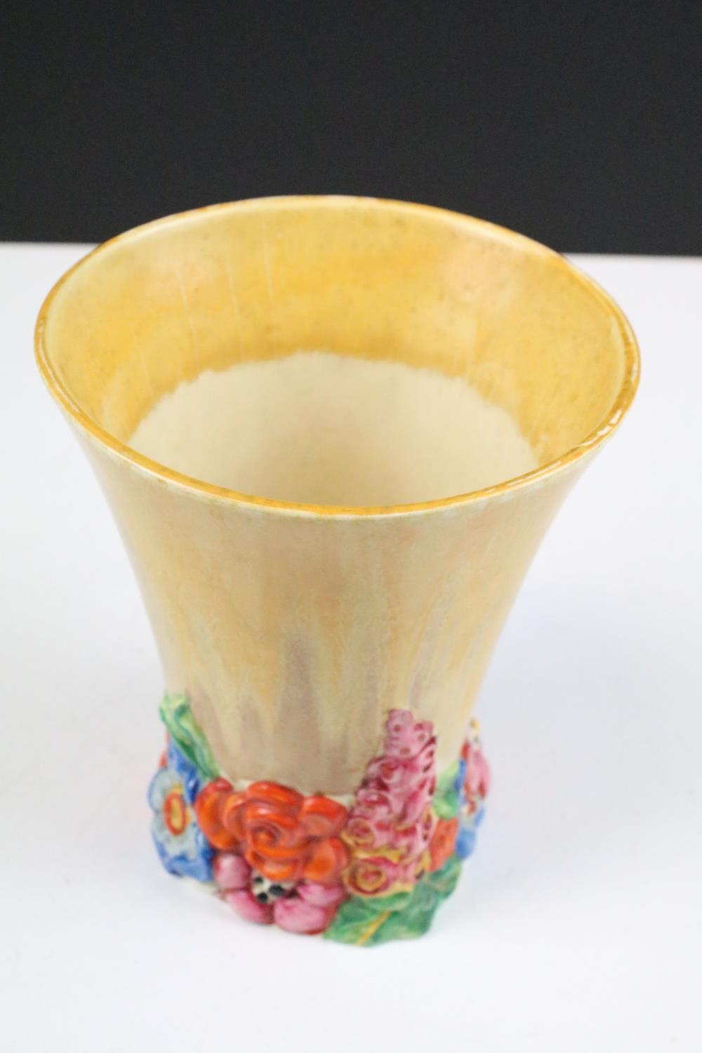 Two Clarice Cliff vases to include a Bizarre 'My Garden' pattern vase with moulded florals to the base and a leaves pattern vase. Measures 17 and 18cm tall.