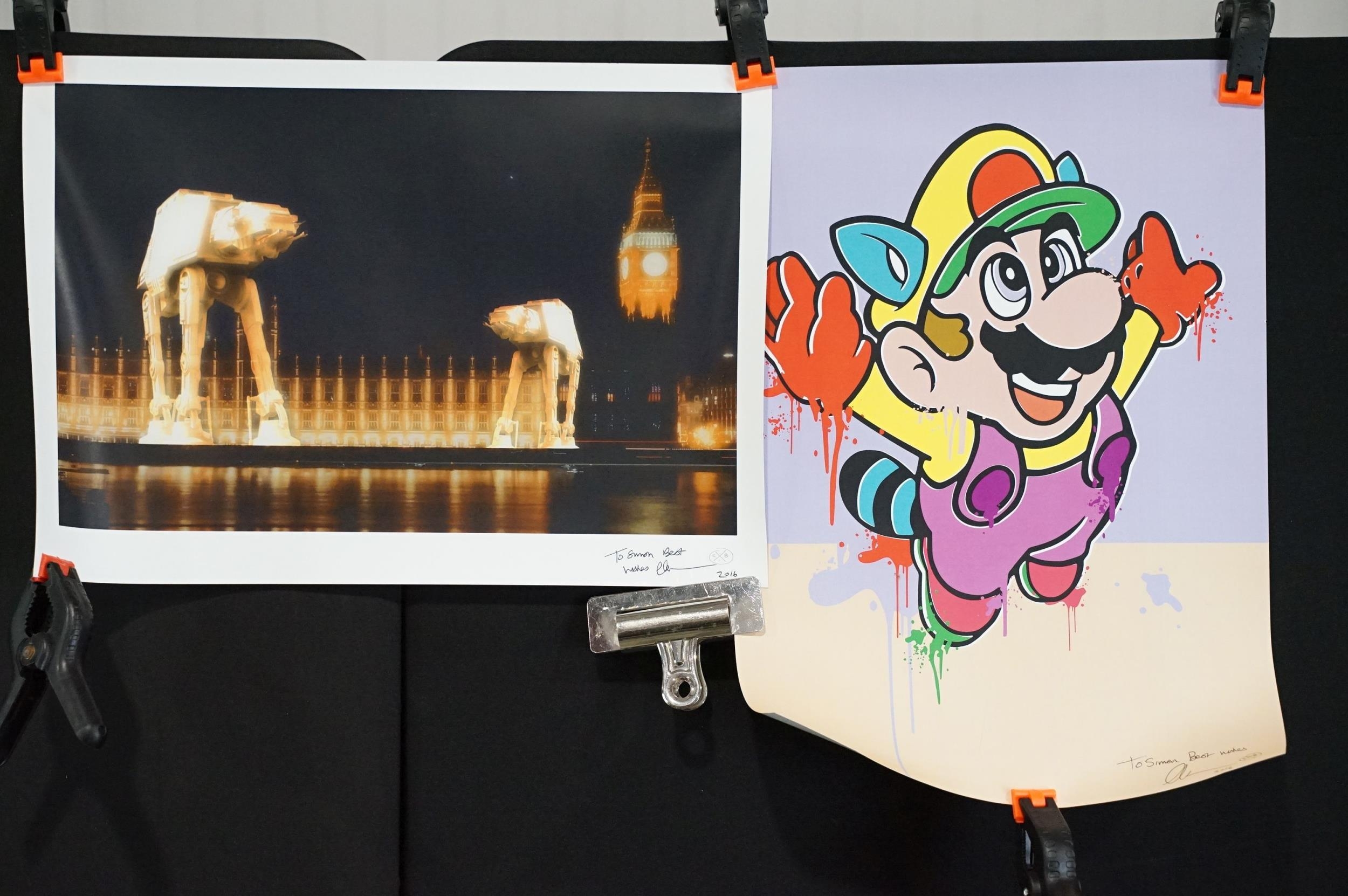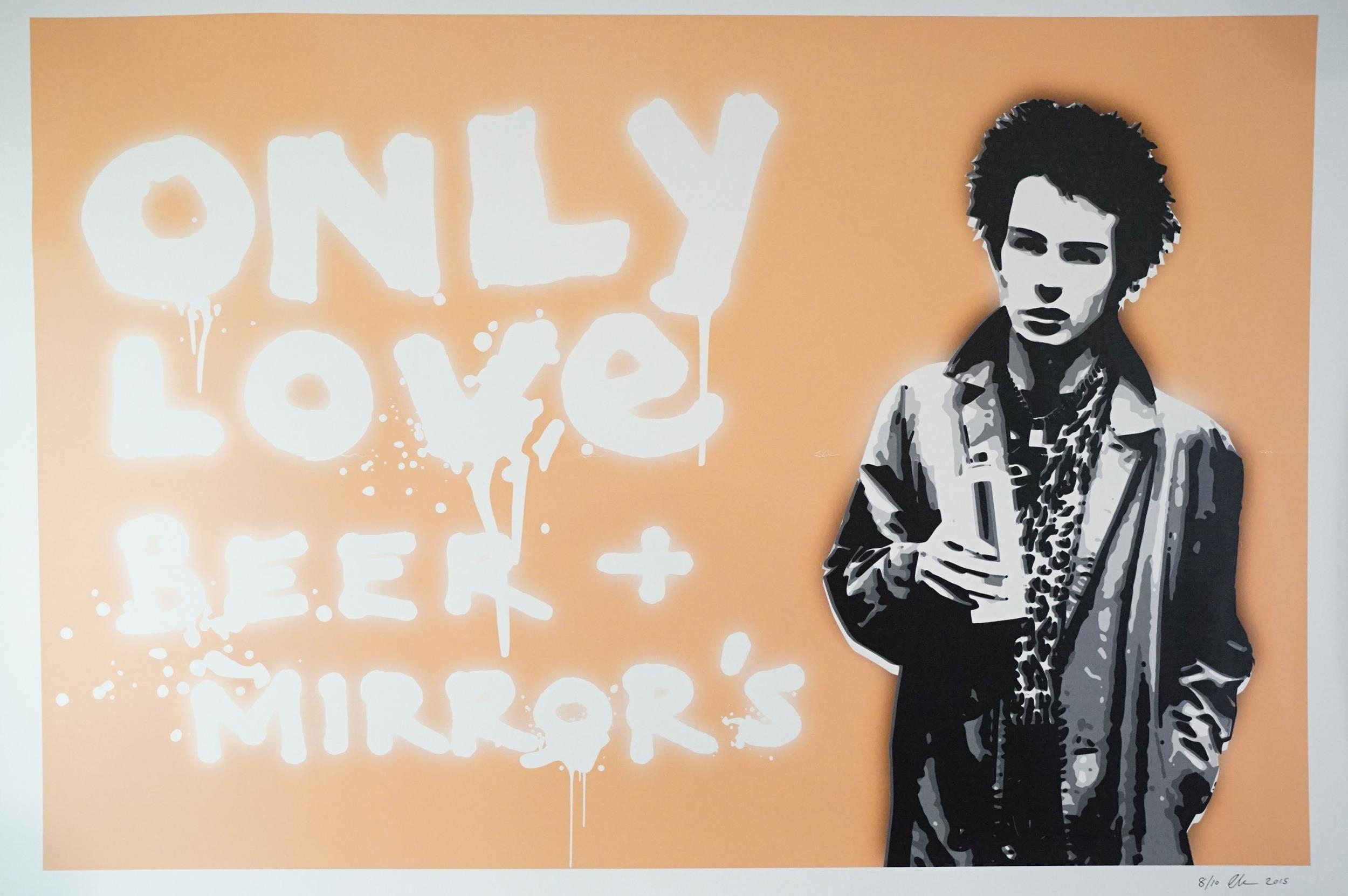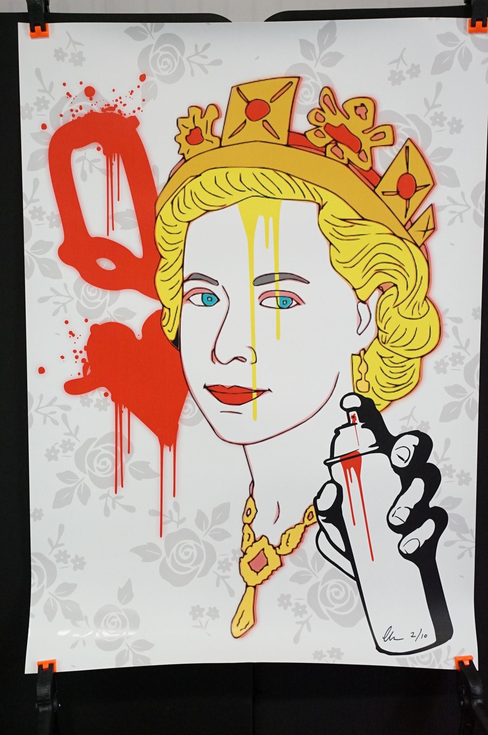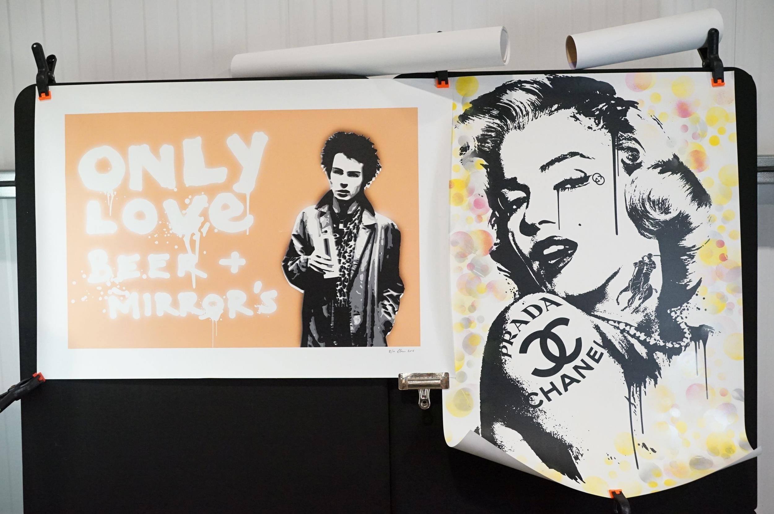 Memorabilia - 6 Punk prints / Art prints by Chris Boyle to include: Sid Vicious Only Love Beer + Mirrors numbered and signed print from 2015, this one is number 8/10, 23 1/2in x 33in, 59 1/2cm x 84cm. In EX condition, rolled. The Queen signed and numbered 2/10, 23 1/2in x 33in, 59 1/2cm x 84cm. In EX condition, rolled. Yellow Trooper signed and numbered 35/100, 23 1/2in x 33in, 59 1/2cm x 84cm. EX (rolled), Prada Chanel, 2016 signed, 23 1/2in x 33in, 59 1/2cm x 84cm. EX (rolled), Super Mario 2016 signed and dedicated, 16 1/2” x 11 3/4” / 32cm x 29 1/2cm. EX rolled. Imperial A T’s over London signed and dedicated, 23 1/2in x 33in, 59 1/2cm x 84cm. EX (rolled)