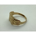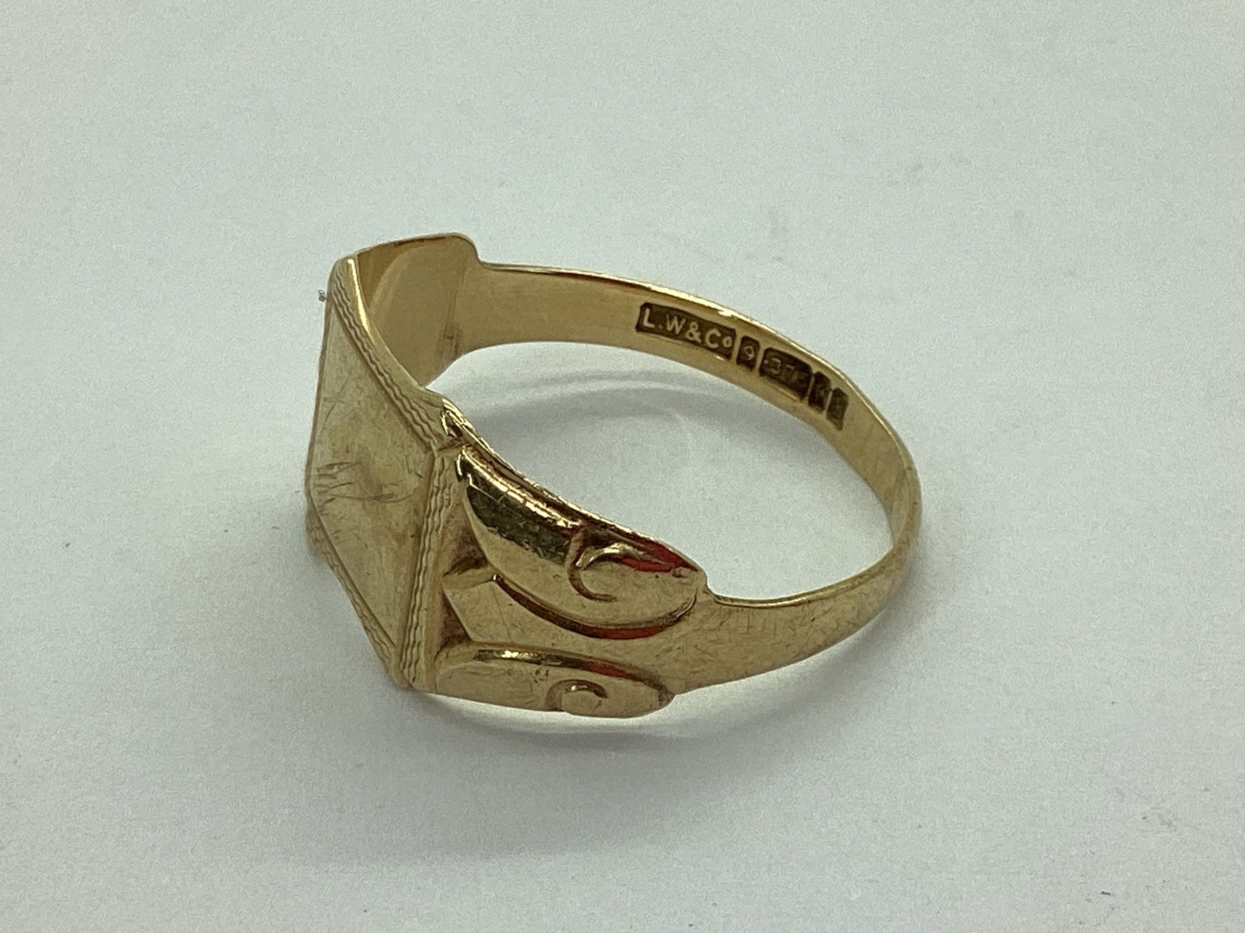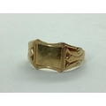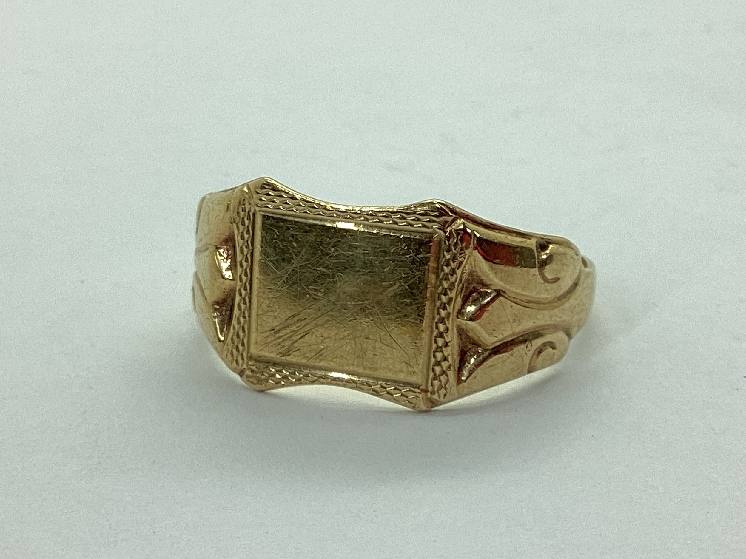 A 9ct Gold Signet Ring, the plain rectangular panel between decorative shoulders (finger size T) (2.8grams).