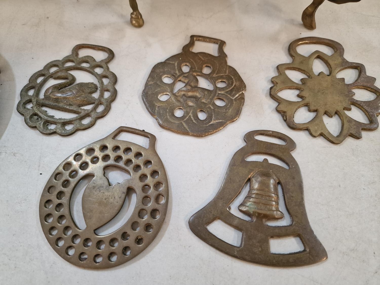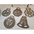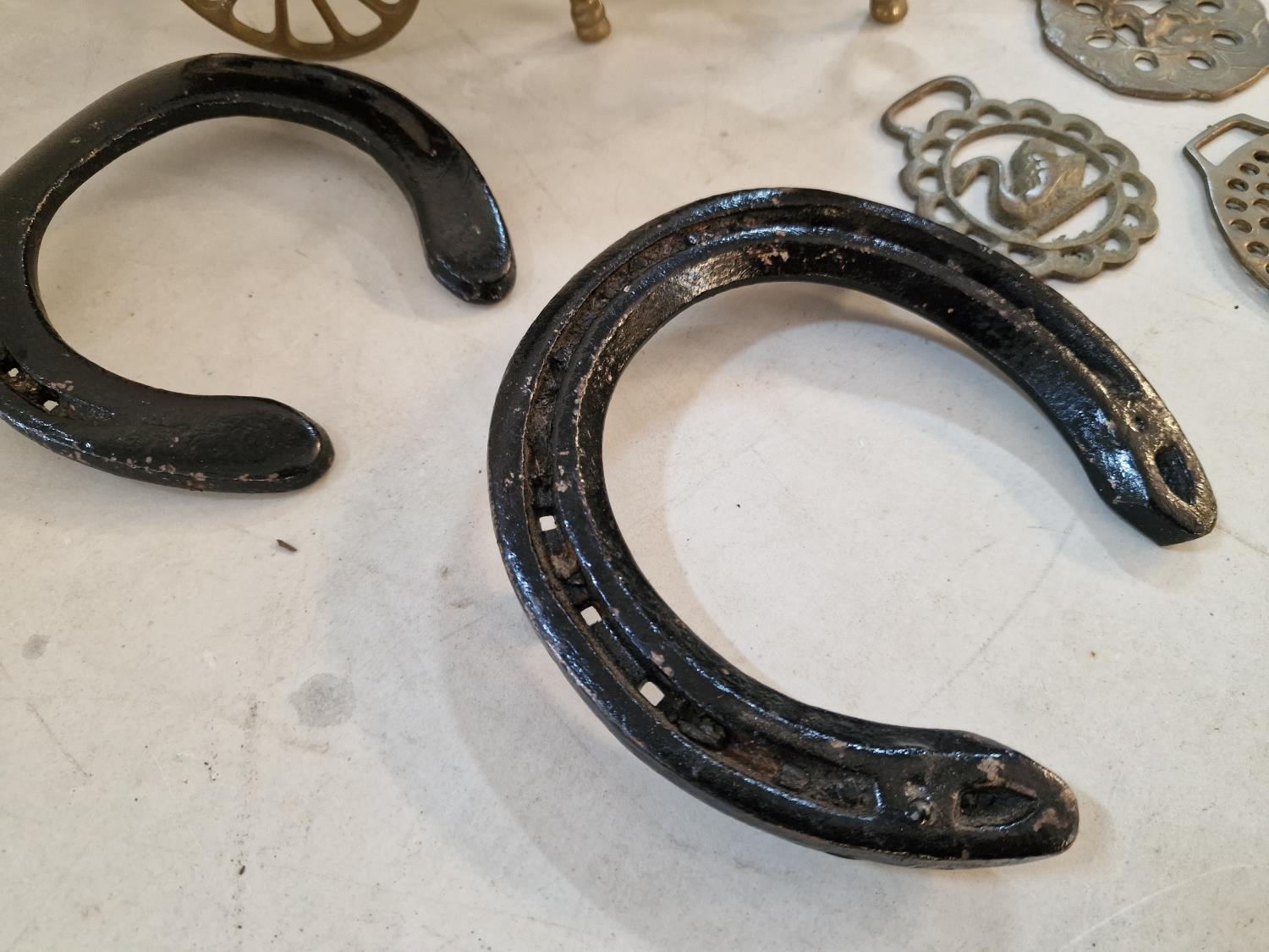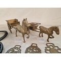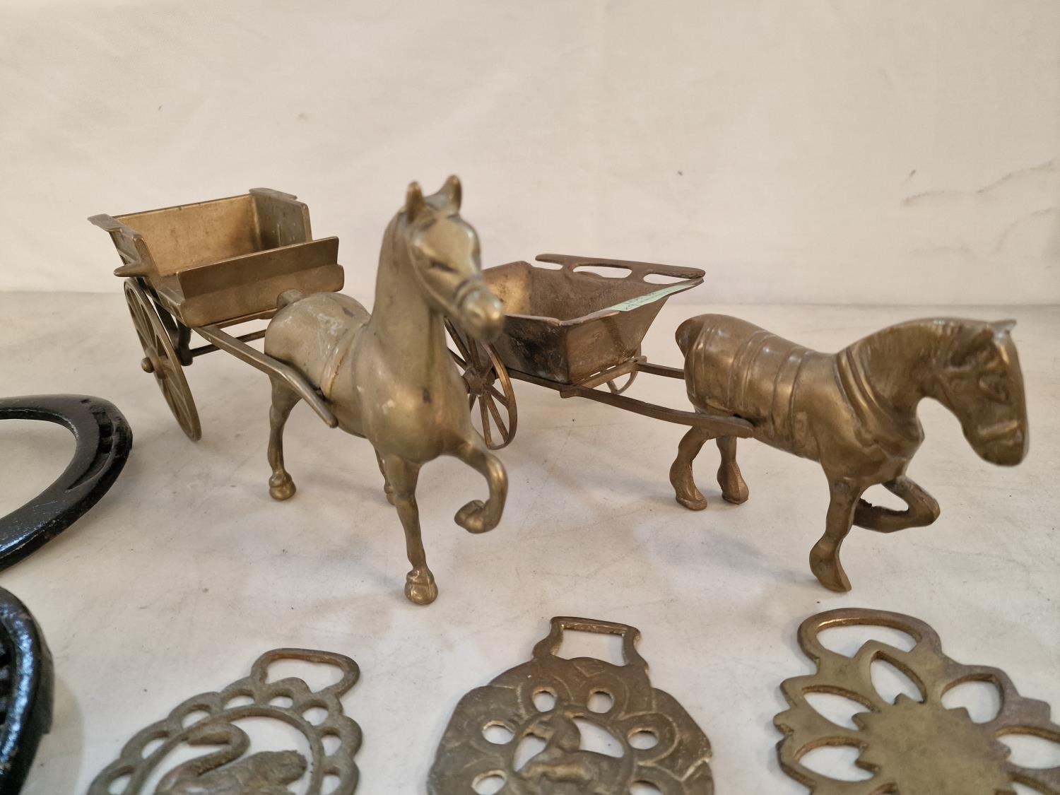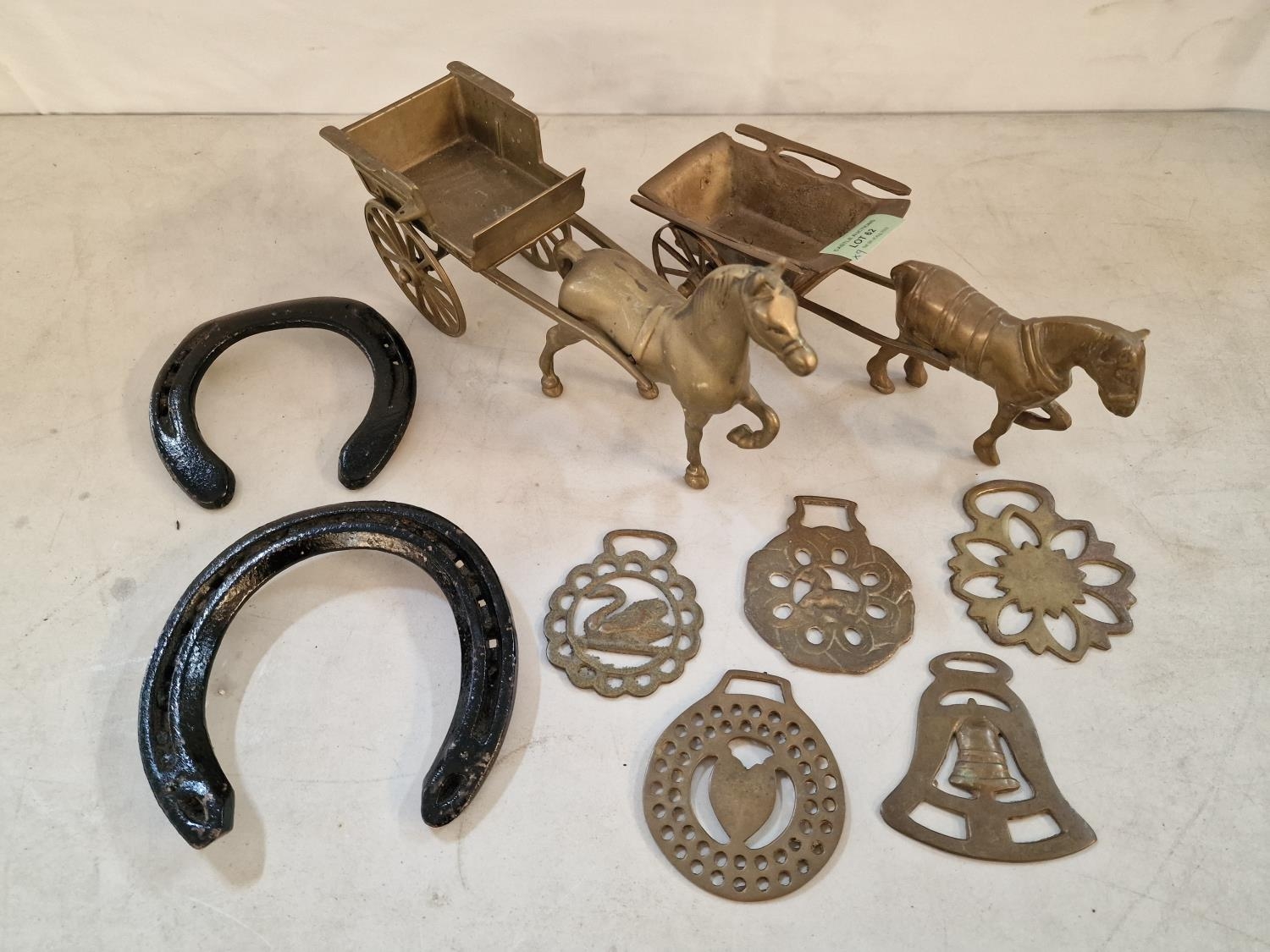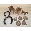 2 x Brass Horse & Carts, Together with Collection of 5 x Horse Brasses and 2 x Horse Shoes