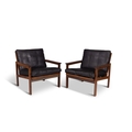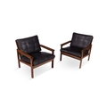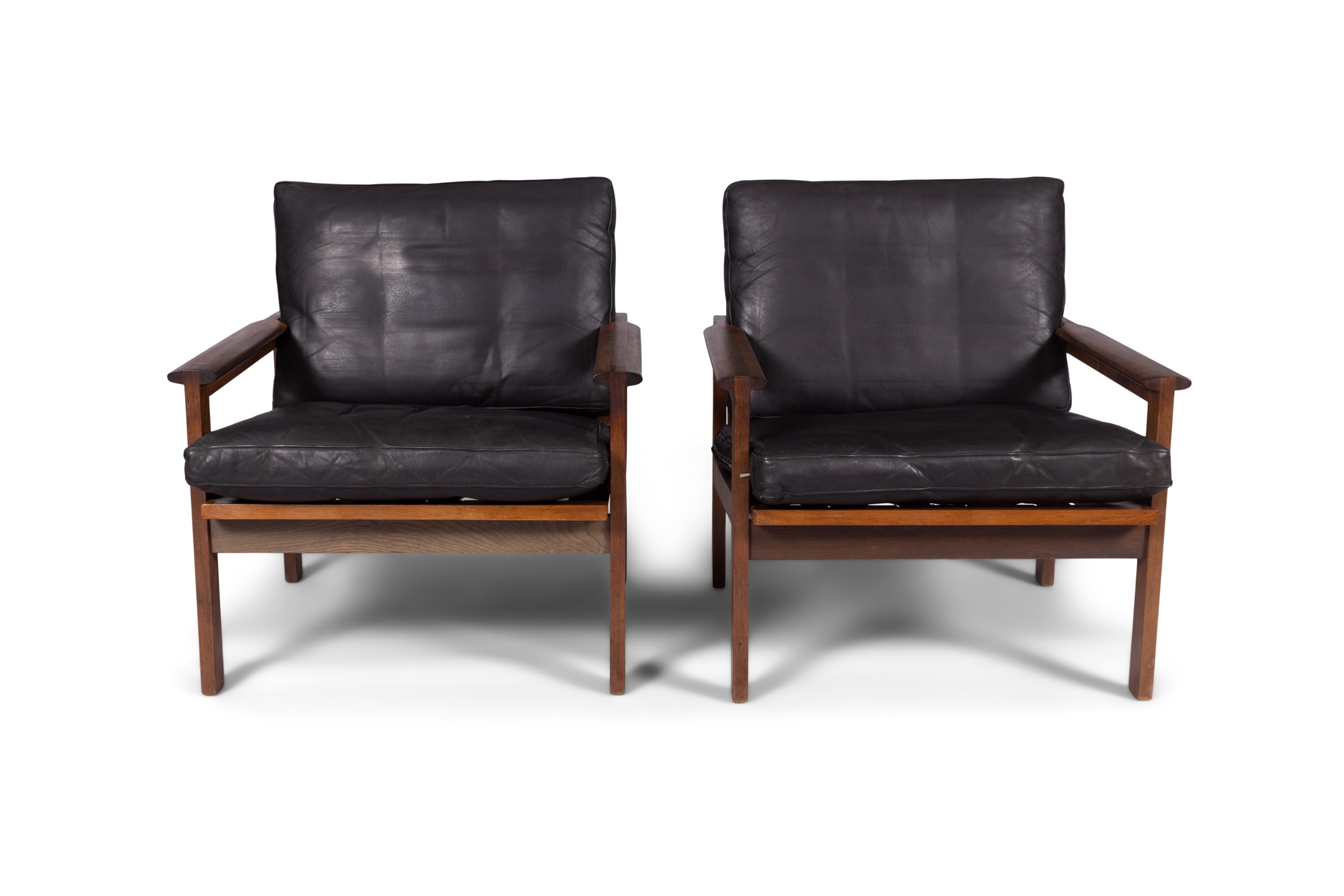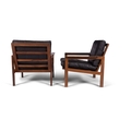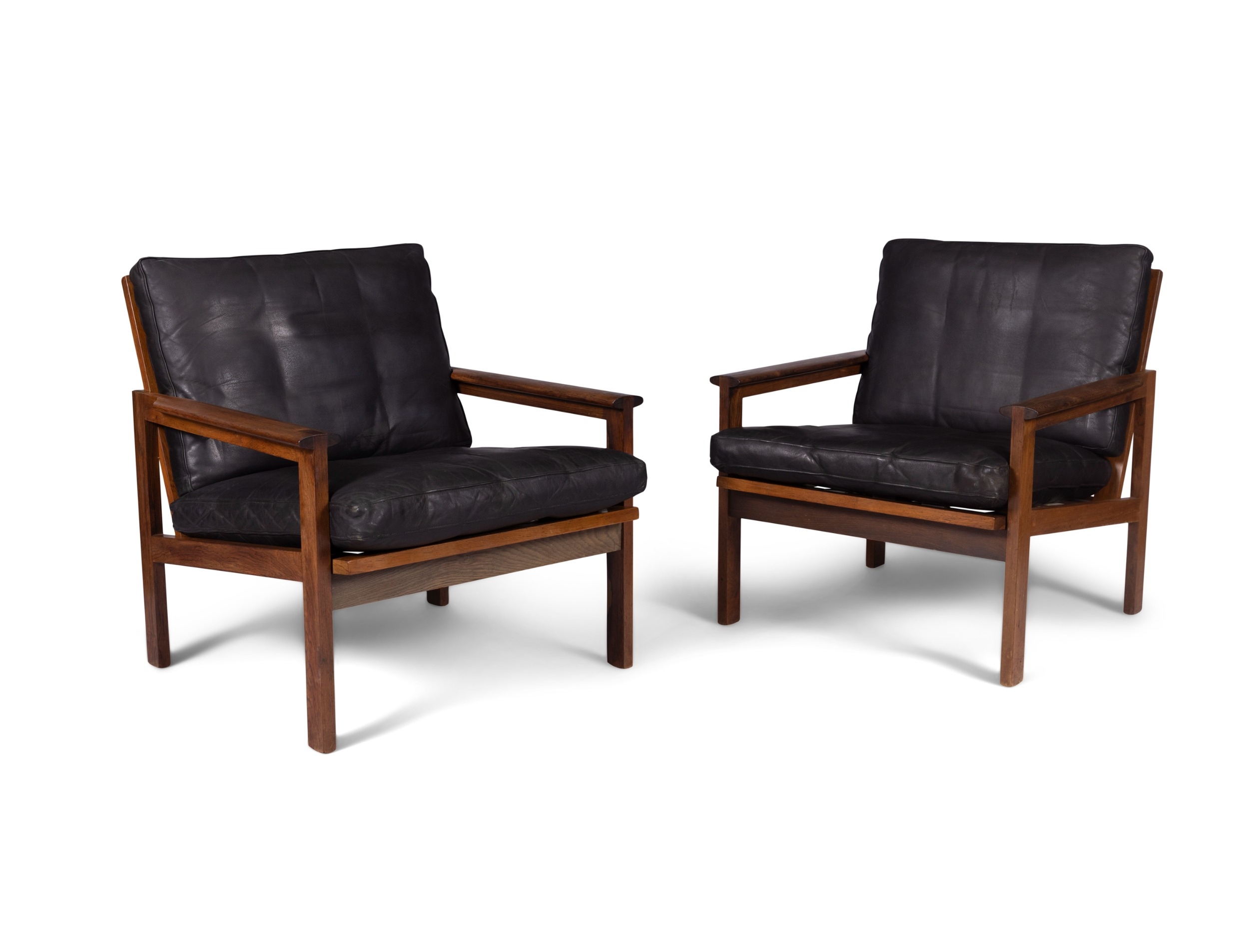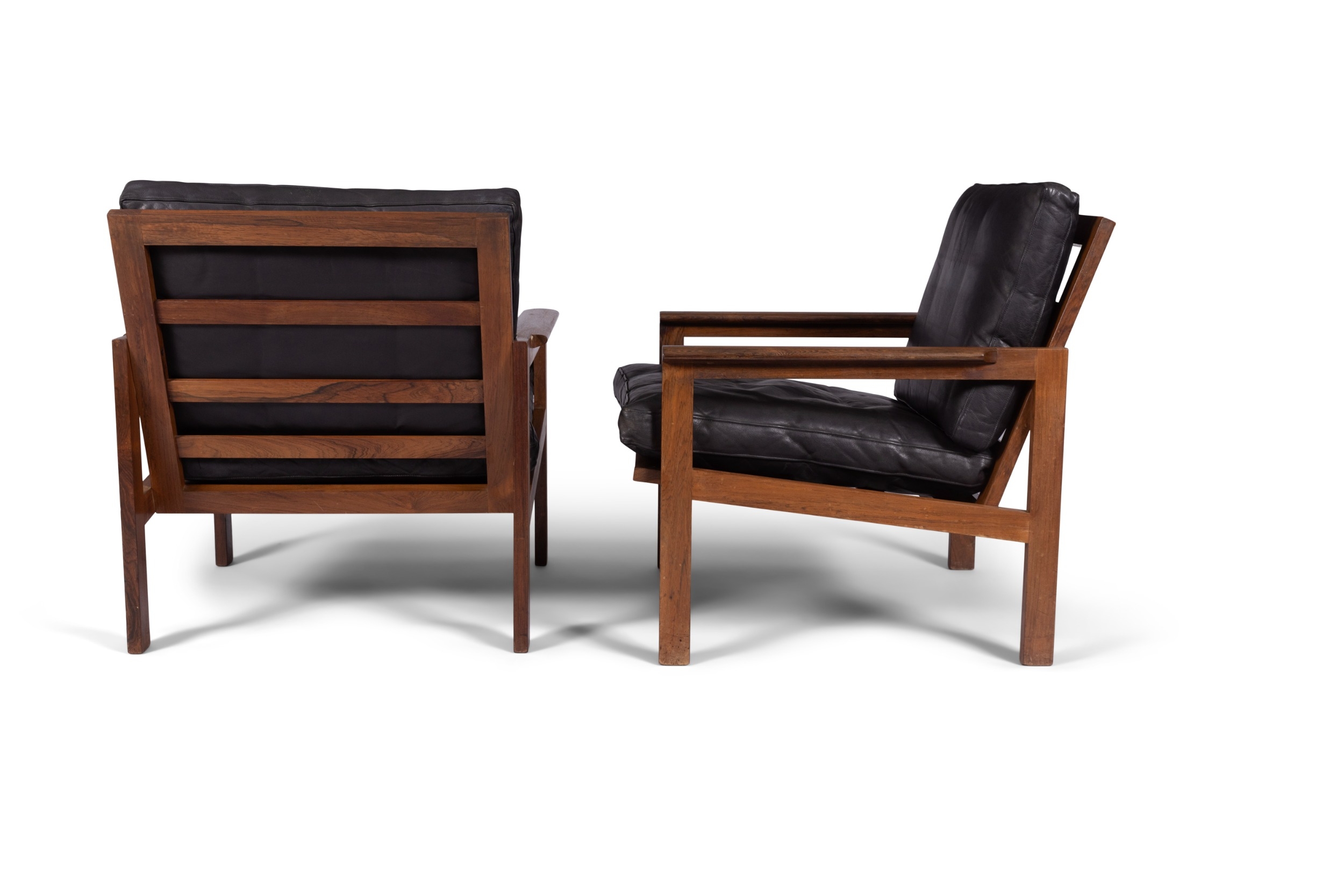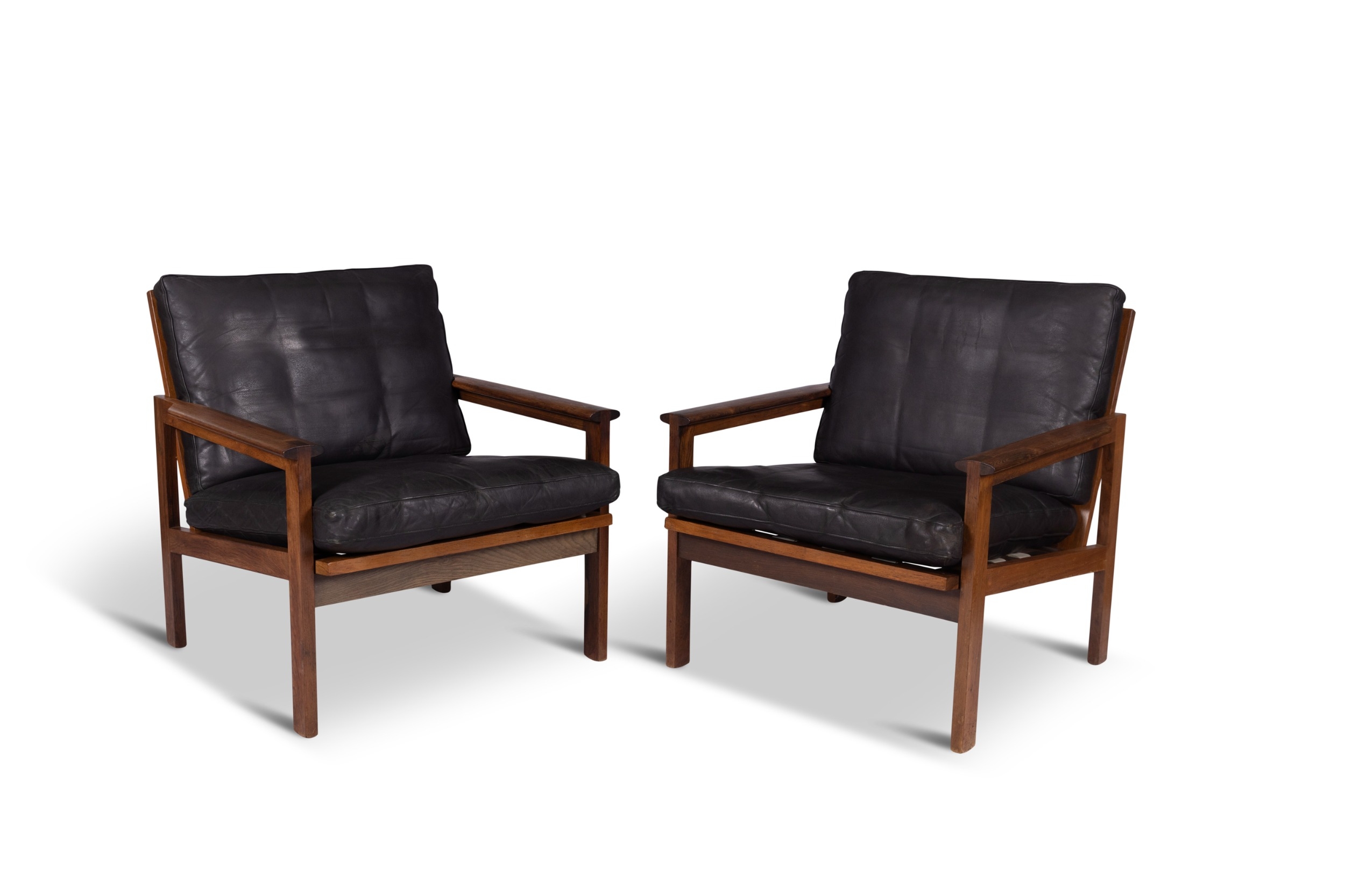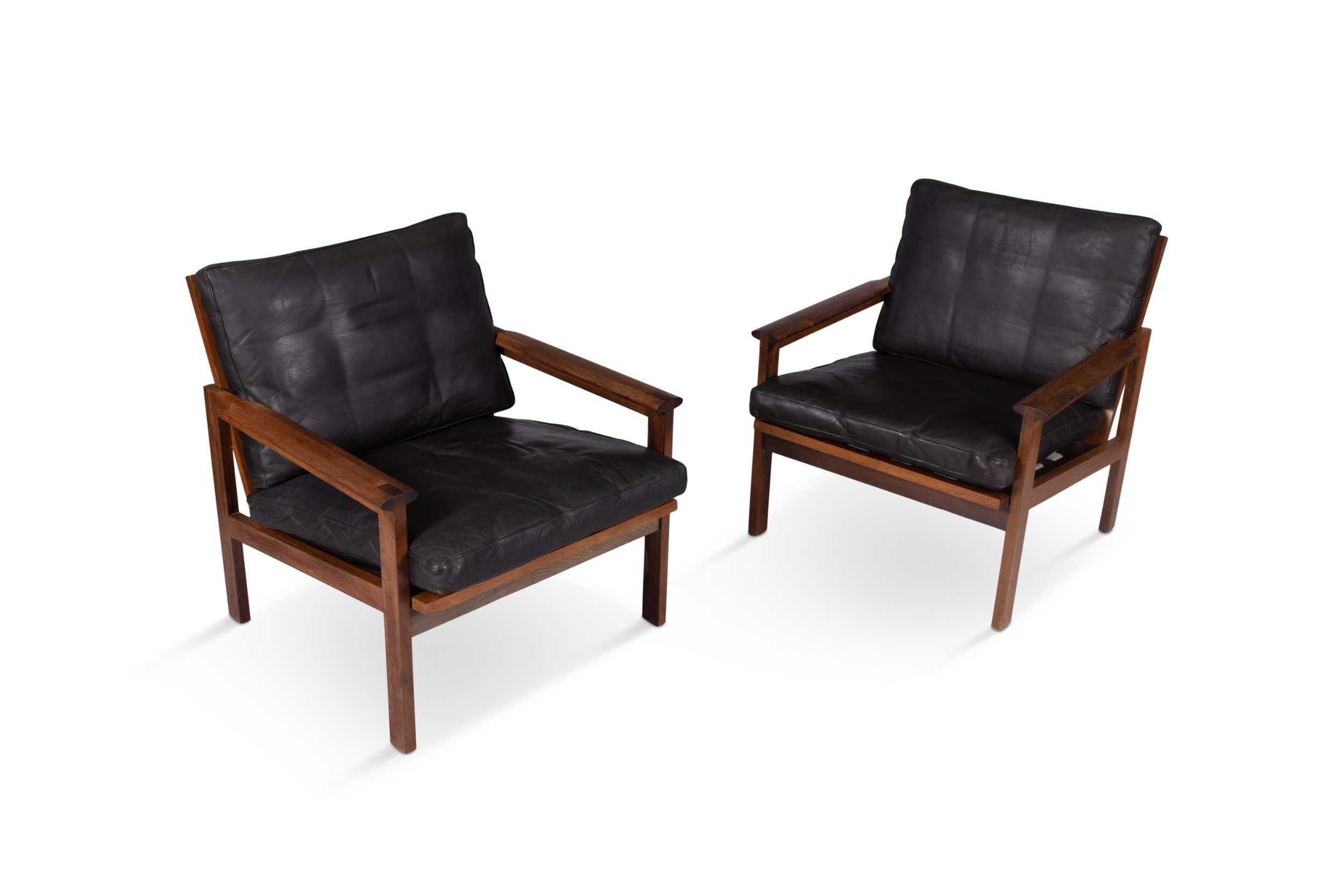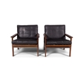 ILLUM WIKKELSØ (1919-1999) A pair of rosewood armchairs by Illum Wikkelsø with loose black leather cushions. Denmark, c.1960. 67 x 72 x 75cm (h); Seat 42cm (h)