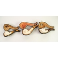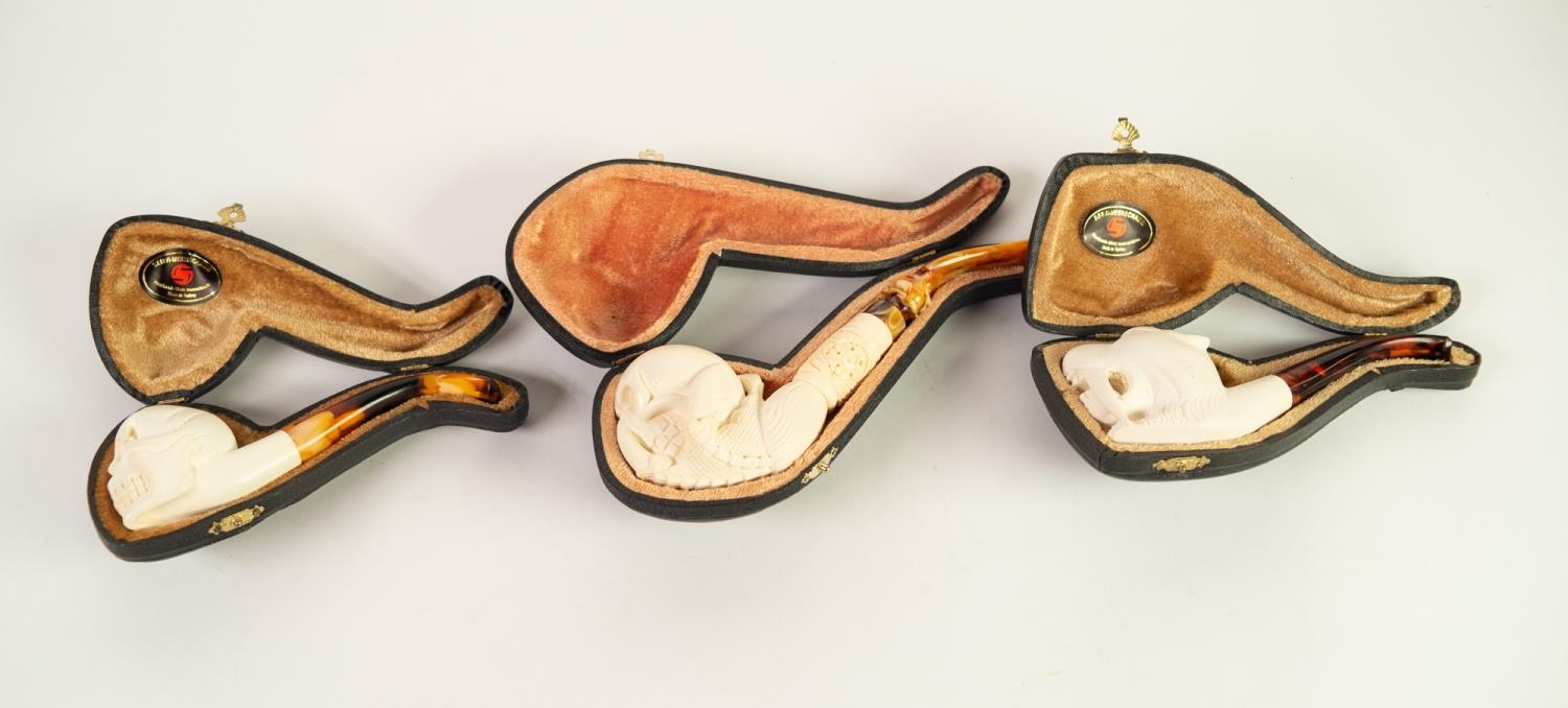 THREE MODERN SERVI-MEERSHAUM SMOKING PIPES IN CASES, one carved as a claw holding a skull, (used), another as a sabre toothed tiger and the third as a skull, both unused, (3)