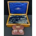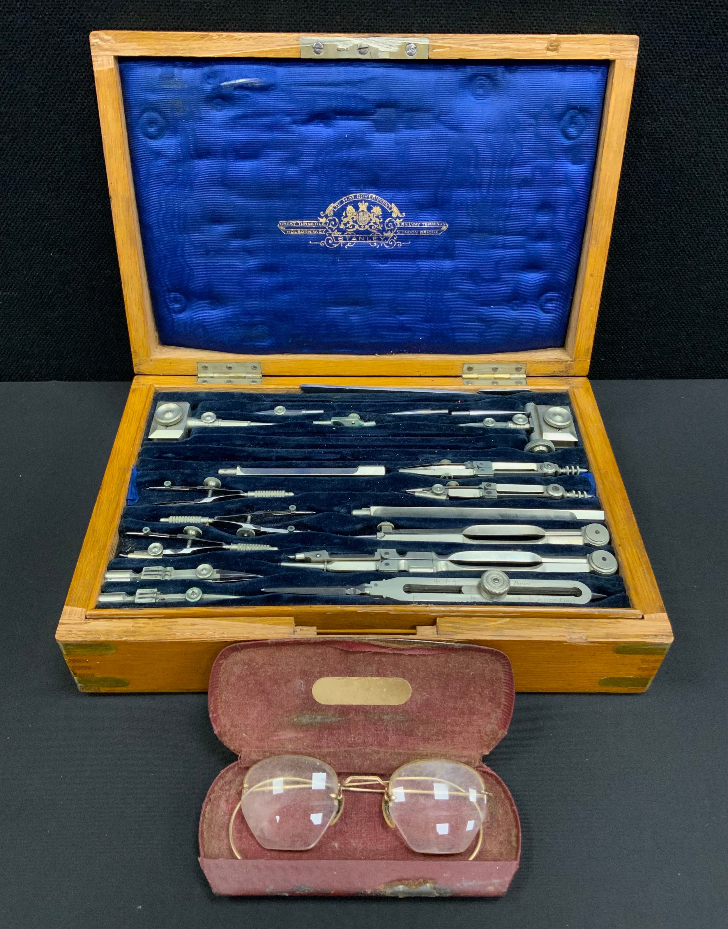 An early 20th century Stanley draughtsman's drawing implement's set, with assorted tools, adjustable angle rule etc, brass bound oak case etc