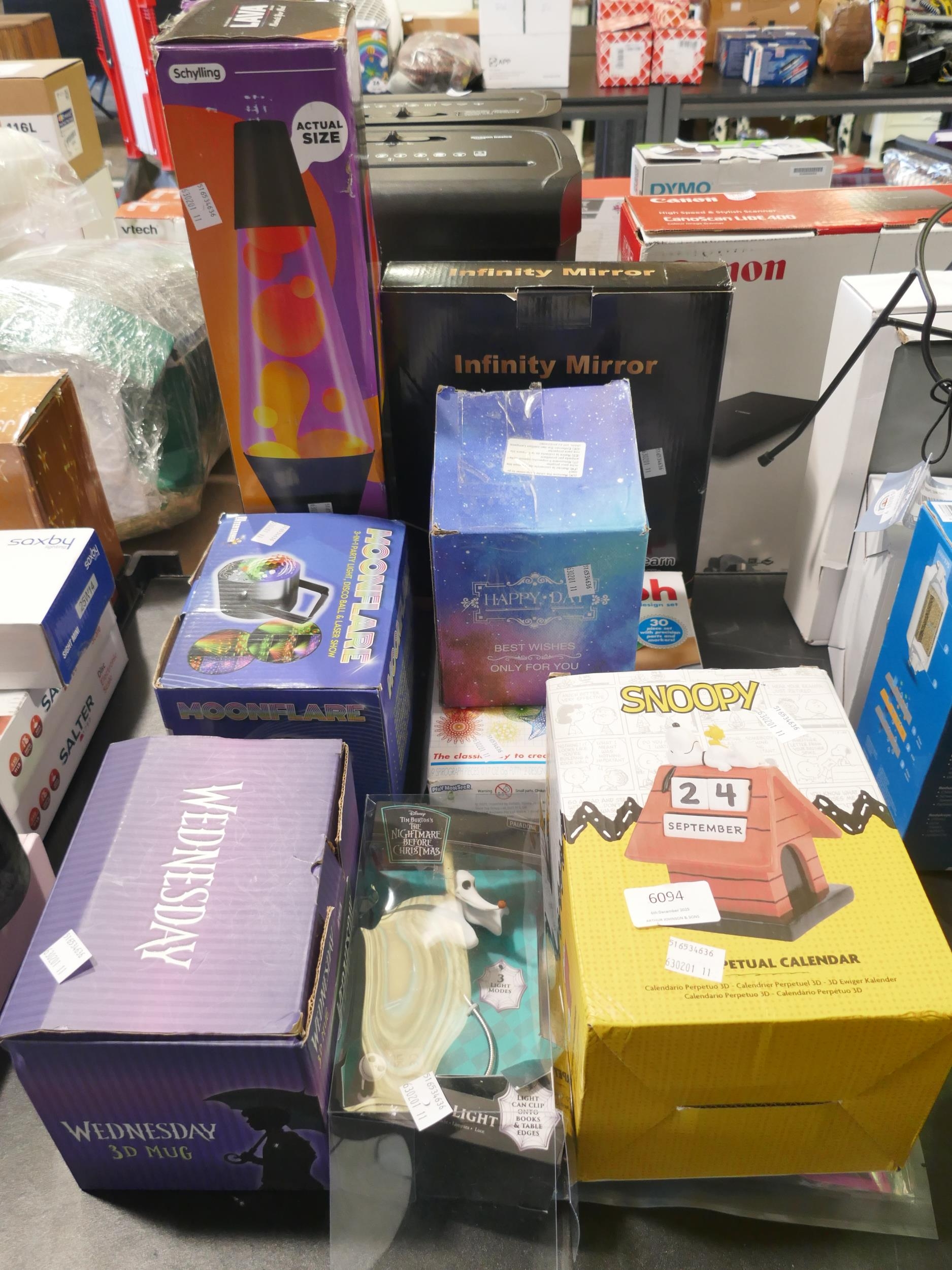 An infinity mirror, Spirograph, Happy Day light, Snoopy 3D calendar, lava lamp, moon flare, Wednesday 3D mug and a Disney clip light *This lot is subject to VAT