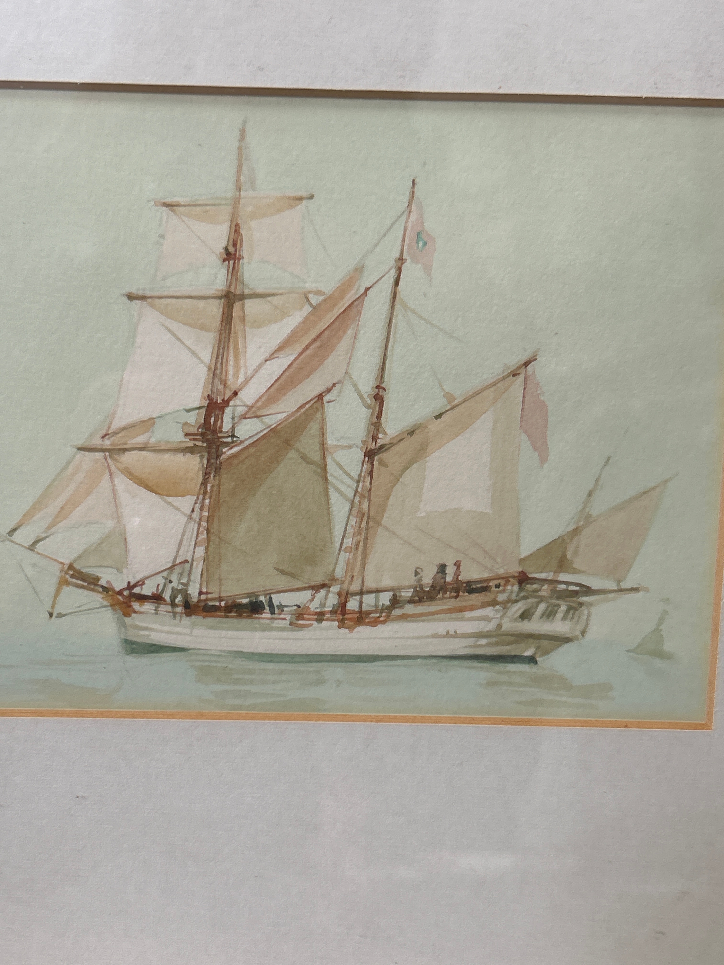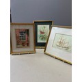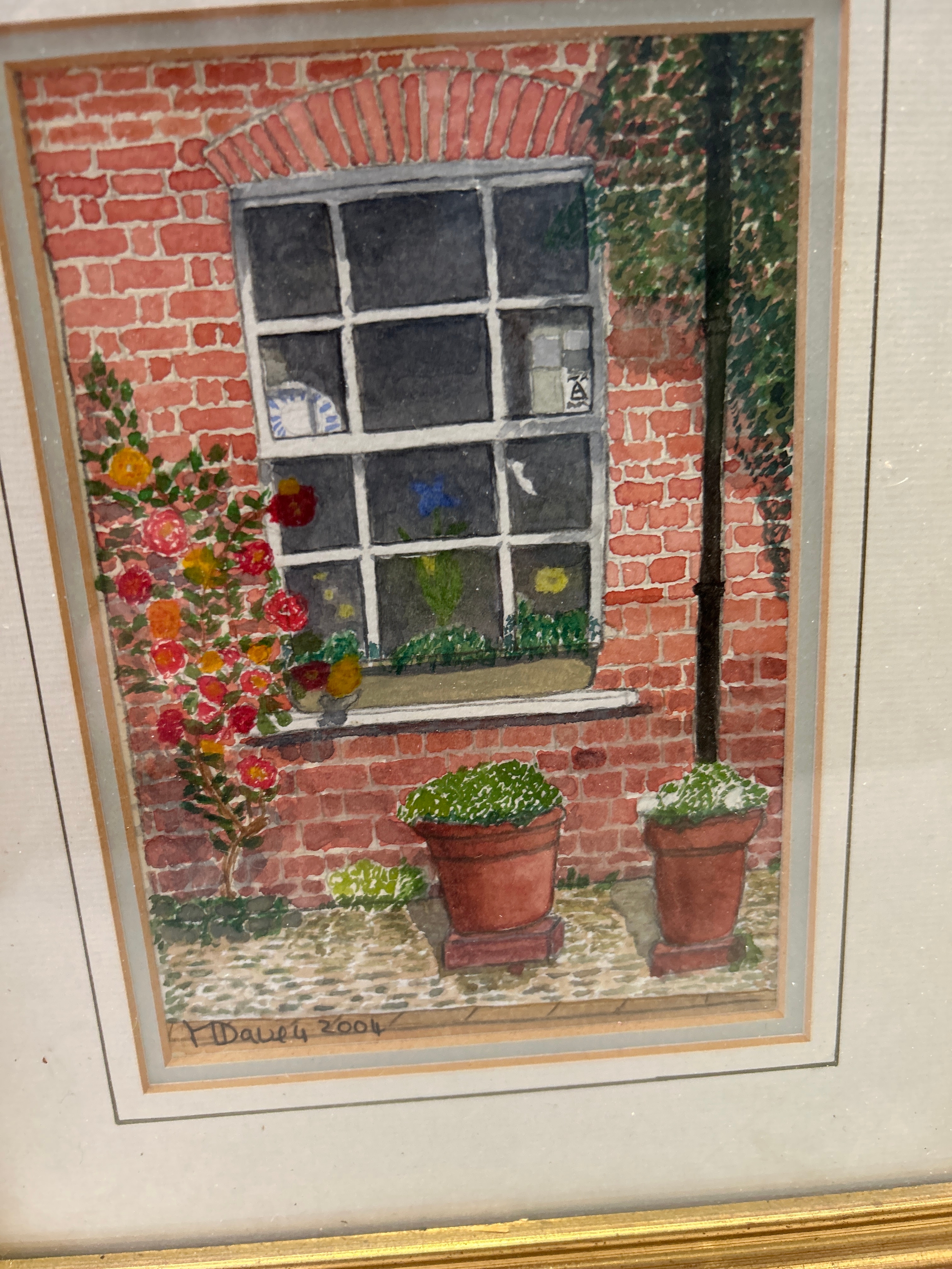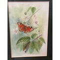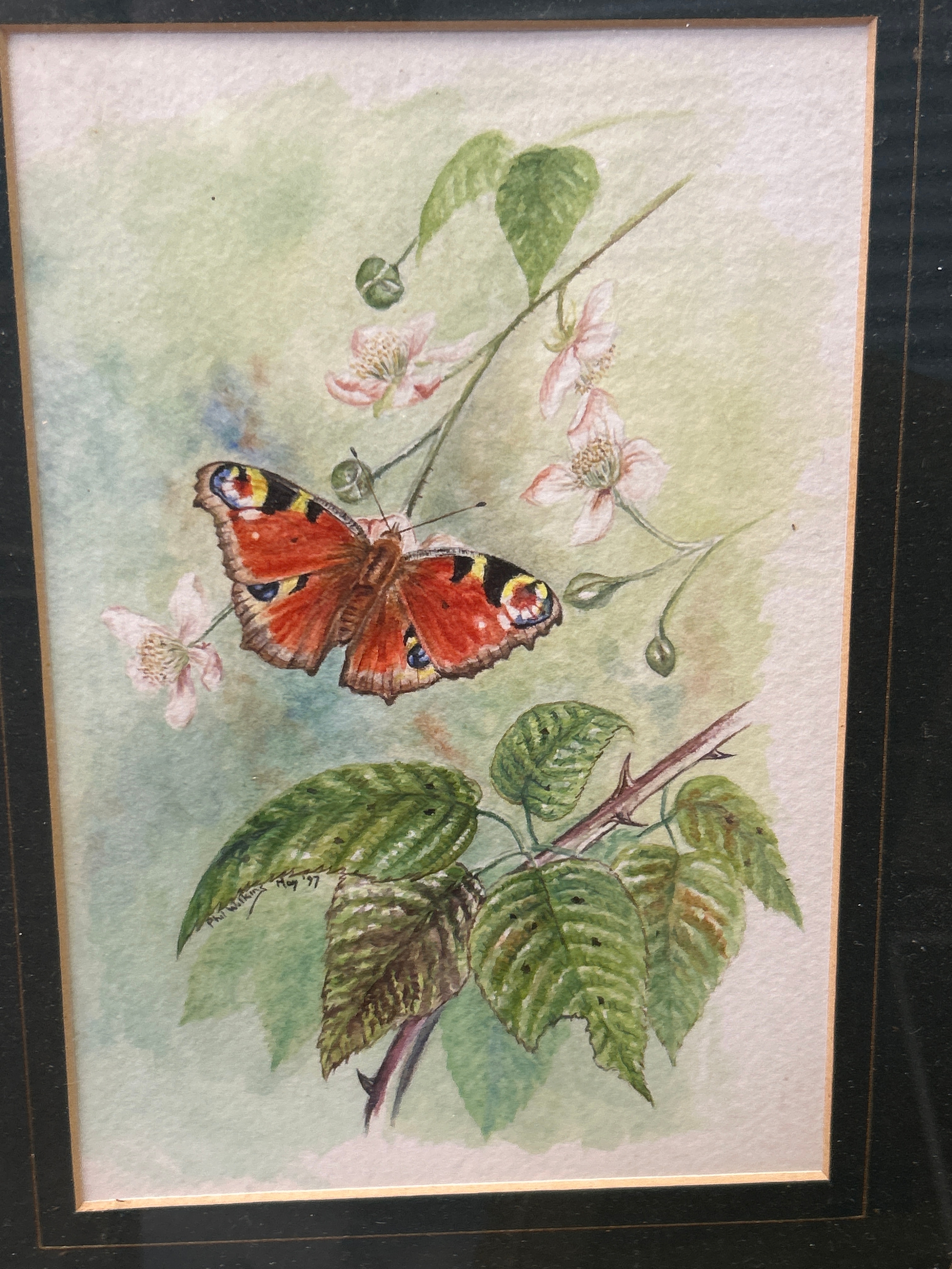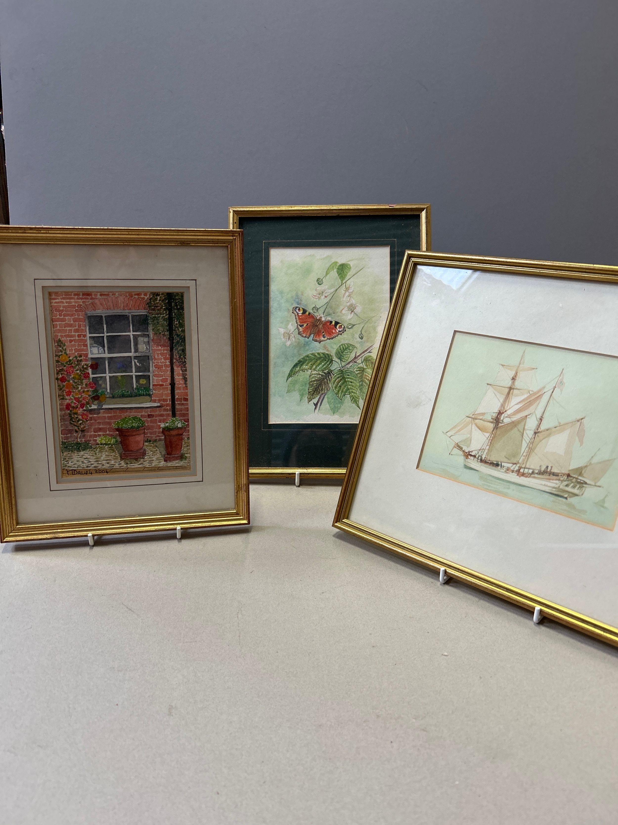 Three original watercolours including a yacht “Sultan of the Maldives” by Pat Jobson, Butterfly on Brambles by Phil Wilkins 1997 and Cottage window, Burnham Market by M Davey 2004.