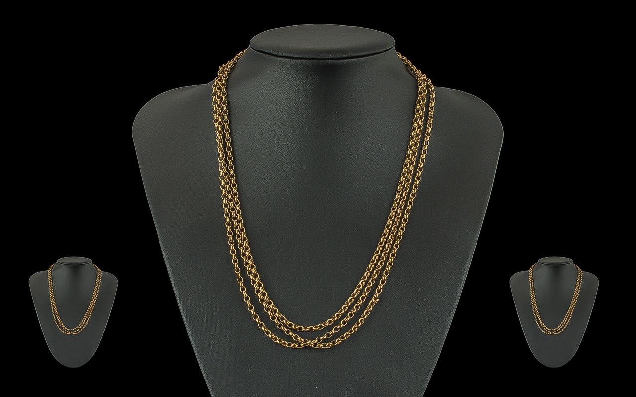 Victorian Period Pleasing Quality Ladies 9ct Gold Belcher Chain of long length, marked 9ct, good warm colour, confirm with photo; weight 28.7g, length 58 inches (145cms), excellent condition to all aspects