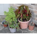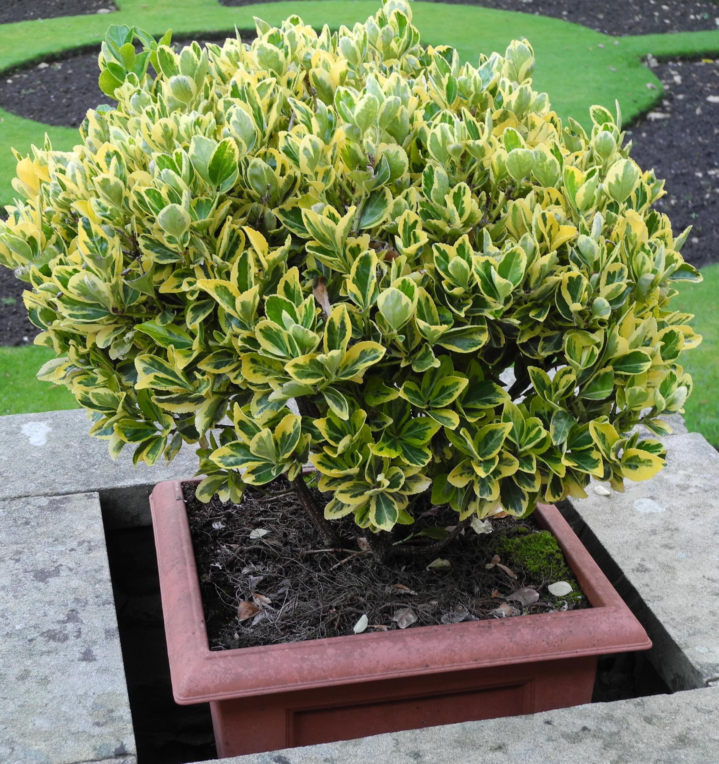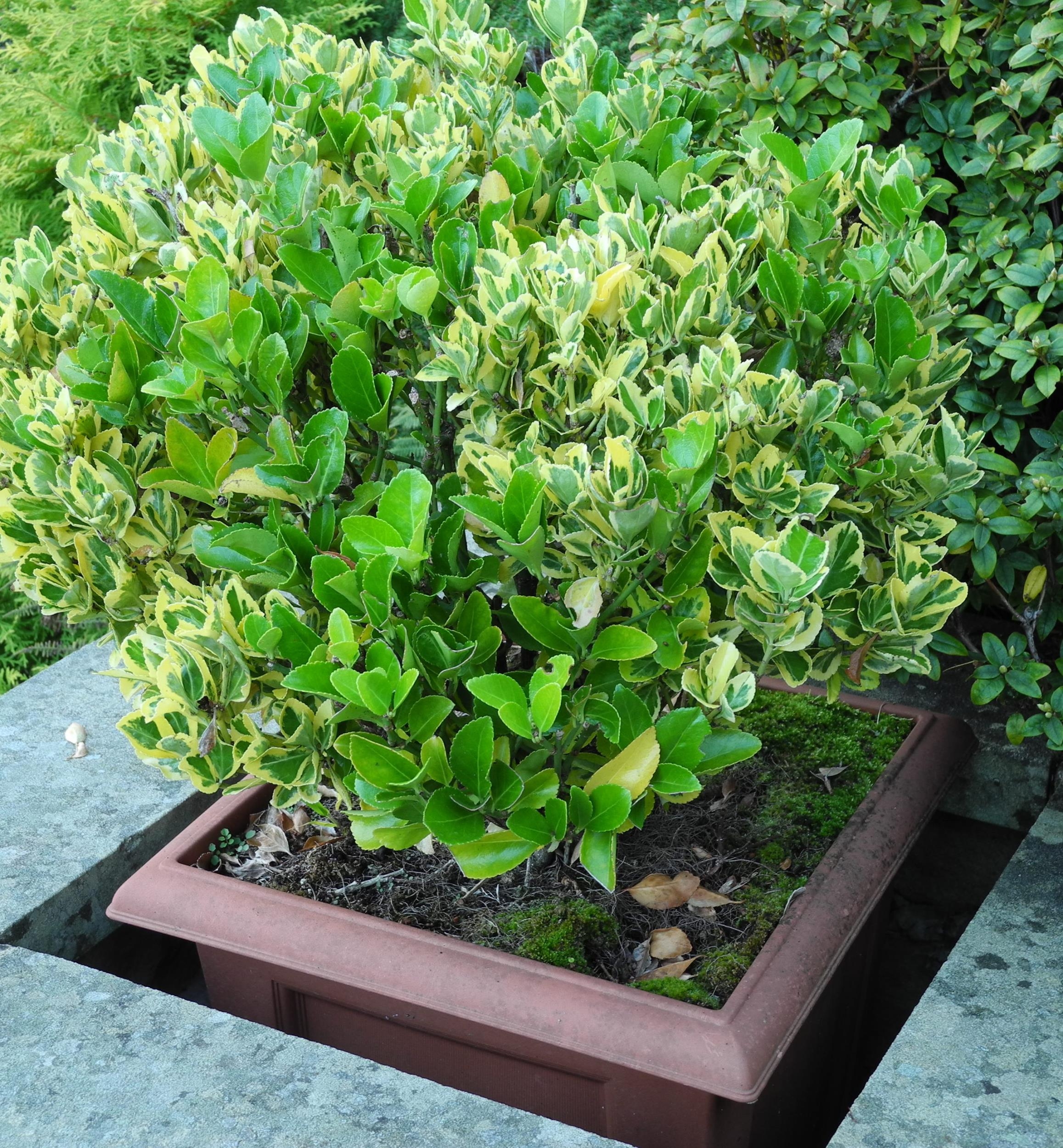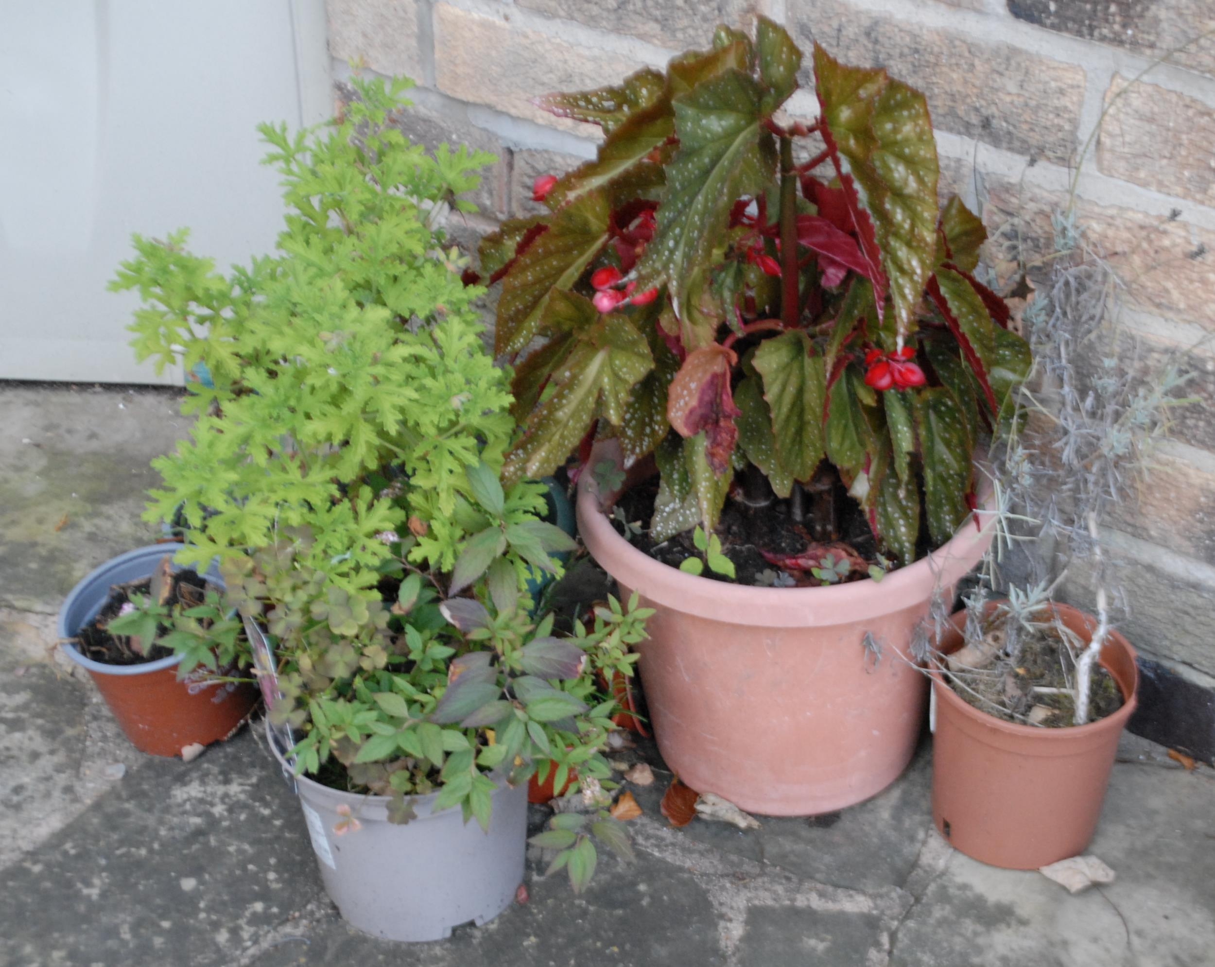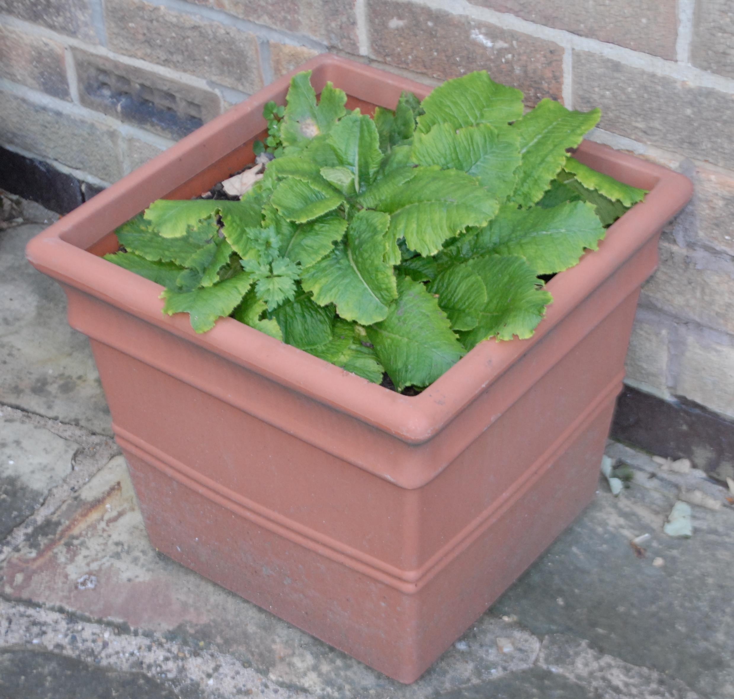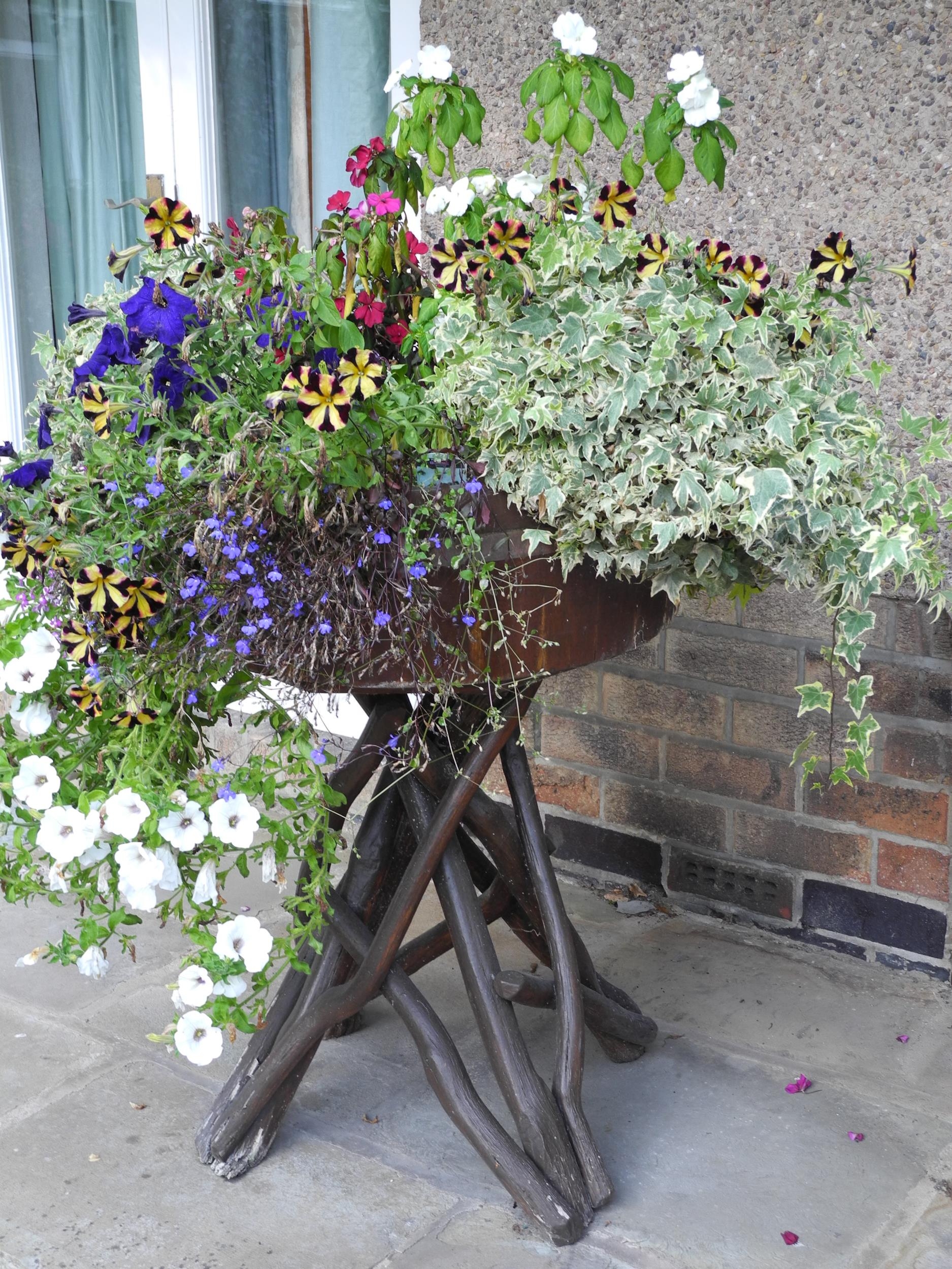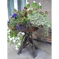 Garden planters, rustic base; two shrubs, etc