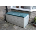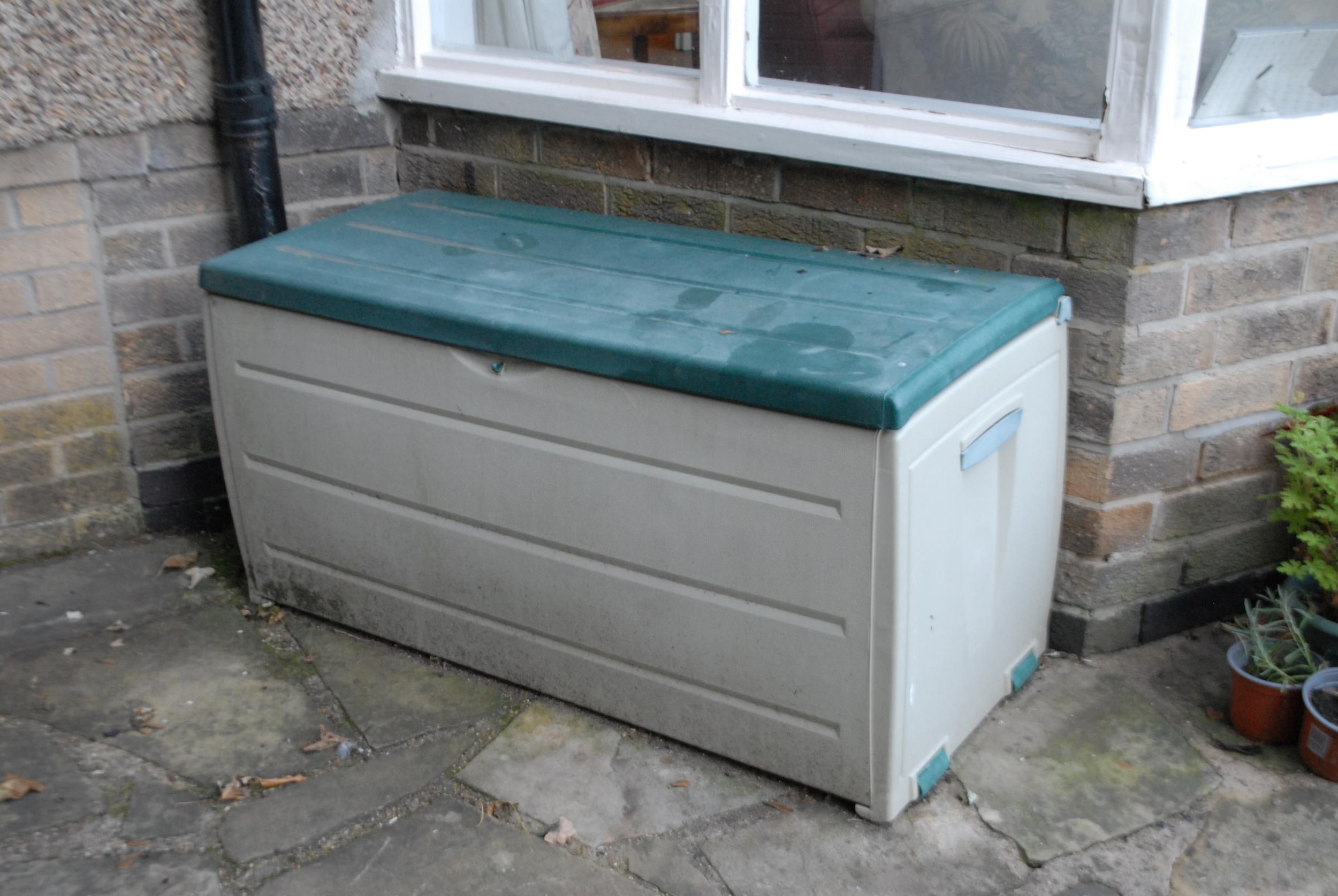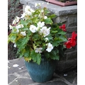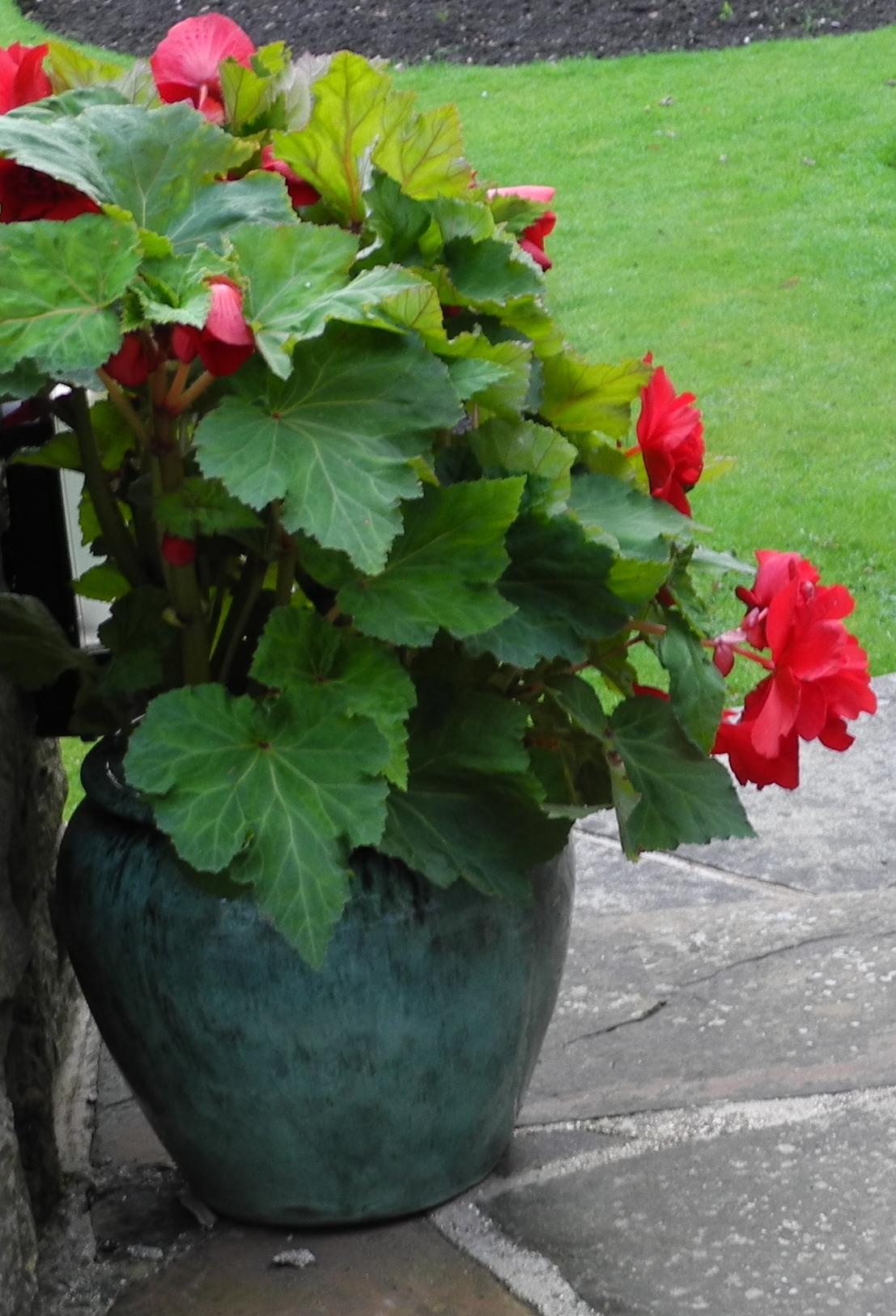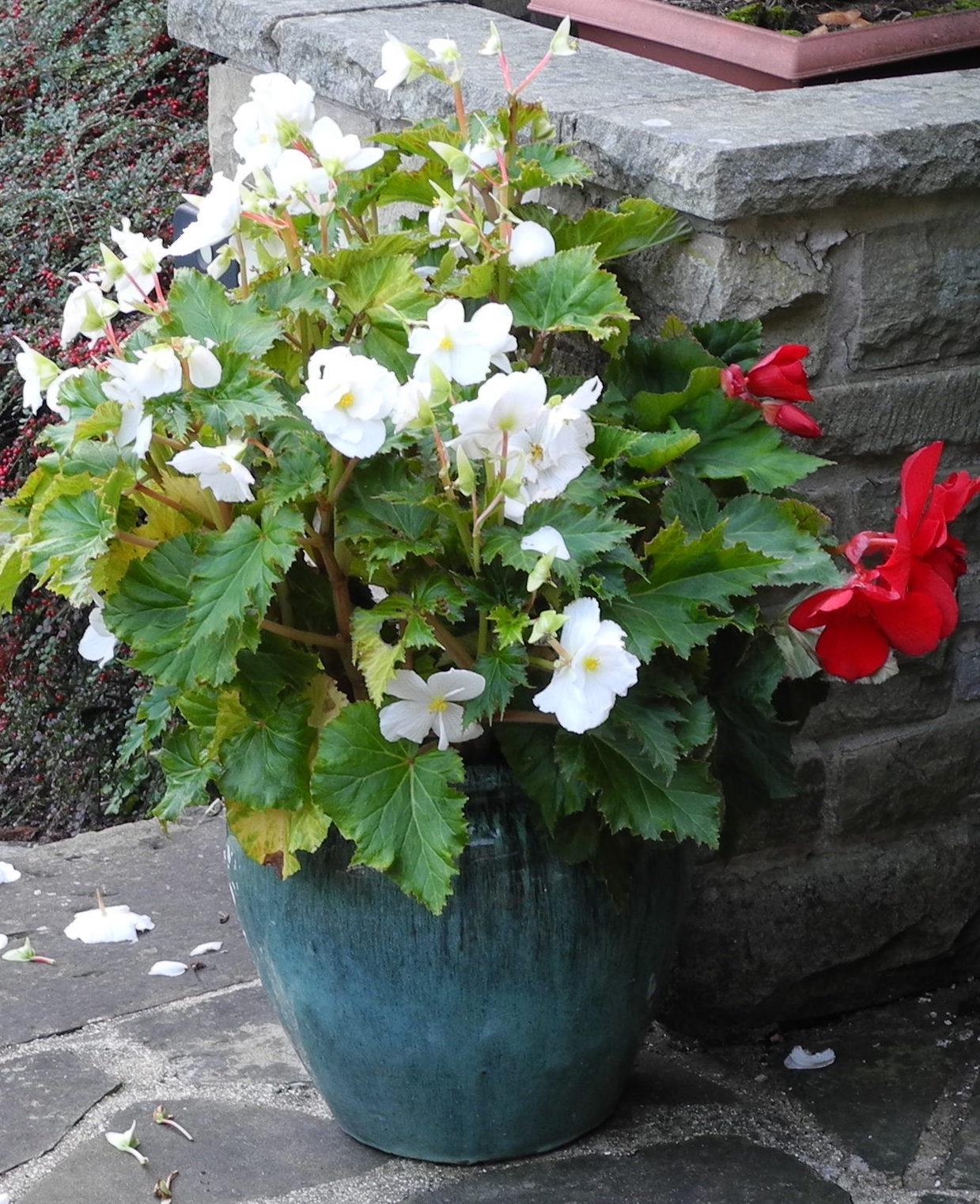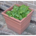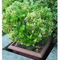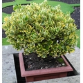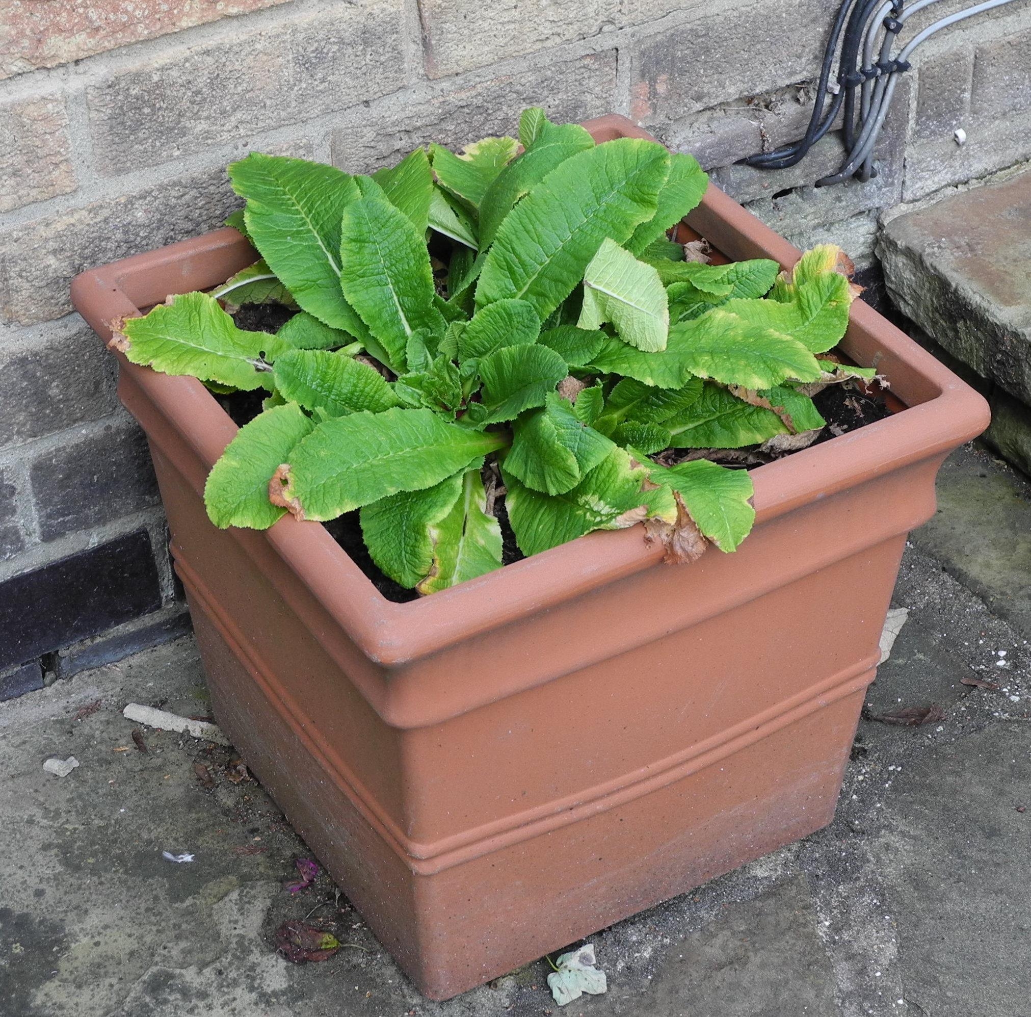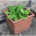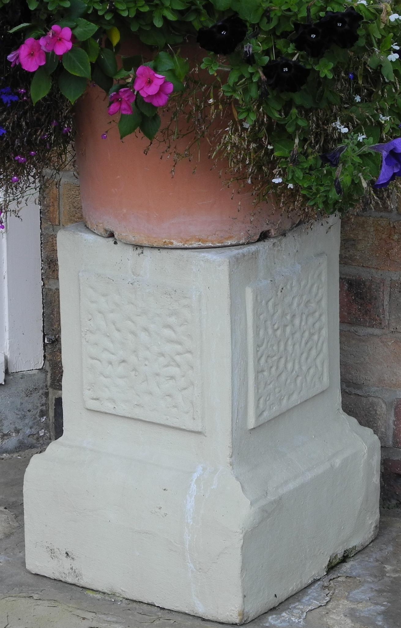 Garden planters, rustic base; two shrubs, etc