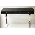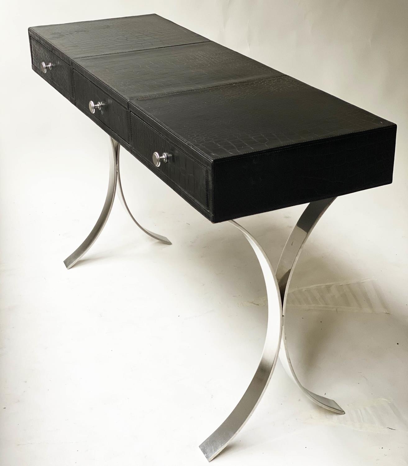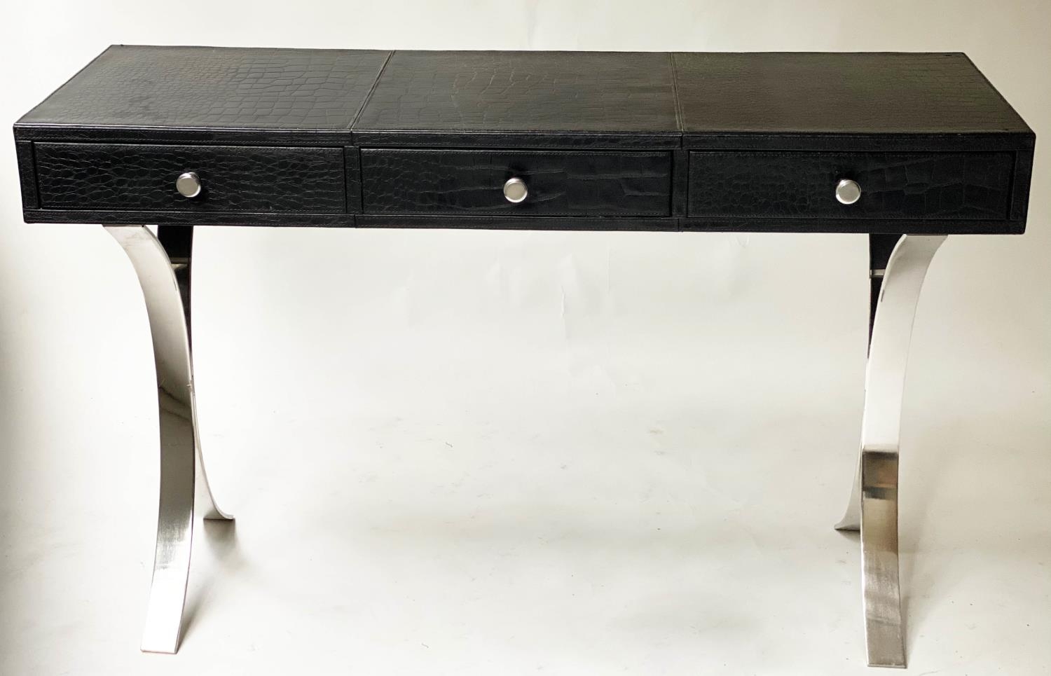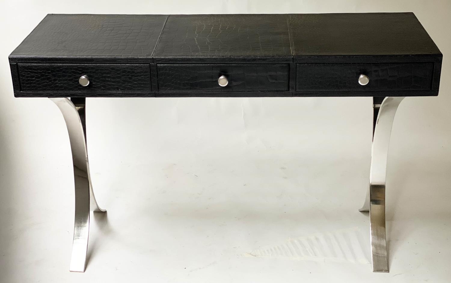 WRITING TABLE, 120cm W x 40cm D x 76cm H, faux crocodile black leather with three frieze drawers and x chrome supports.