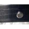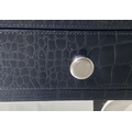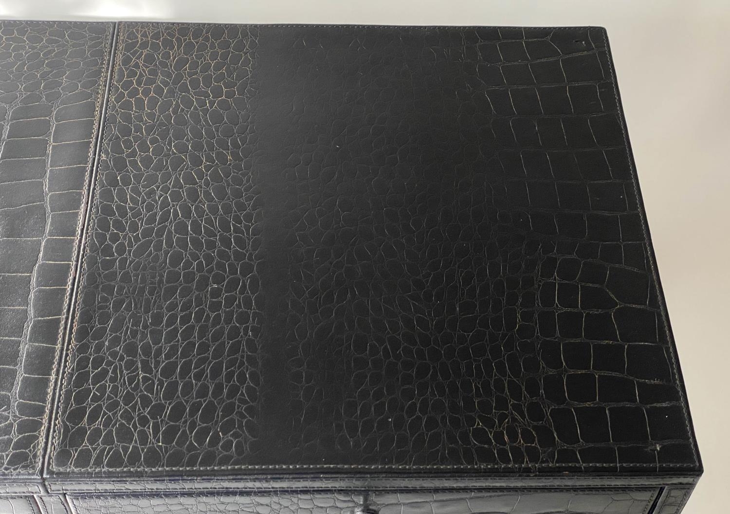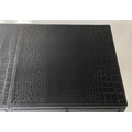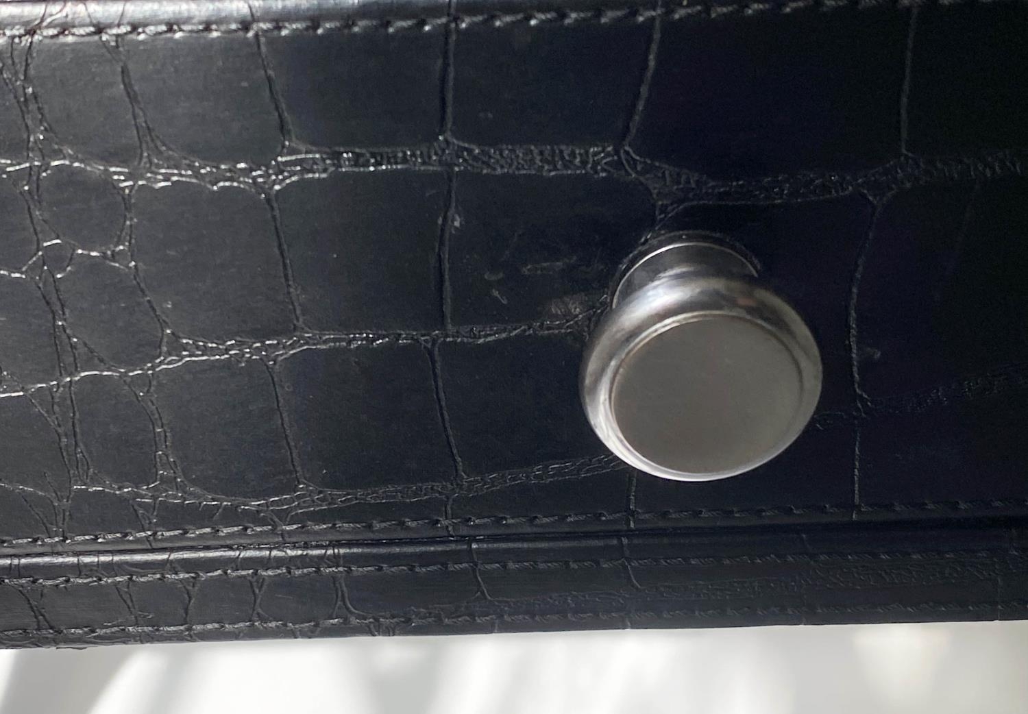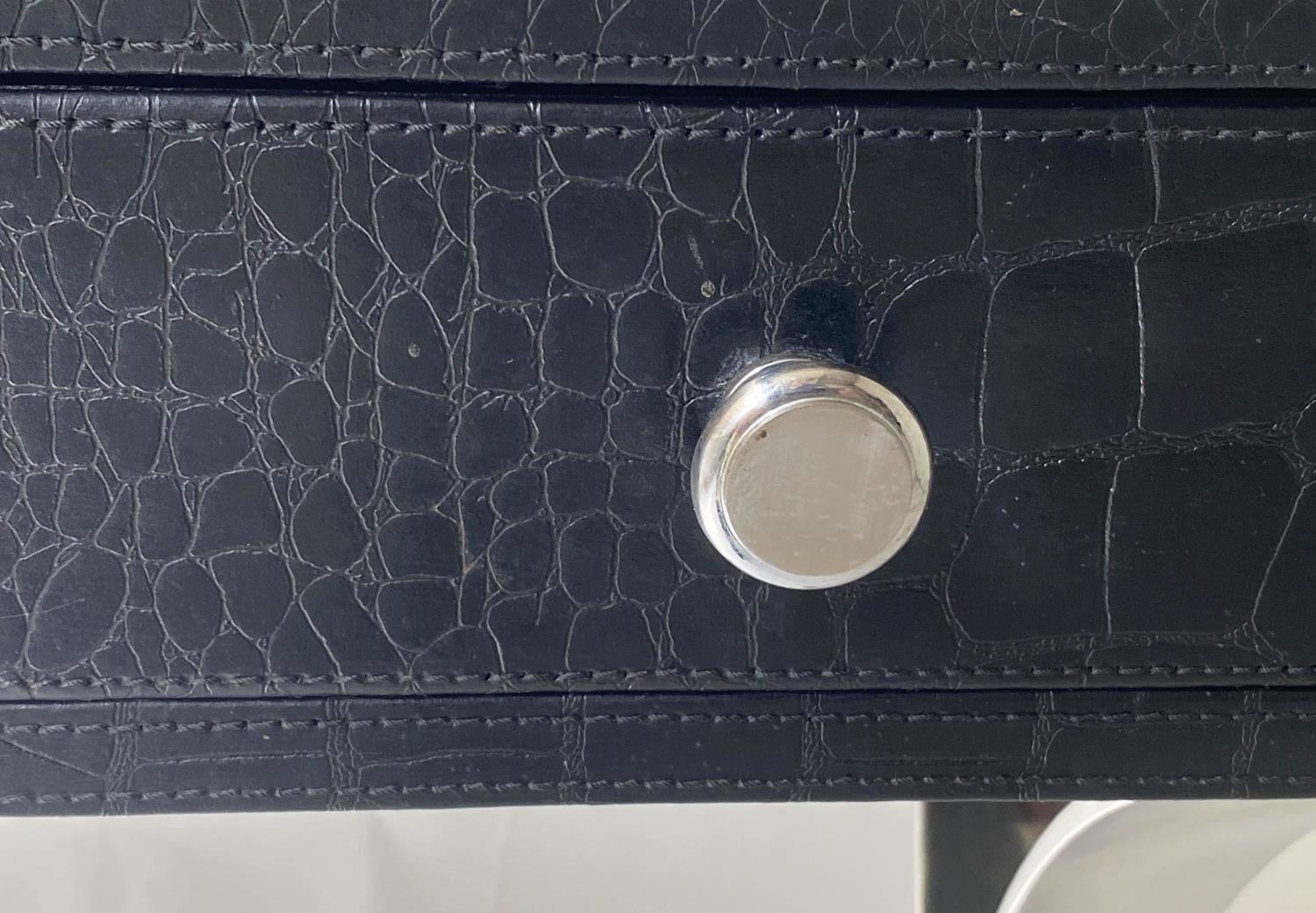 WRITING TABLE, 120cm W x 40cm D x 76cm H, faux crocodile black leather with three frieze drawers and x chrome supports.