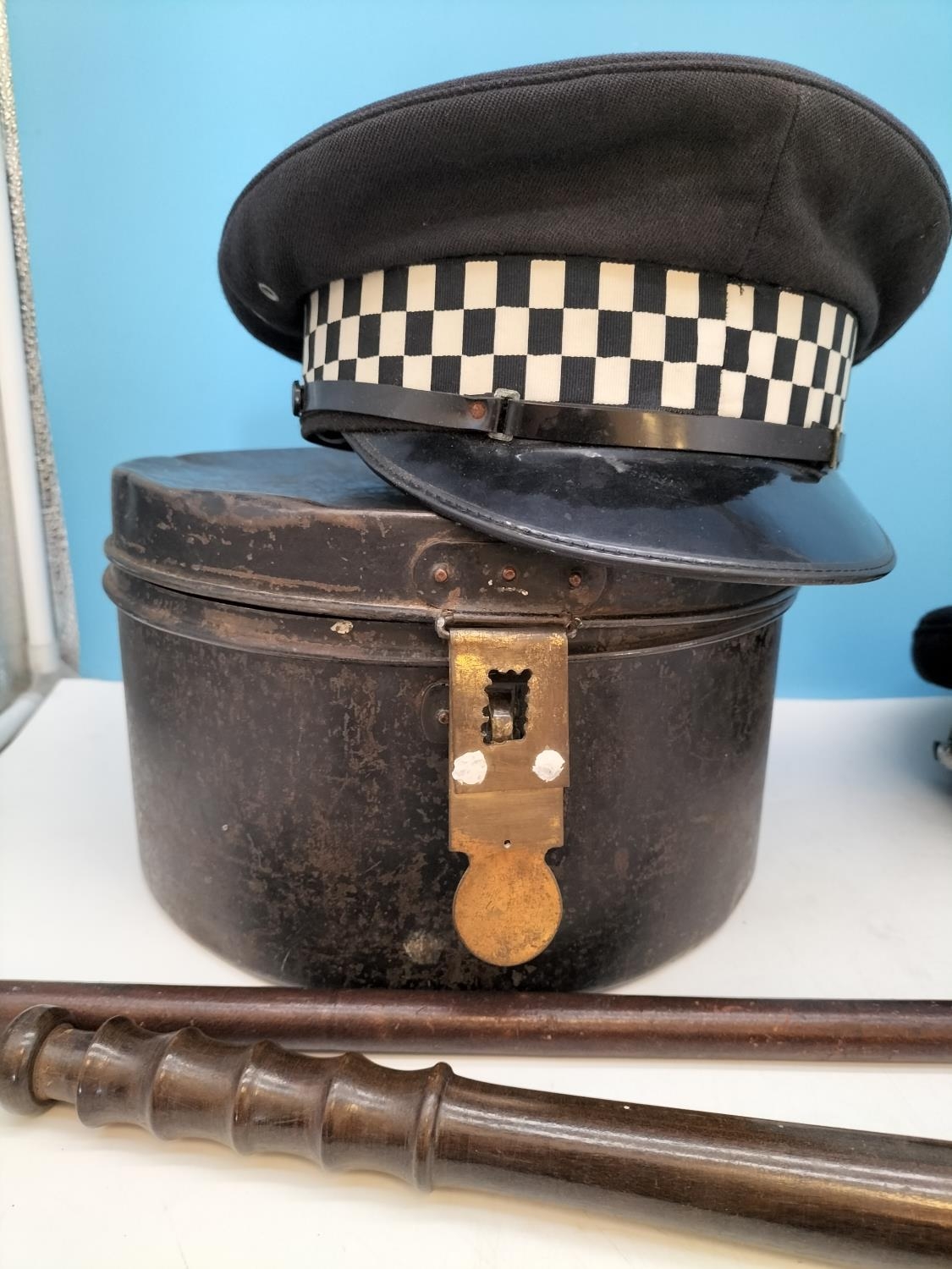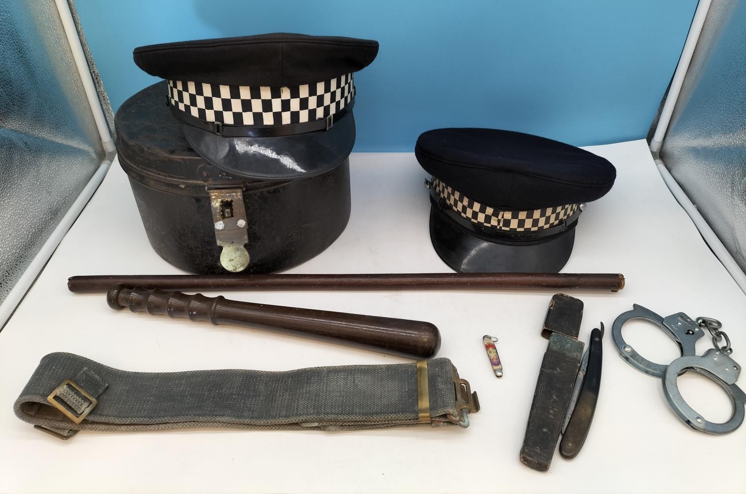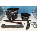 Metal Hat Case, Coronation Pen Knife, Cut Throat Razor, Truncheon, Police Hats, Handcuffs, Leather Covered Swagger Stick (A/F).
