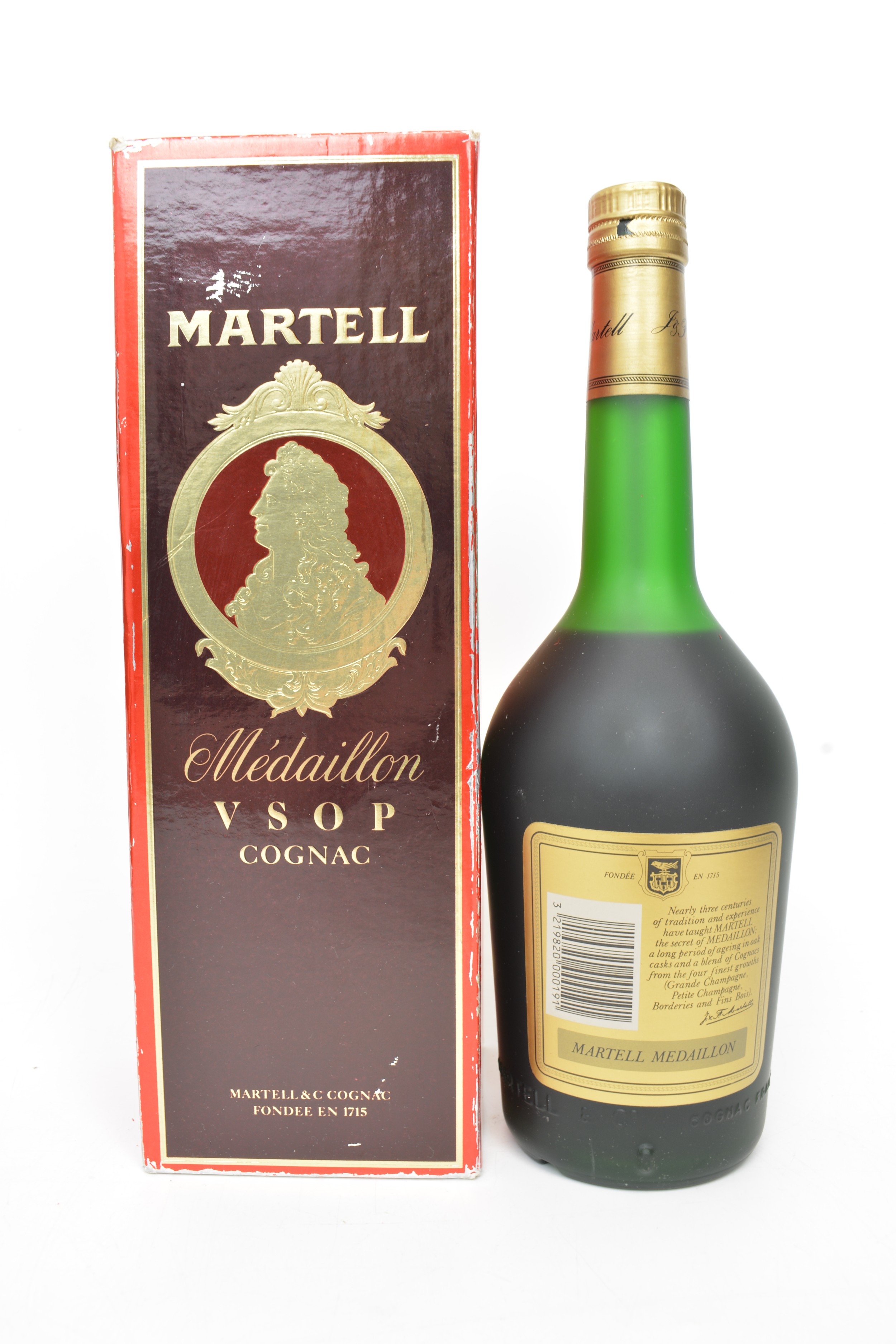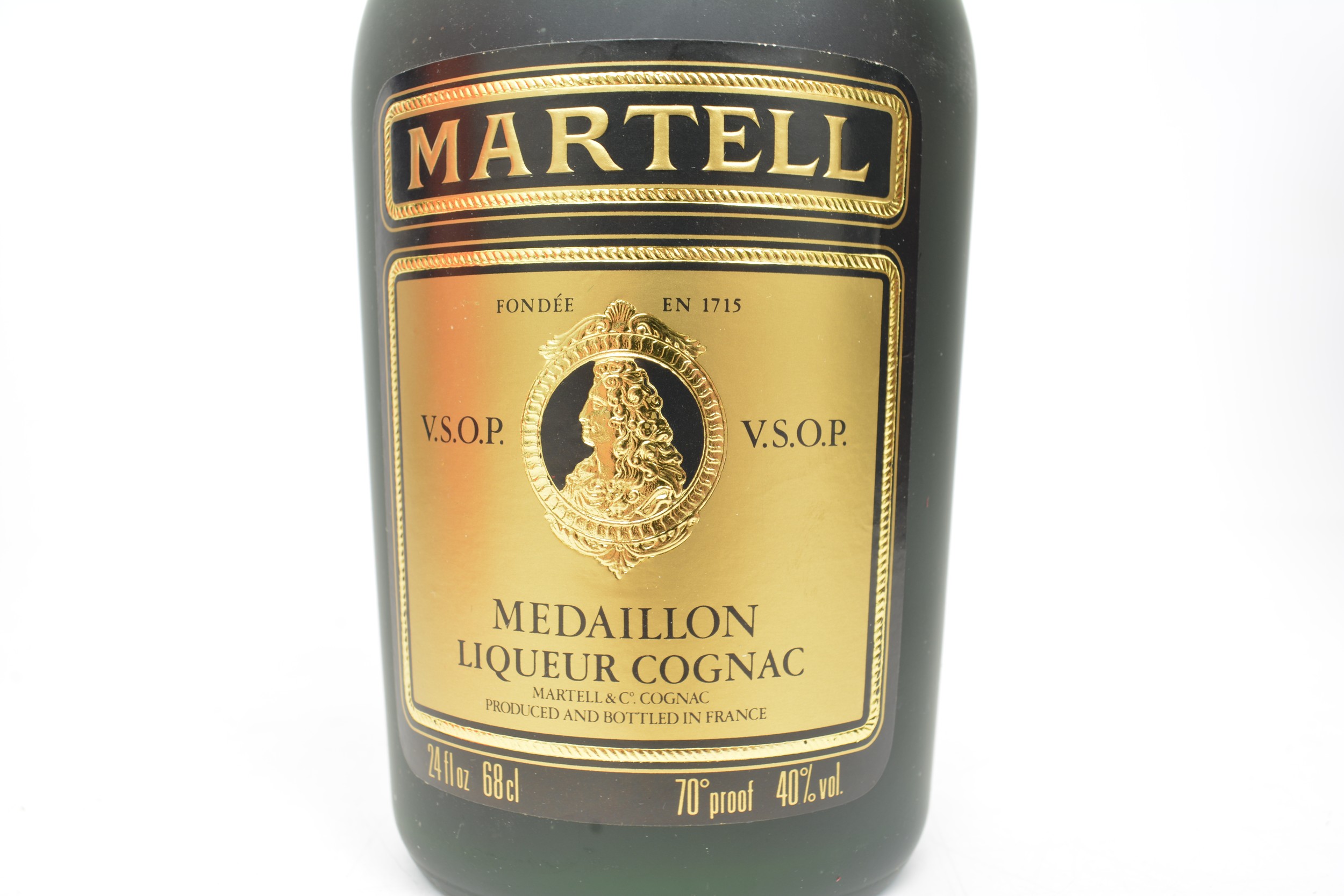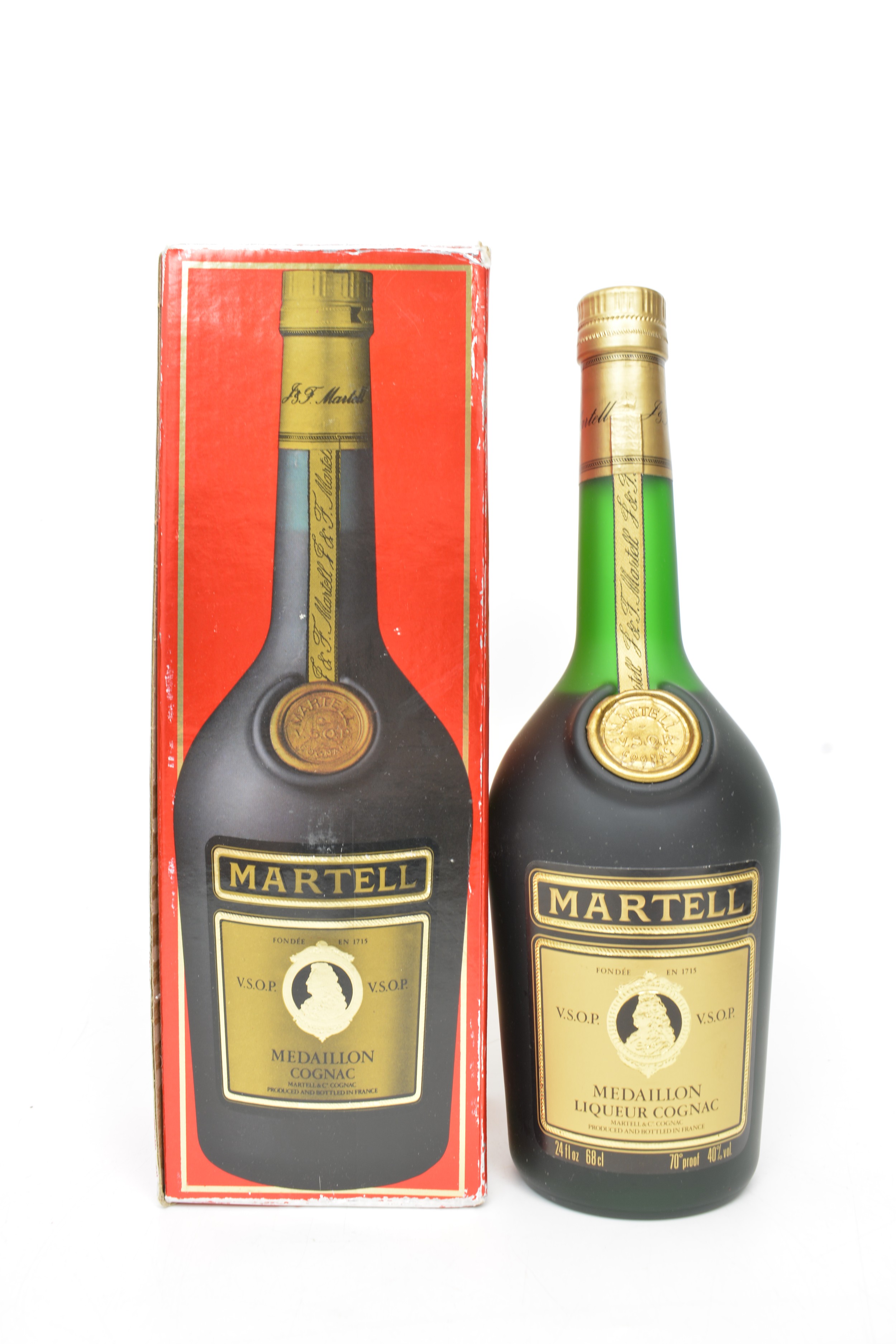 One boxed bt MARTELL Medaillon Liqueur VSOP Cognac,24 fl ozs,70 Proof 1970s.