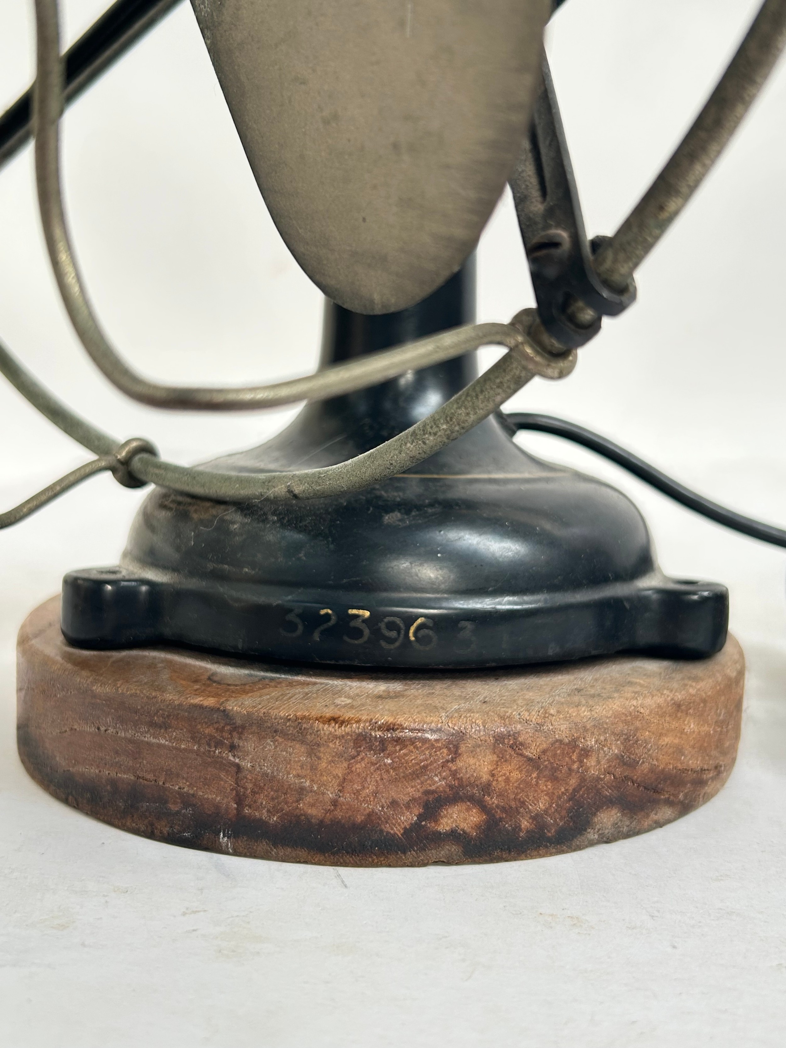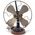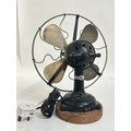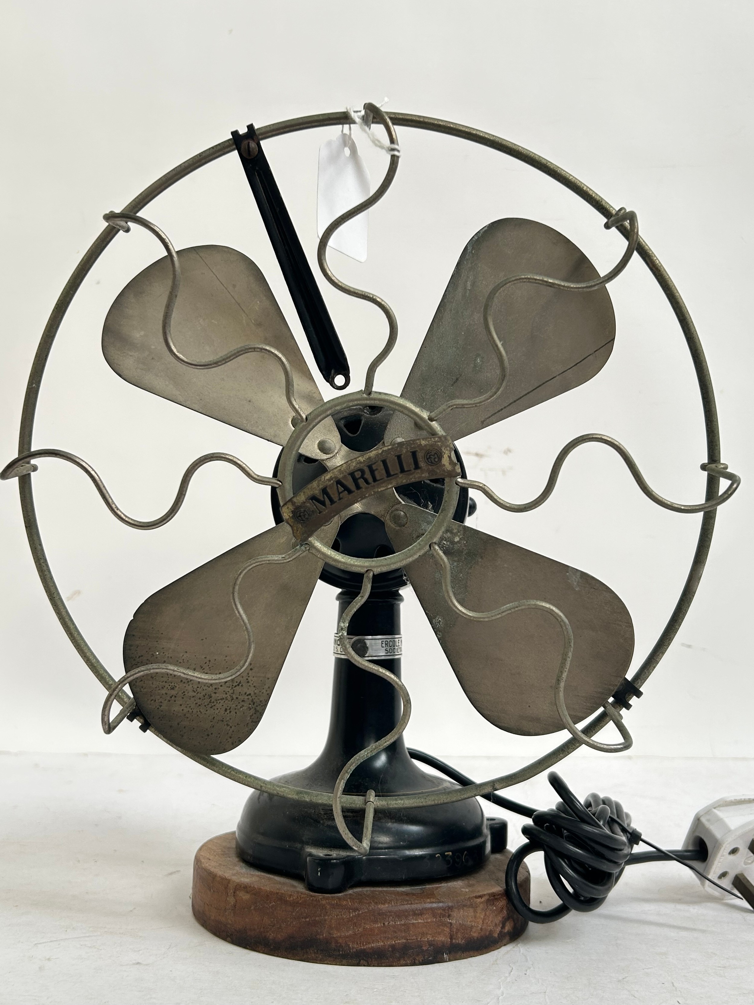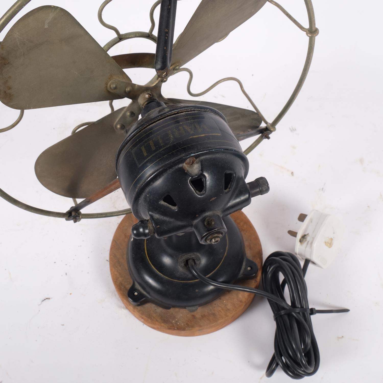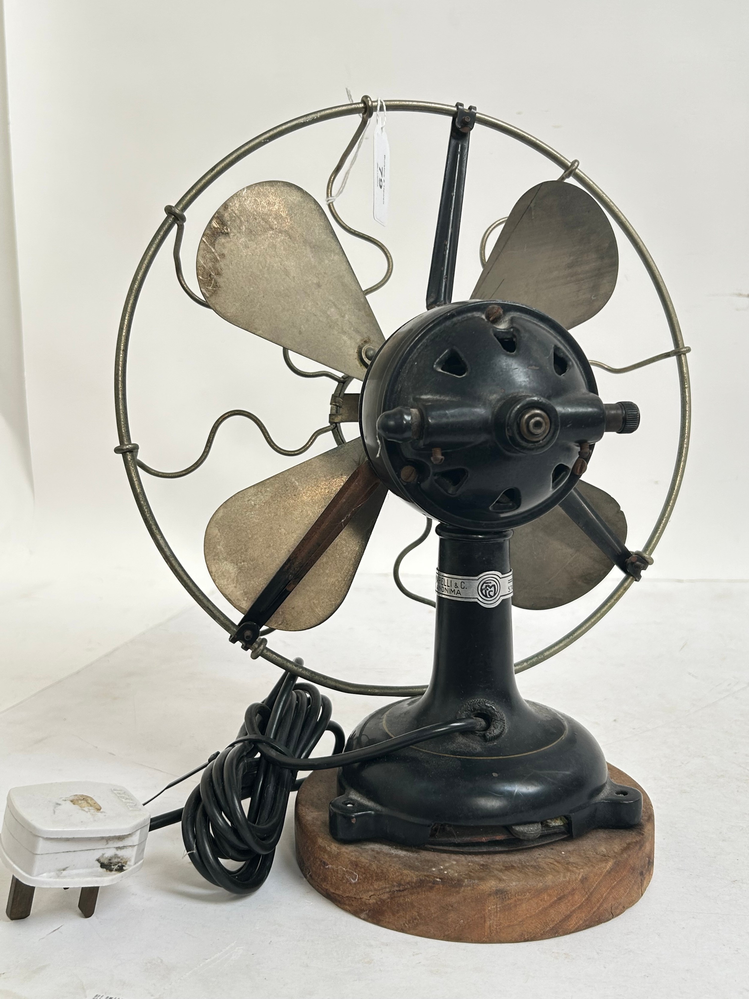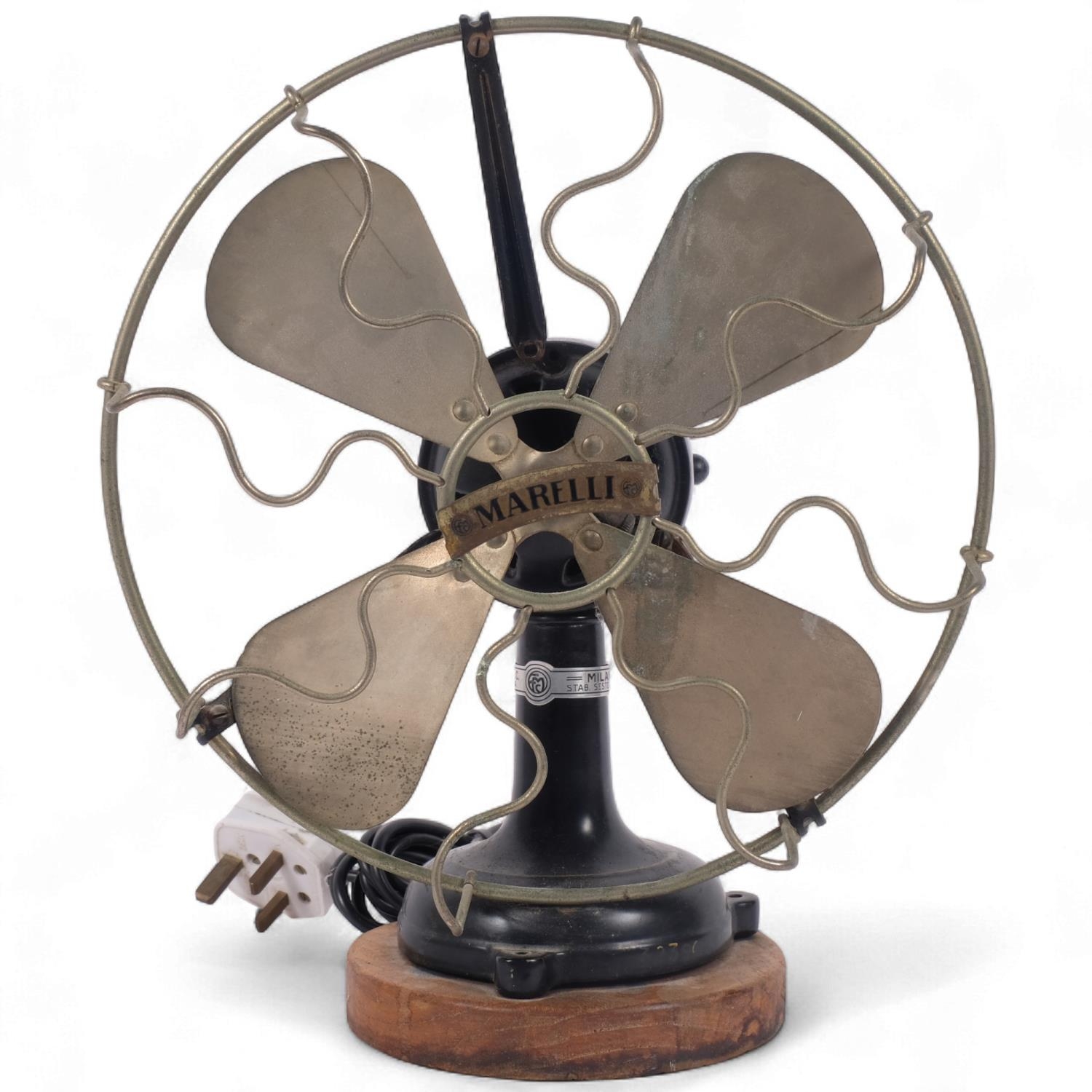 A Vintage Italian "Marelli" desk fan, numbered 3239631, on later turned wood stand, H34cm