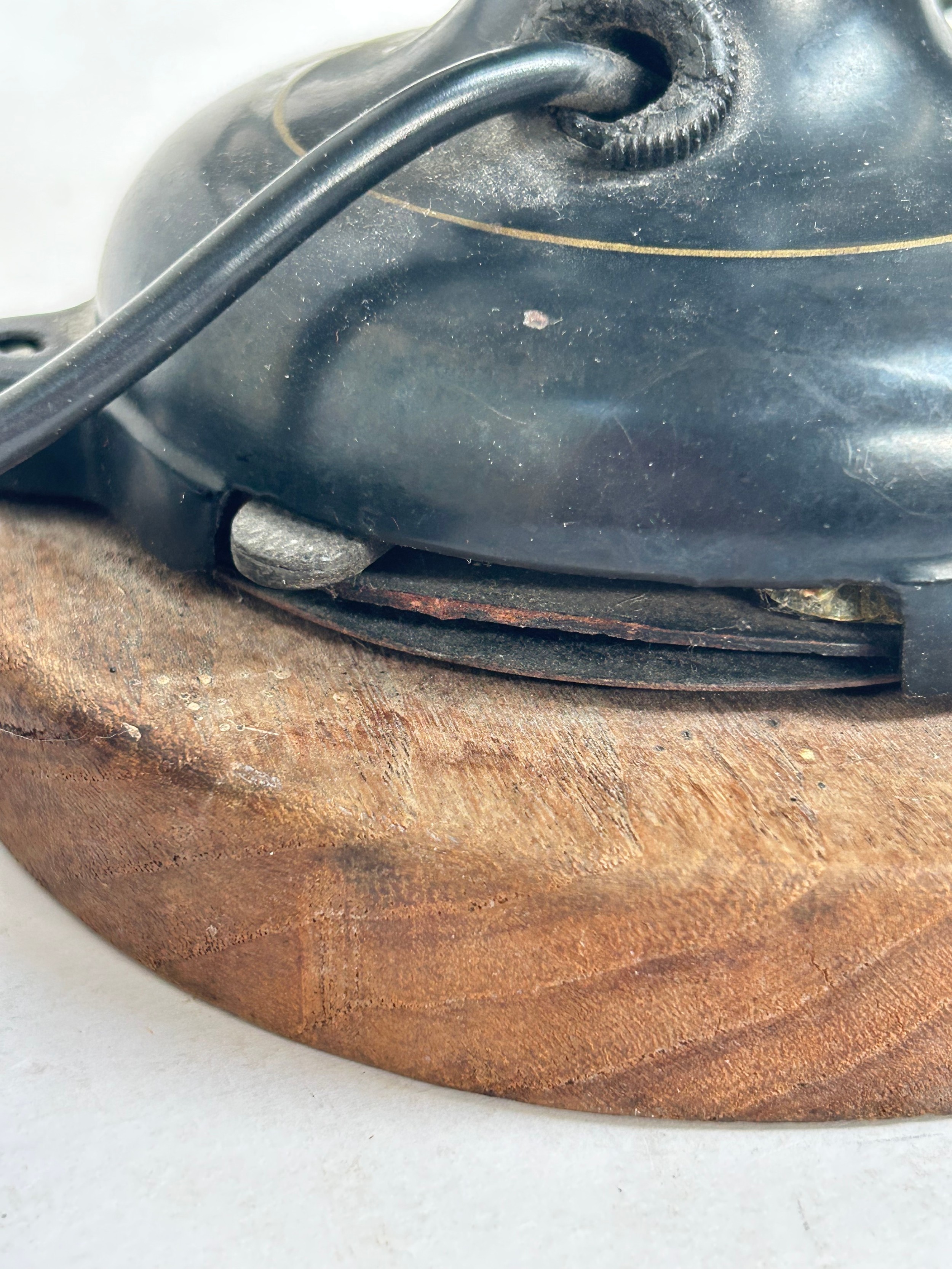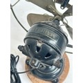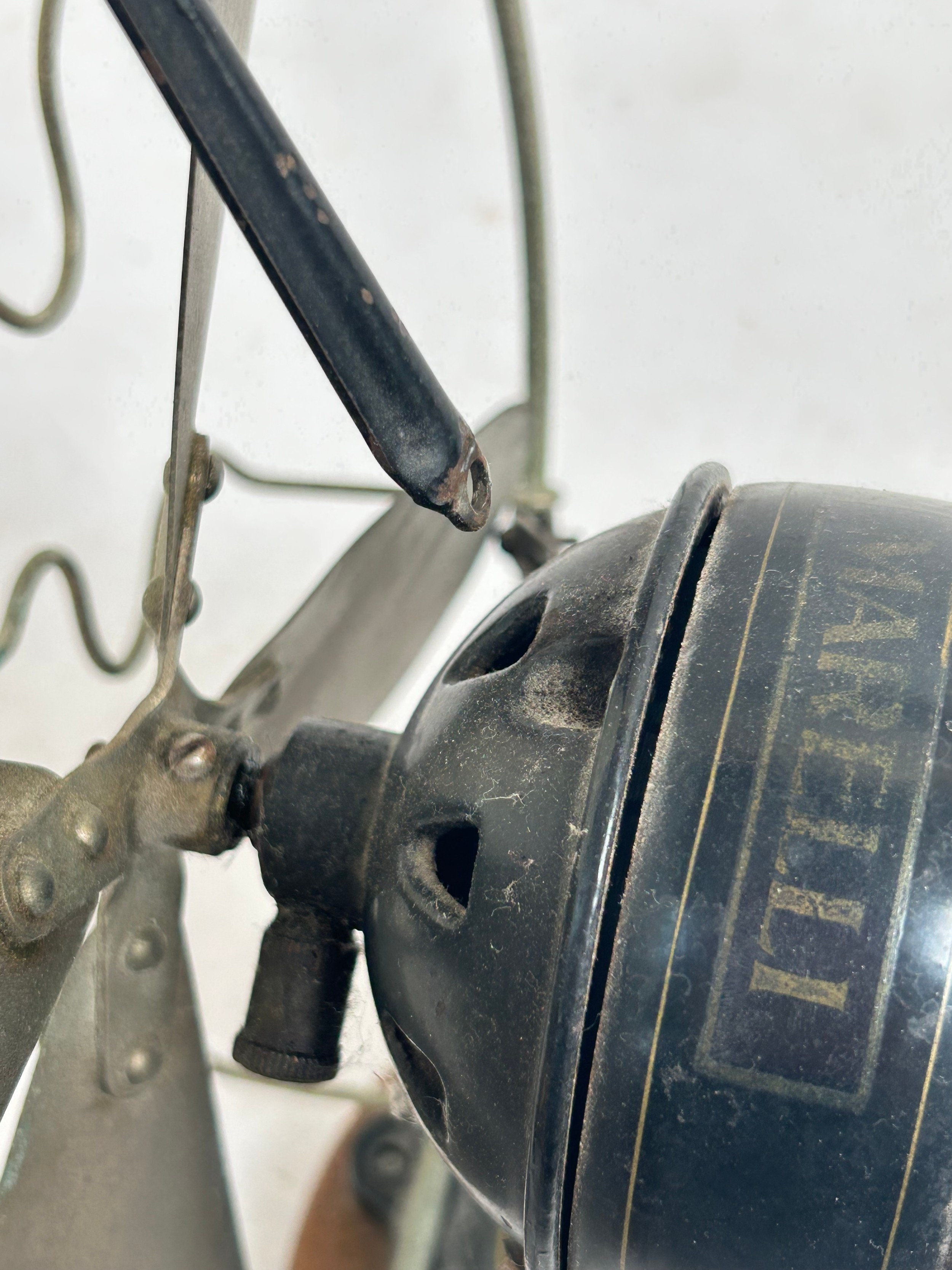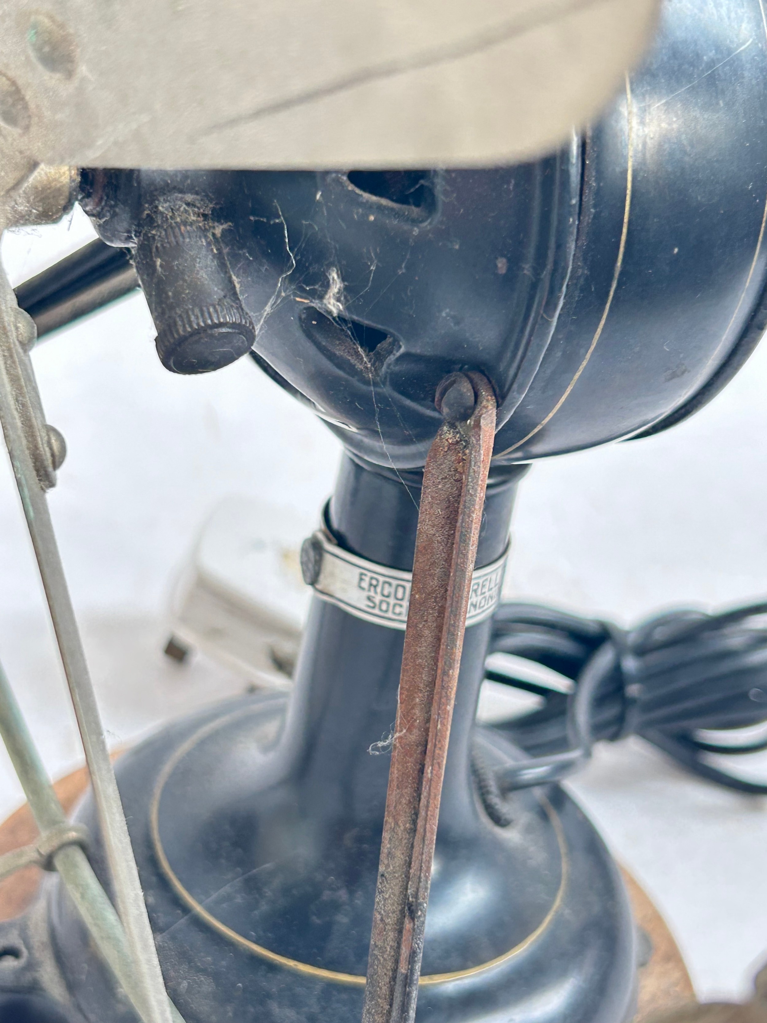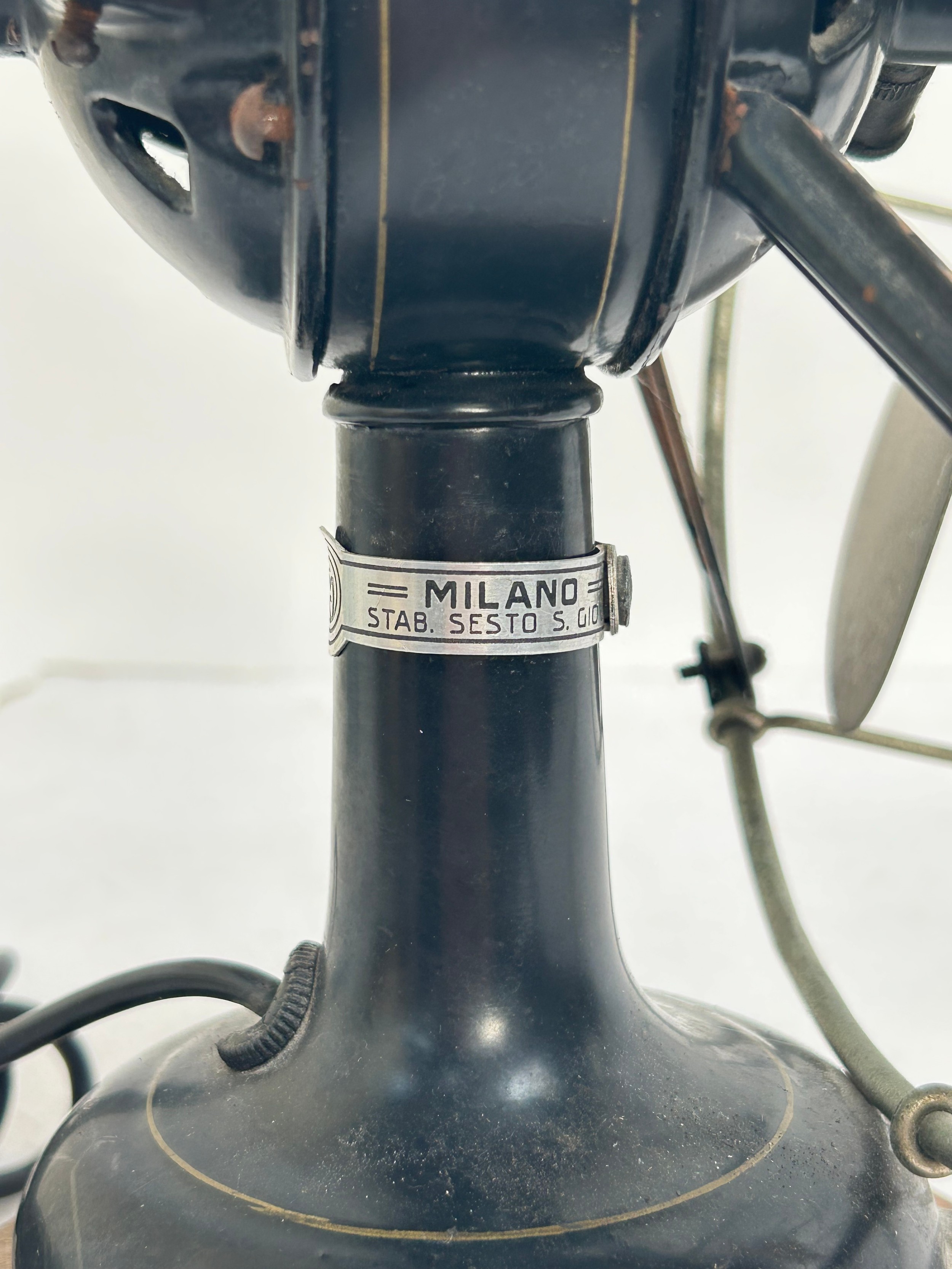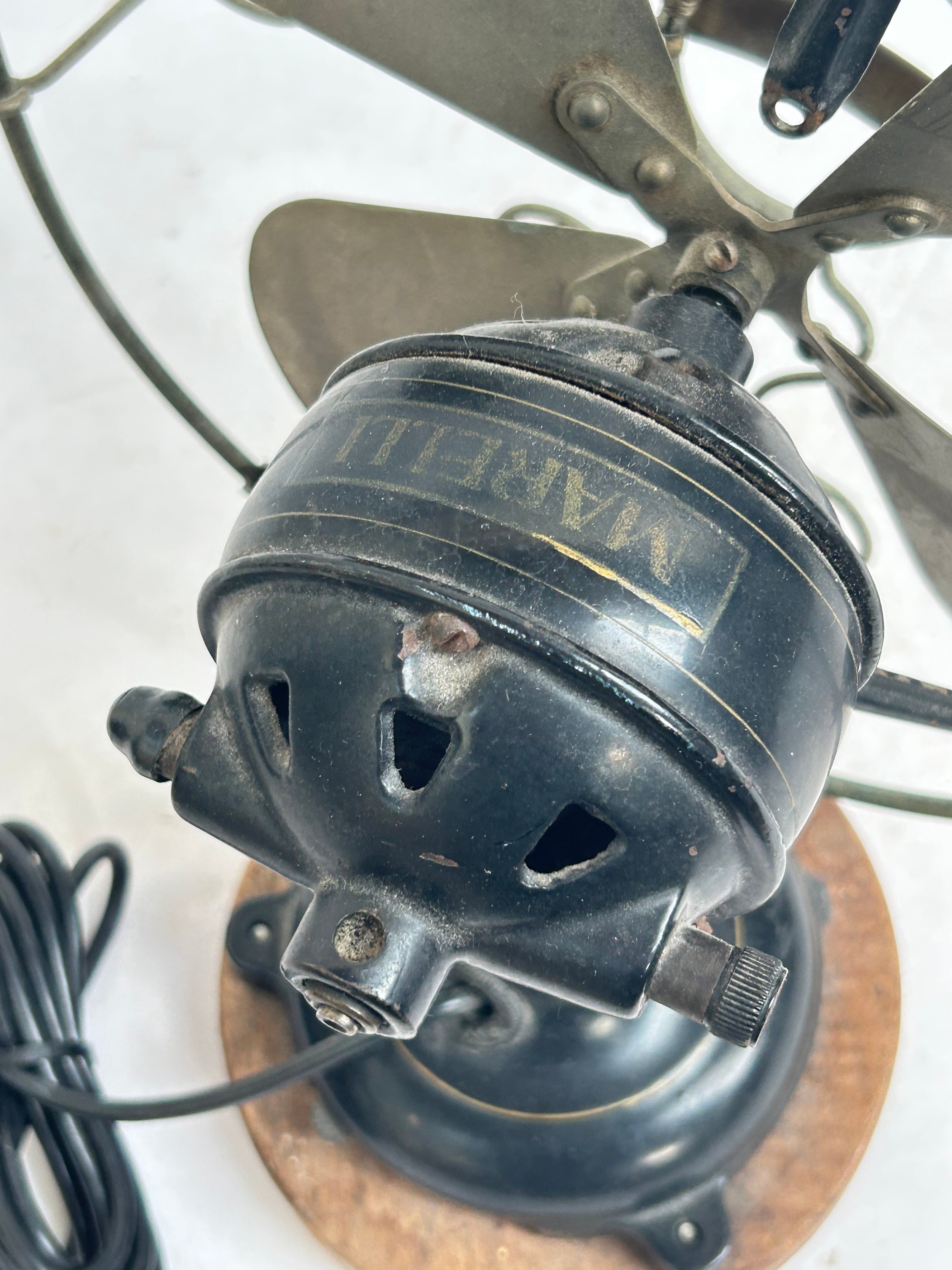 A Vintage Italian "Marelli" desk fan, numbered 3239631, on later turned wood stand, H34cm
