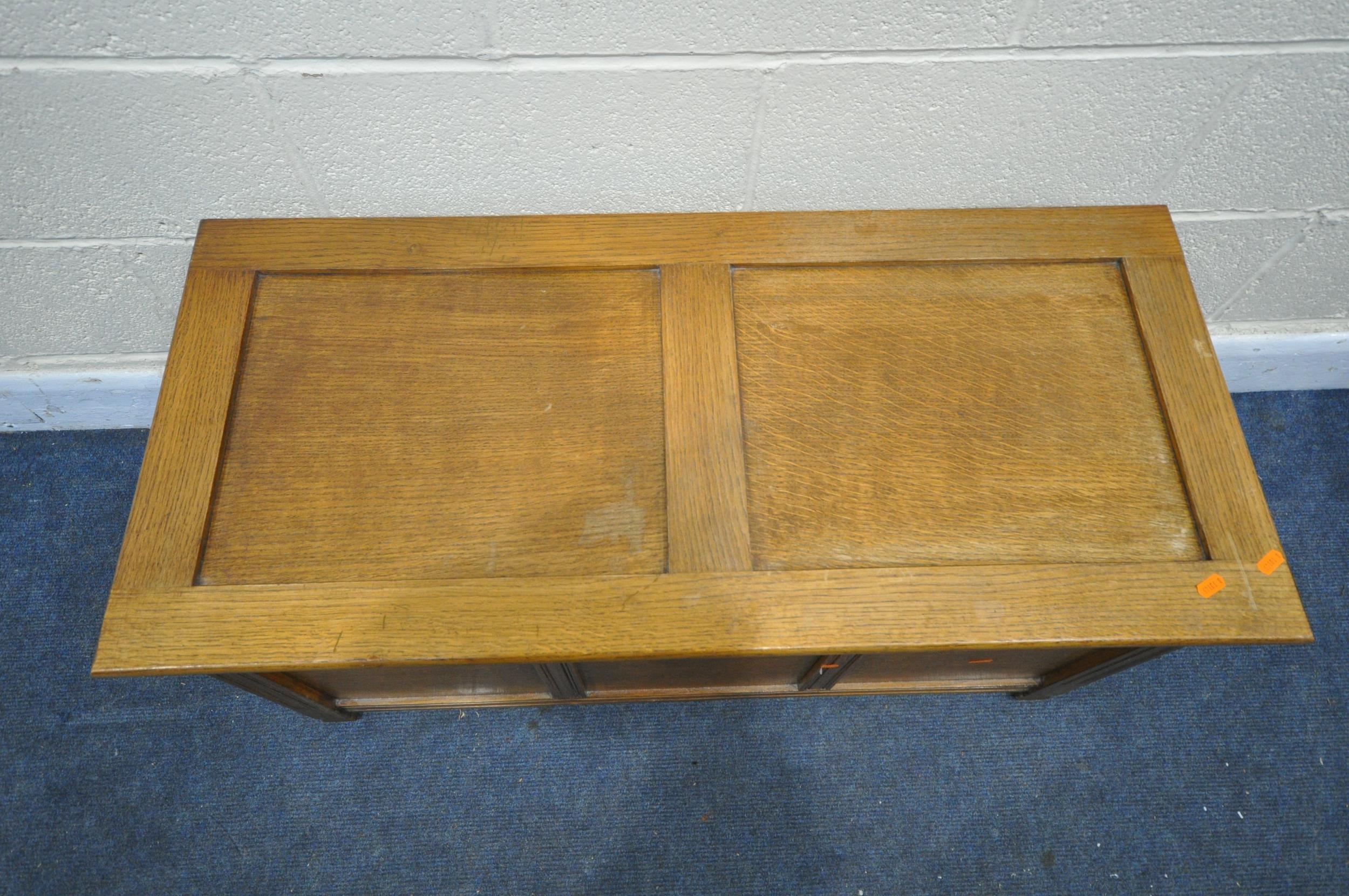 A MODERN PINE PANNELED BLANKET BOX, with a hinged lid, width 97cm x depth 45cm x height 47cm (condition - slight discolouration)