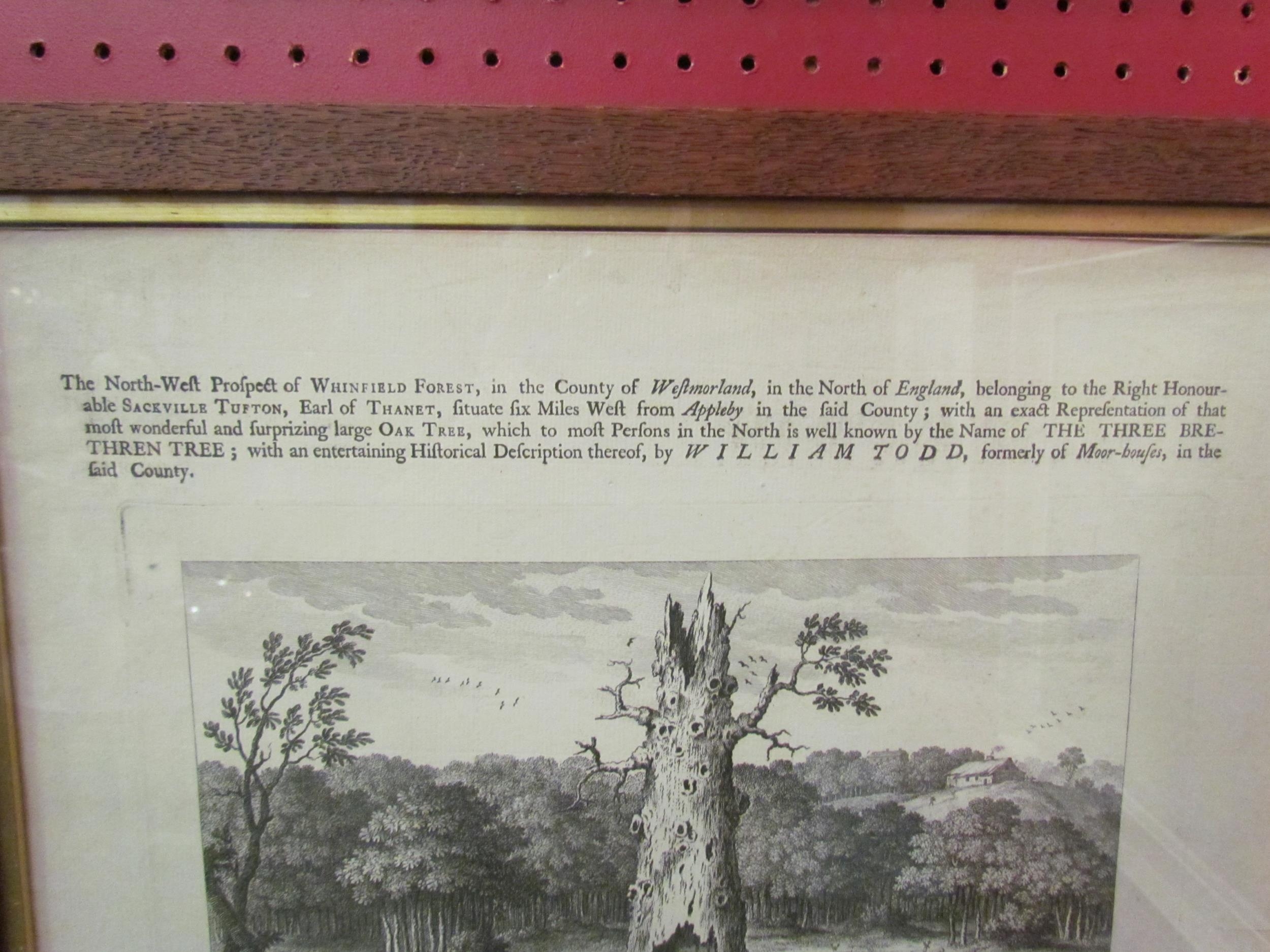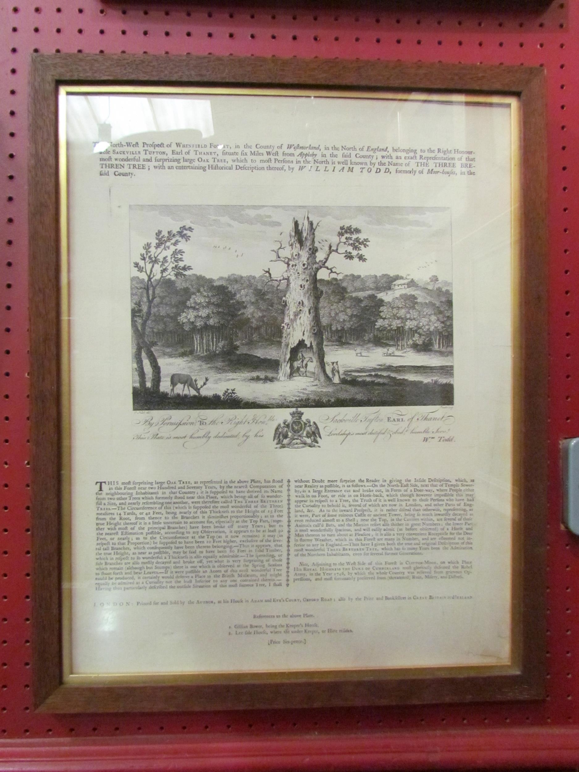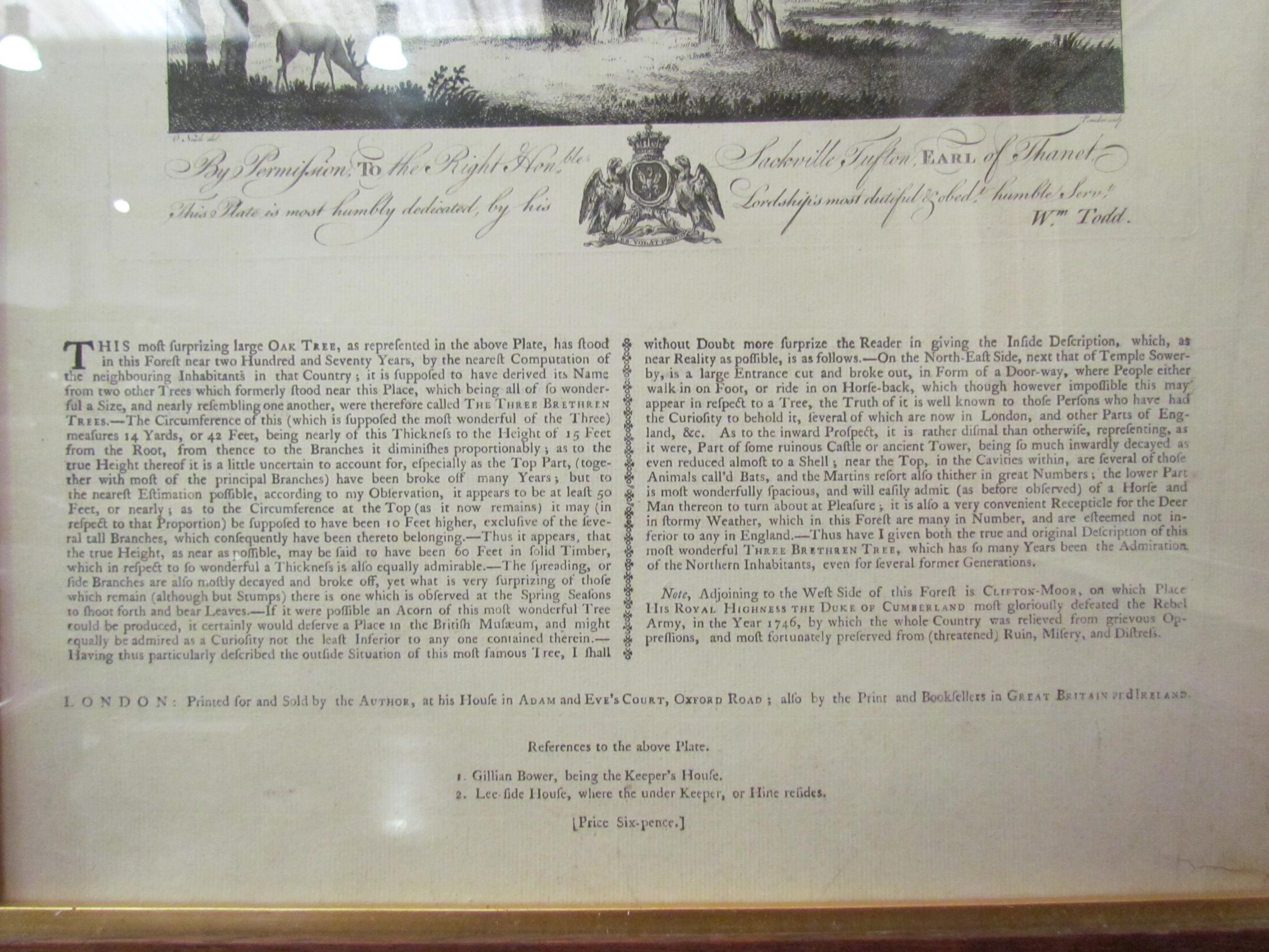 A 19th Century reproduction of an earlier engraving of "The Three Brethren Tree" with an entertaining historial description, primed and sold by William Todd at his house in Adam & Eve's Court, framed and glazed with gilt slips, 54cm x 43cm total (R) £0